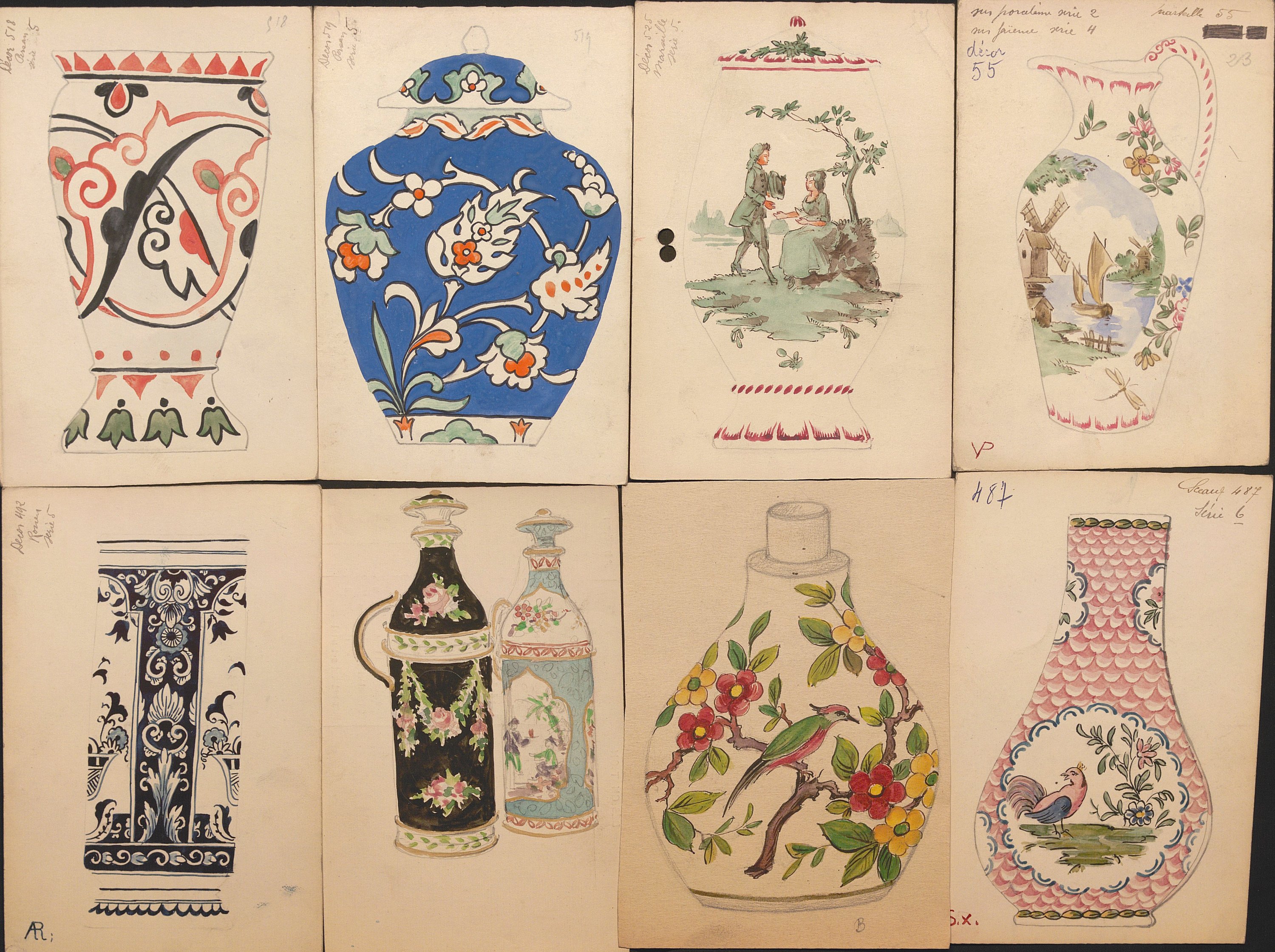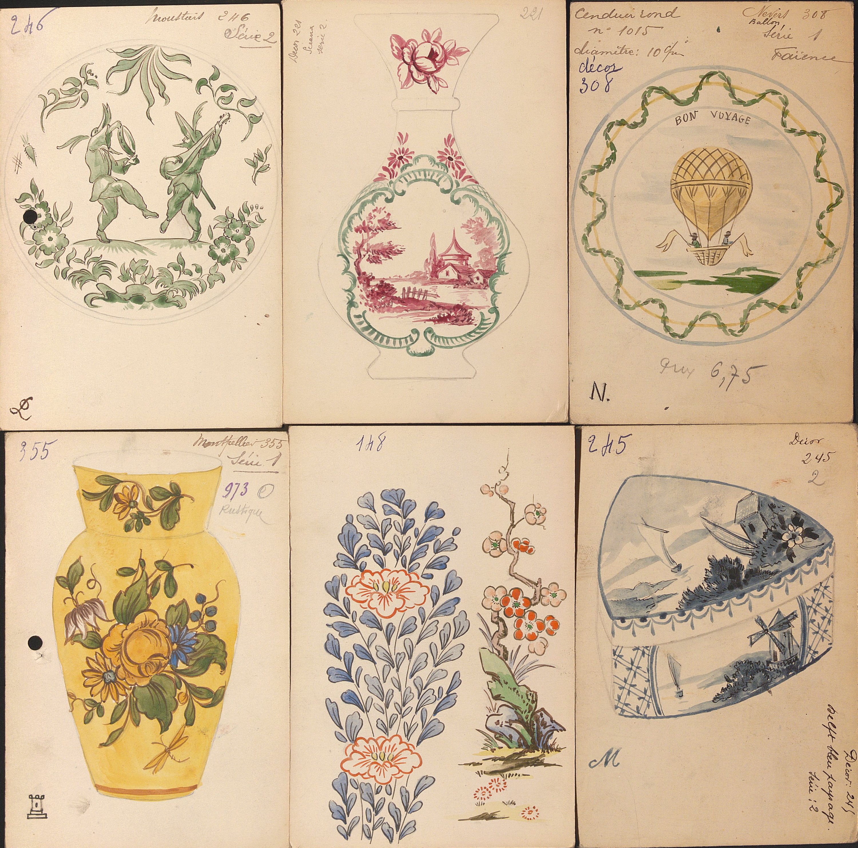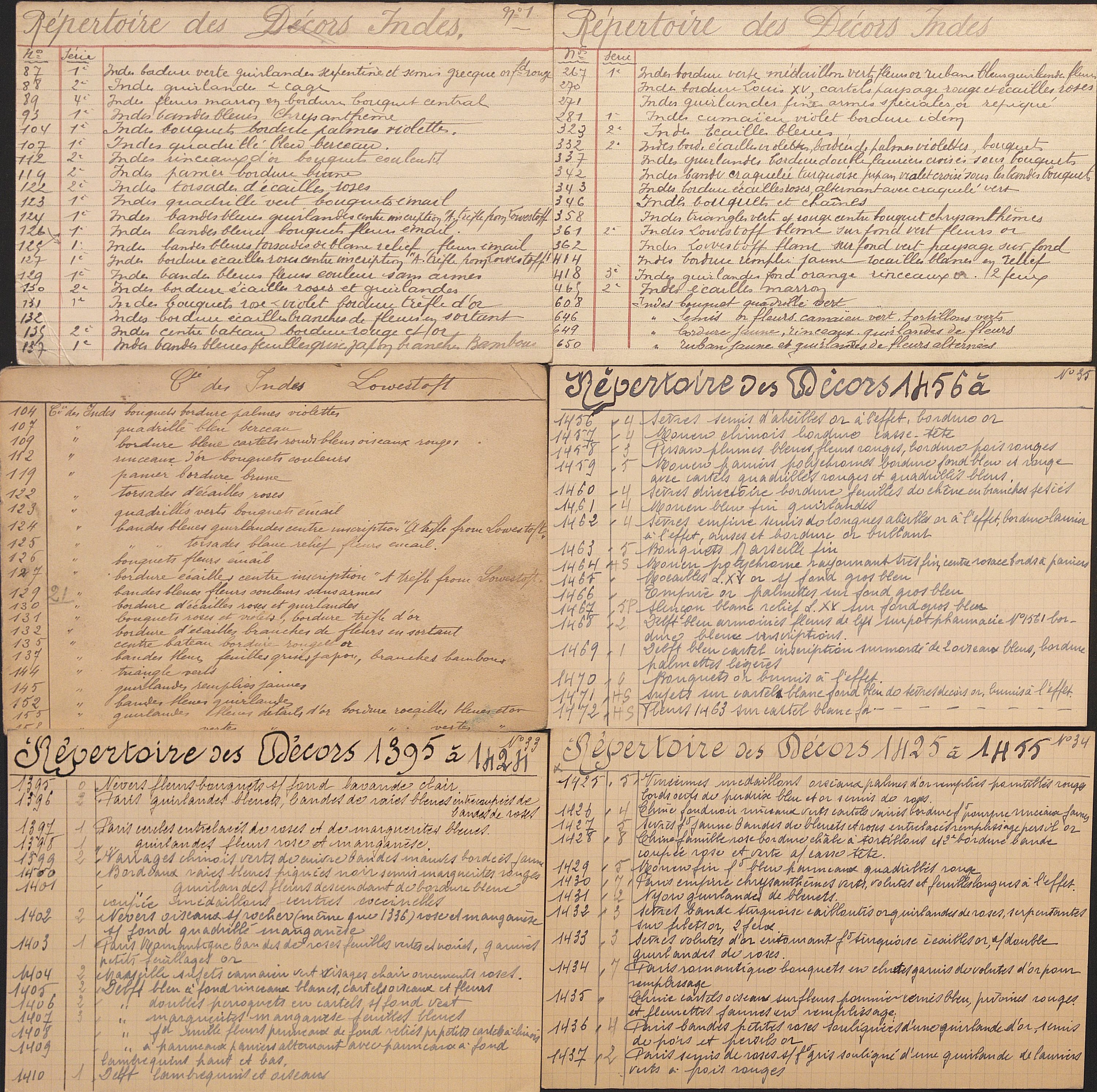 env. 685 fiches répertoriant ou référençant les décors dessinés à l’encre et aquarelle inspirés des décors traditionnels des productions anciennes de Chine, Japon, Perse, Sèvres, Saxe, Delft, Moustiers, Rouen, Chantilly, Nevers, Saint Cloud, Saint Omer, Marseille, Urbino, etc ;