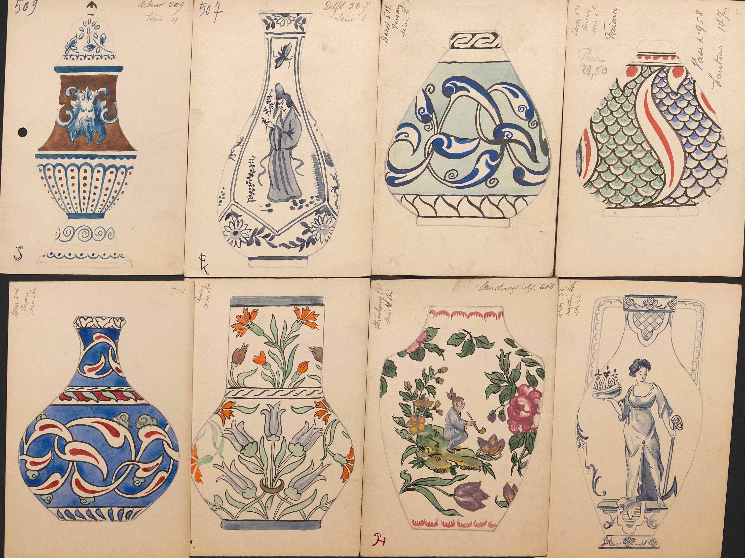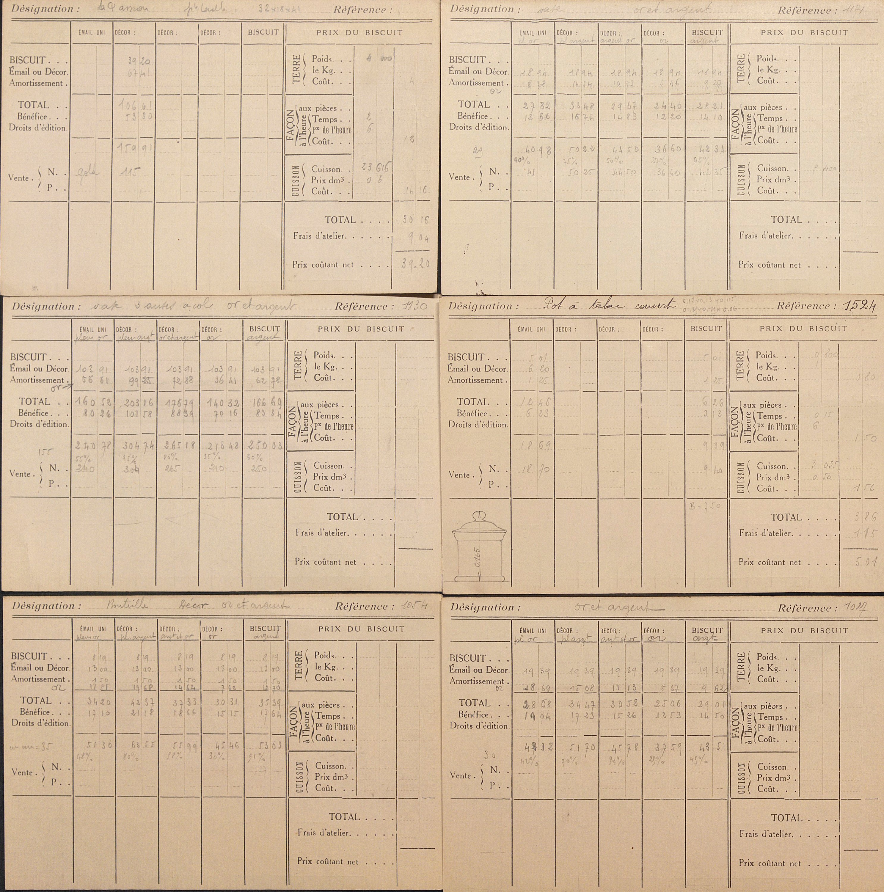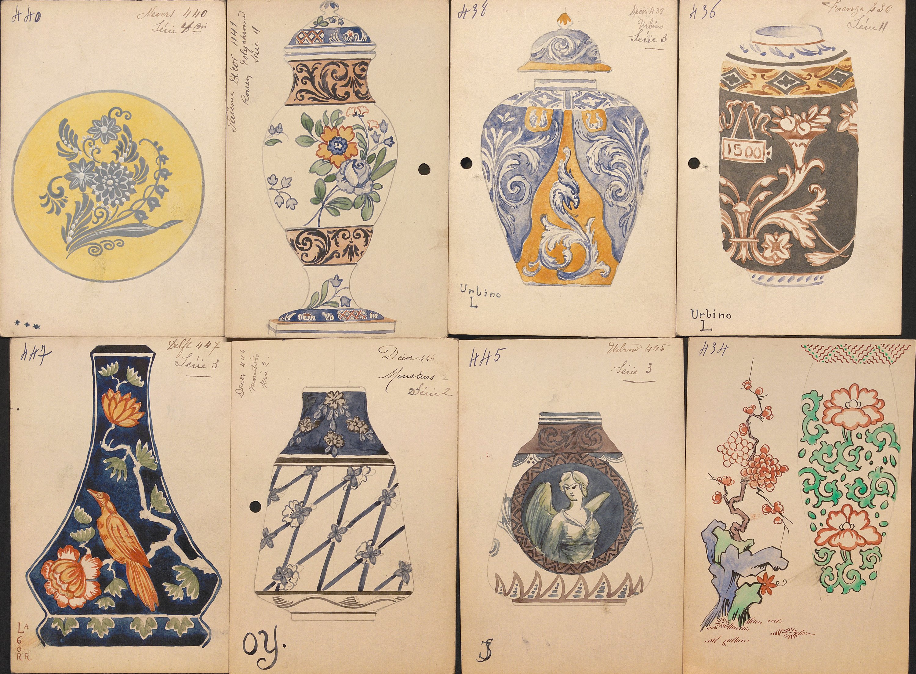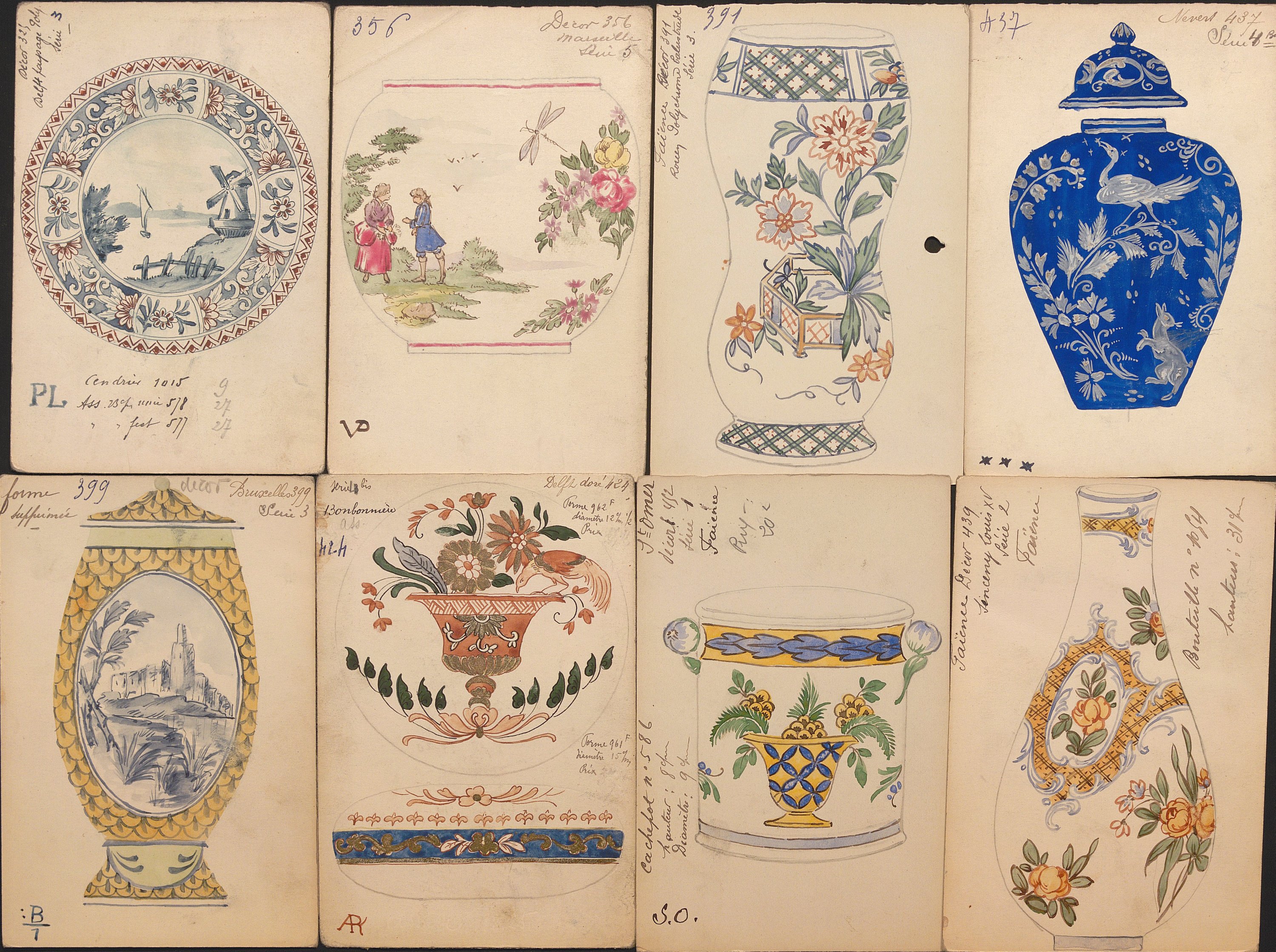 env. 685 fiches répertoriant ou référençant les décors dessinés à l’encre et aquarelle inspirés des décors traditionnels des productions anciennes de Chine, Japon, Perse, Sèvres, Saxe, Delft, Moustiers, Rouen, Chantilly, Nevers, Saint Cloud, Saint Omer, Marseille, Urbino, etc ;
