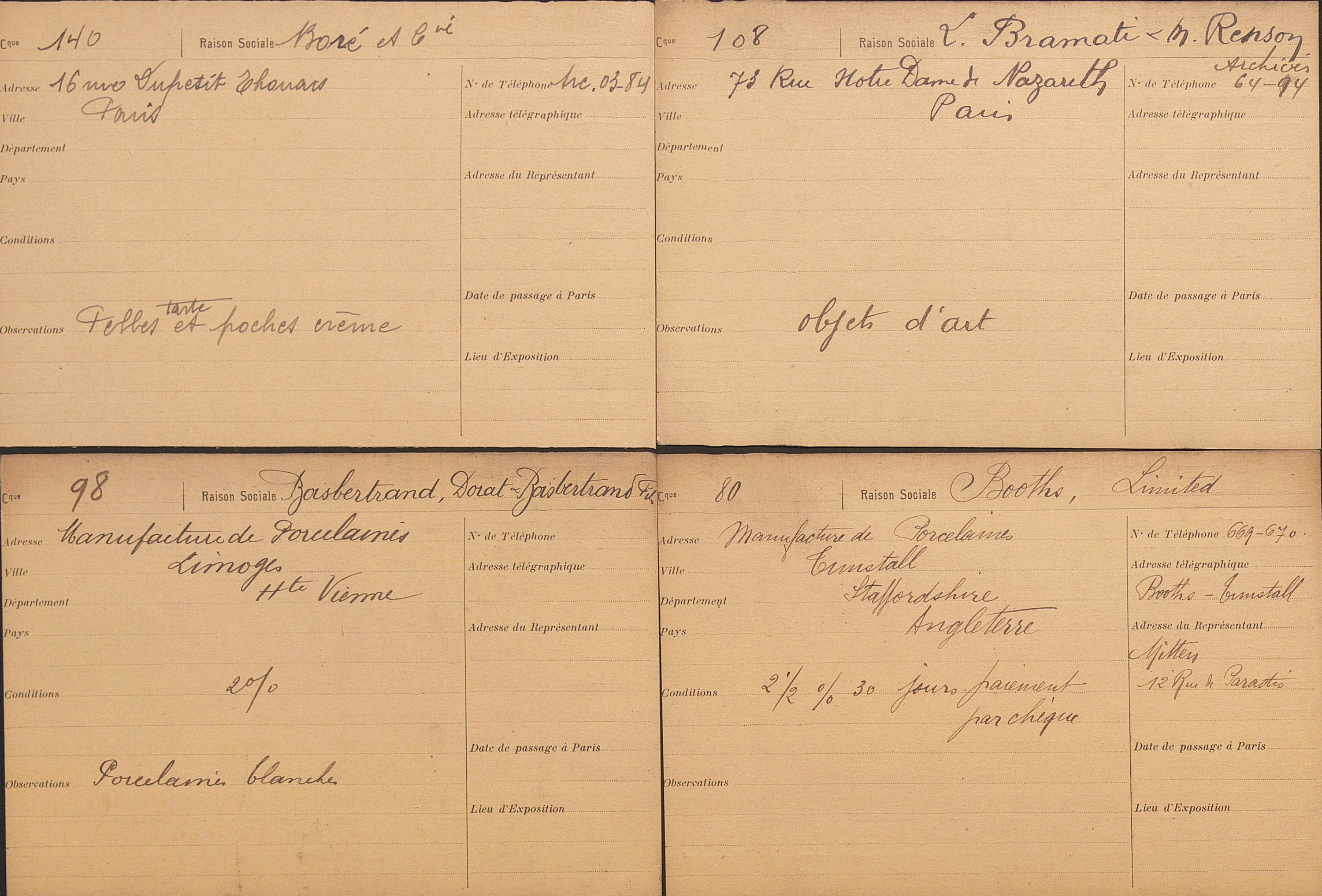 env. 170 fiches répertoriant les fournisseurs et les fabricants situés en France (Paris, Limoges, Rochecorbon, Malicorne, etc), Angleterre, Allemagne, etc.