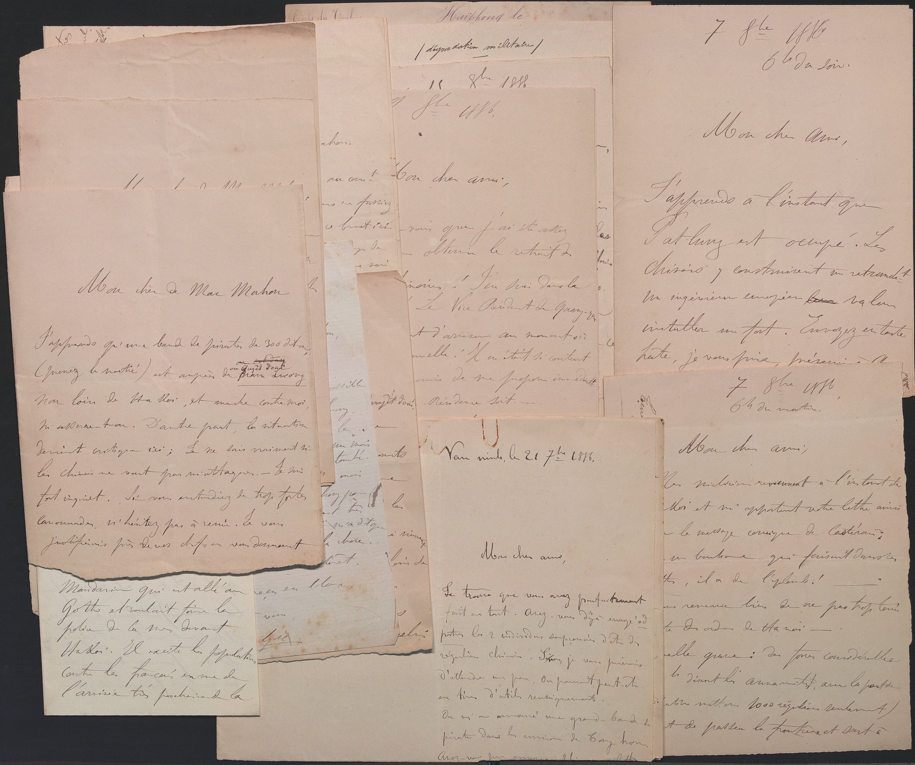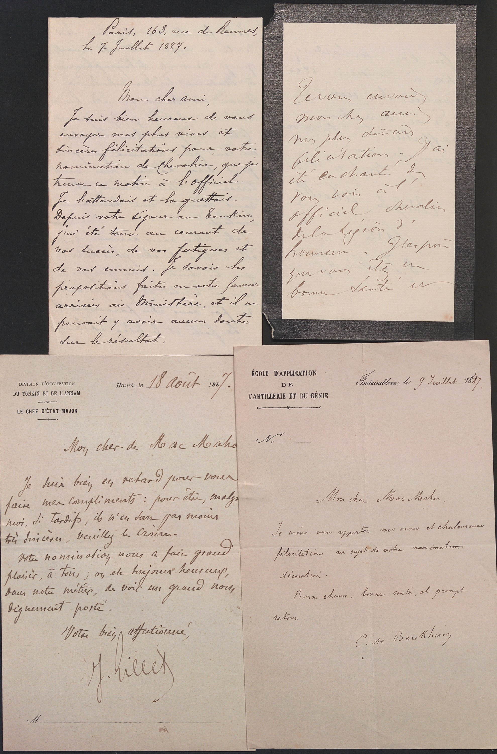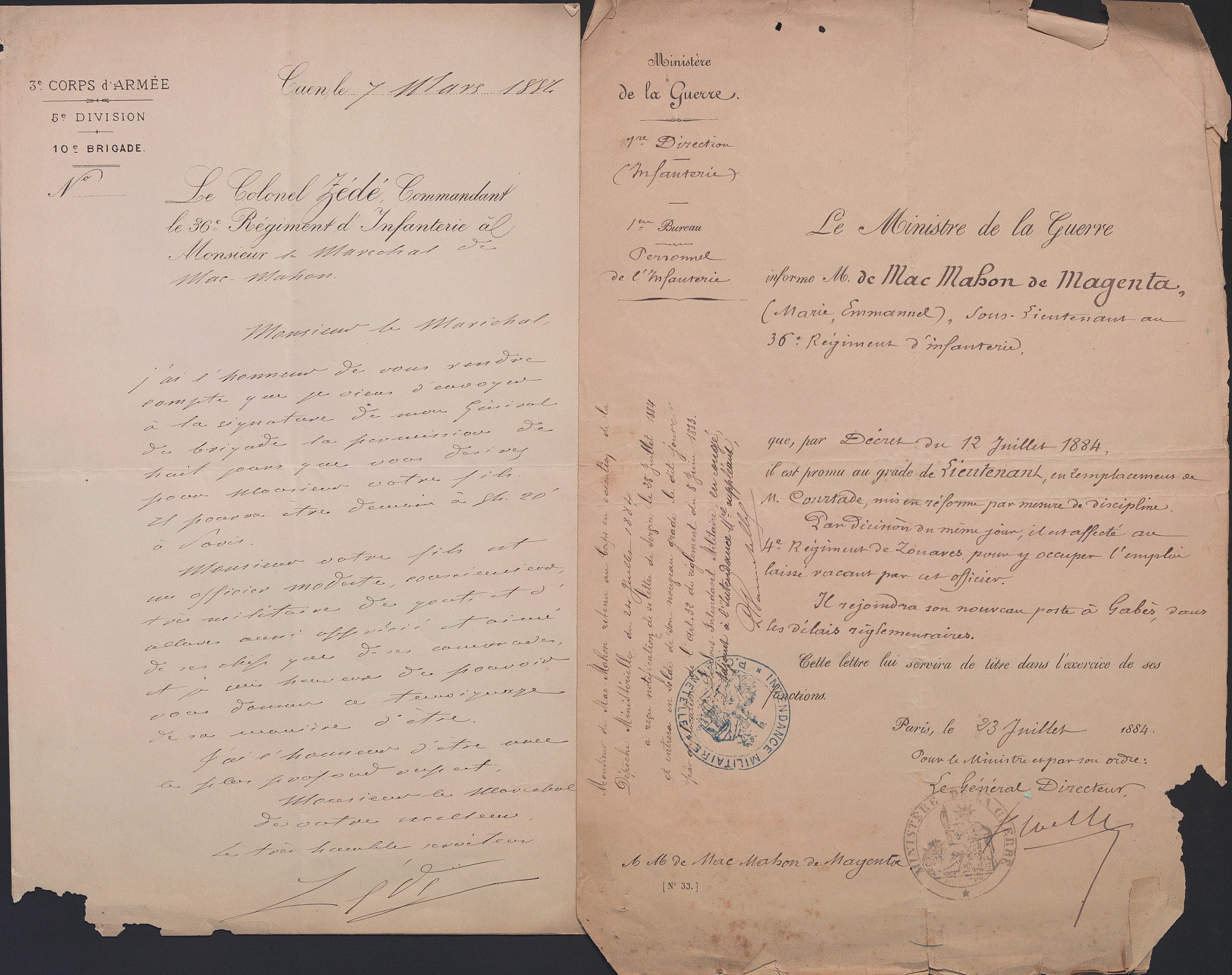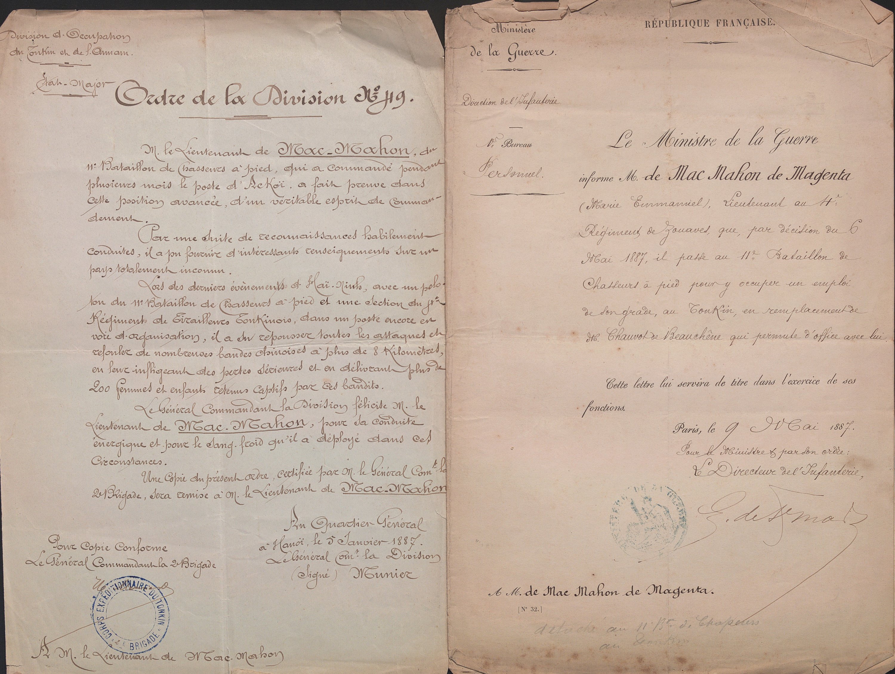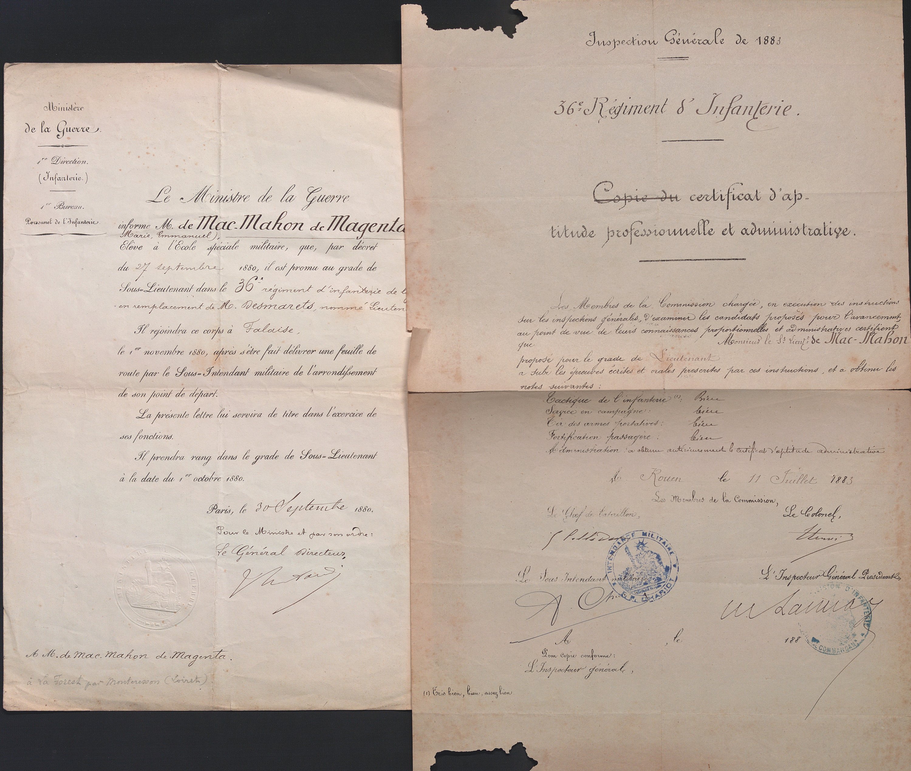 Lot de plus de 60 pièces manuscrites, 1880-1888, concernant la carrière militaire de Marie Emmanuel comte de Mac Mahon, fils cadet du maréchal Mac Mahon, élève de l’Ecole spéciale militaire de Saint-Cyr de 1878 à 1880 (promotion des Zoulous), sous-lieutenant au 36e RI, lieutenant en 1884 au 4e régiment de zouaves puis au 11e bataillon de chasseurs à pied en 1886, participe au corps expéditionnaire et à l’occupation du Tonkin en Indochine du 20 octobre 1885 au 1er avril 1888.