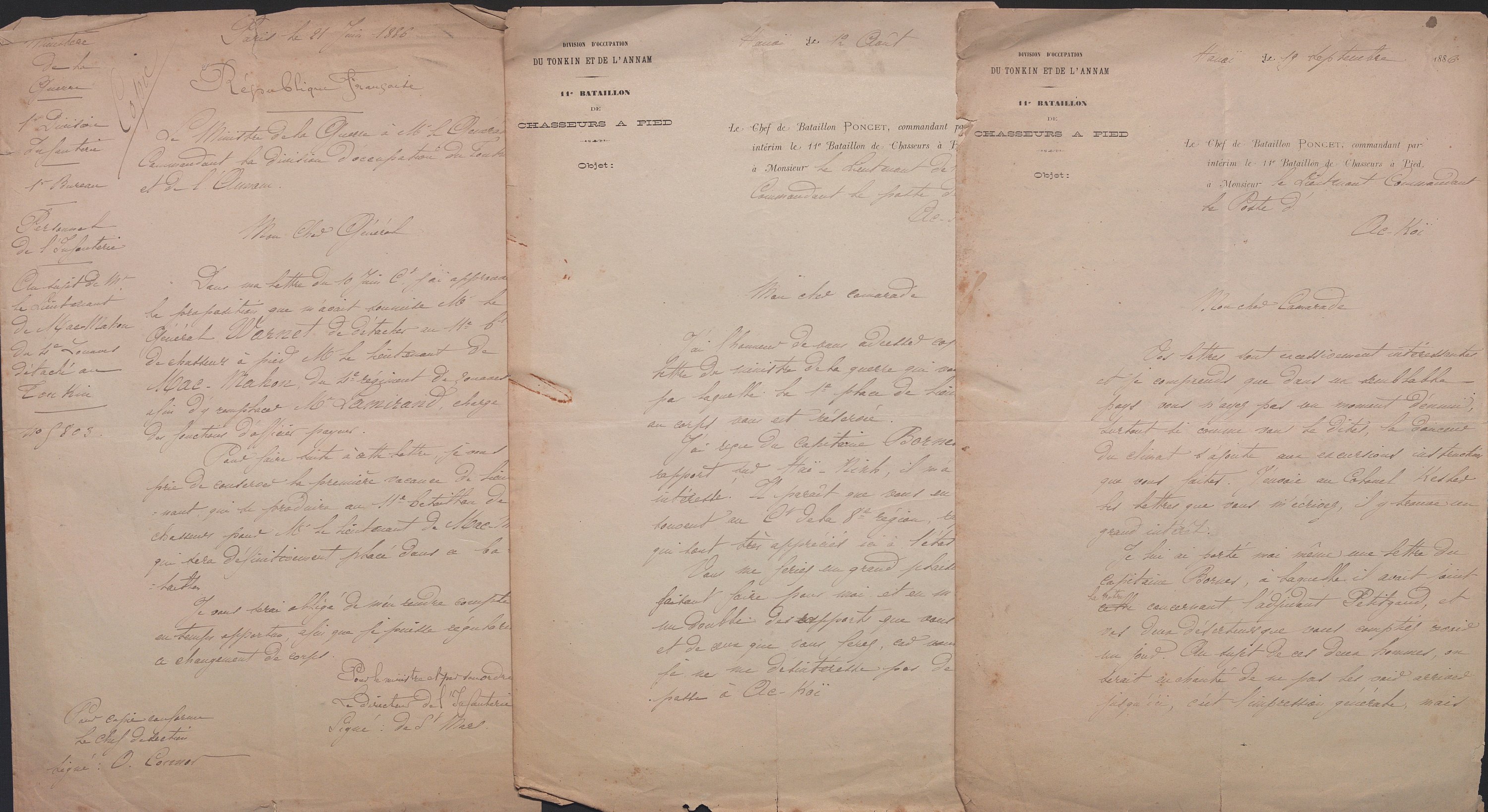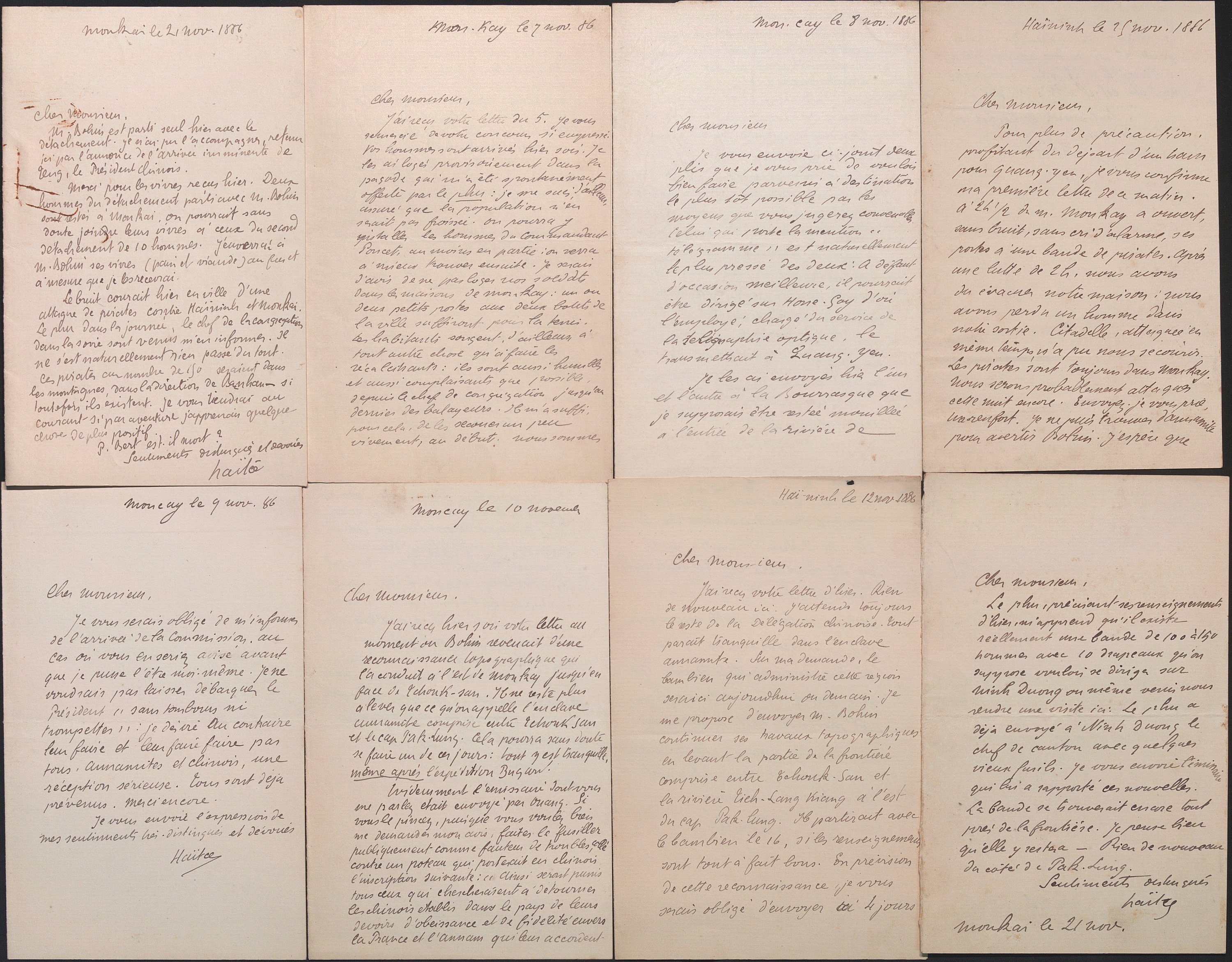 8 L.A.S., 7 au 25 novembre 1886, Séverin Haïtce, originaire de Bidache, diplômé de l’école des langues orientales, interprète auprès de la commission de délimitation des frontières du Tonkin, assassiné à l’âge de 27 ans le 27 ou 28 novembre 1886 près du village de Moncay ou Mon-Kay (Vietnam) par des pirates chinois ; rare correspondance adressée à de Mac Mahon en poste au fort d’Hakoï dans laquelle le jeune interprète raconte son arrivée, son installation ainsi que l’attaque des pirates chinois dans sa dernière lettre expédiée datée du 25 novembre 1886 « 10 nov. J’ai reçu hier soir lettre au moment où Bohin revenait d’une reconnaissance topographique qui l’a conduit à l’est de Mon-Kay jusqu’en face de Tchouk-San. Il ne reste plus à lever que ce qu’on appelle l’enclave annamite comprise entre Tchouk-San et le cap de Pak-Lung. ( ) L’émissaire dont vous me parlez était envoyé par Duang. Si vous le pincez, puisque vous voulez bien me demander mon avis, faites le fusiller publiquement comme fauteur de troubles, collé contre un poteau qui porterait en chinois l’inscription suivante : Ainsi seront punis tous ceux qui chercheraient à détourner les chinois établis dans le pays de leurs devoirs d’obéissance et de fidélité envers la France et l’Annam qui leur accordent une si généreuse hospitalité » « 21 nov. Monkaï Le Phu précisant ses renseignements d’hier m’apprend qu’il existe réellement une bande de 100 à 150 hommes avec 10 drapeaux qu’on suppose vouloir se diriger sur Ninh-Duong ou même venir nous rendre une visite ici ( ) Ces pirates chinois au nombre de 150 seraient dans les montagnes » « Haïninh 25 nov. Pour plus de précaution profitant d’un train pour Guang-Zen, je vous confirme à 2h30 du matin Mon-Kay Monkay a ouvert sans bruit, sans cri d’alarme ses portes à une bande de pirates. Après une lutte de 2h, nous avons évacuer notre maison : nous avons perdu un homme dans notre sortie. Citadelle attaquée en même temps, n’a pu nous secourir. Les pirates sont toujours dans Monkay. Nous serons probablement attaqués cette nuit encore » ;