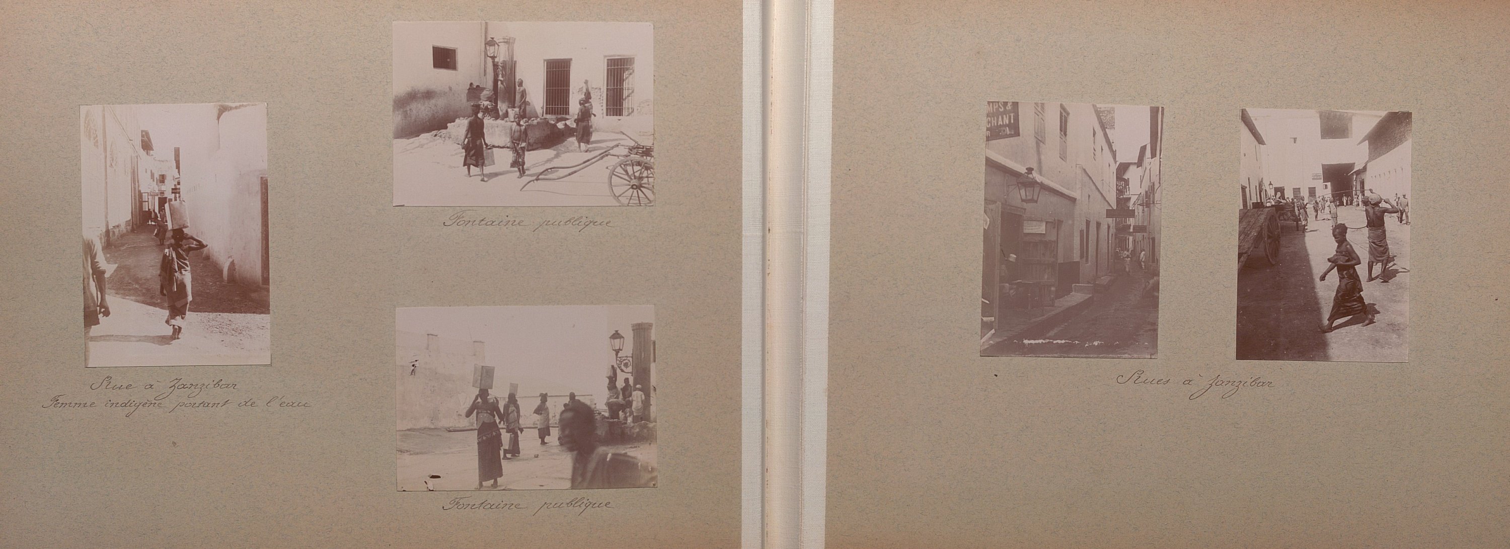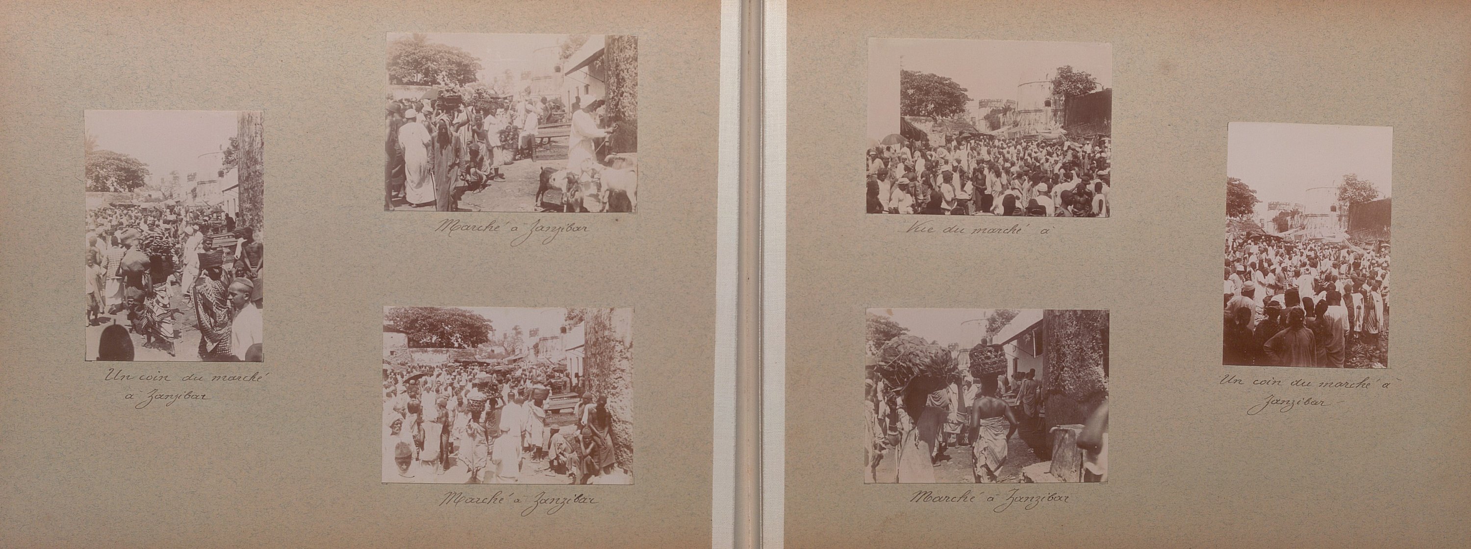« En route pour Madagascar » : « Les colonels Bailloud, de Beylié, le Cdt de La Guillonière », groupes de soldats de différentes armes sur les pontons des bateaux, passage au Canal de Suez, escales à Obock (Djibouti), Zanzibar (rues, marché, troupes du Sultan, mosquées), Mayotte ;