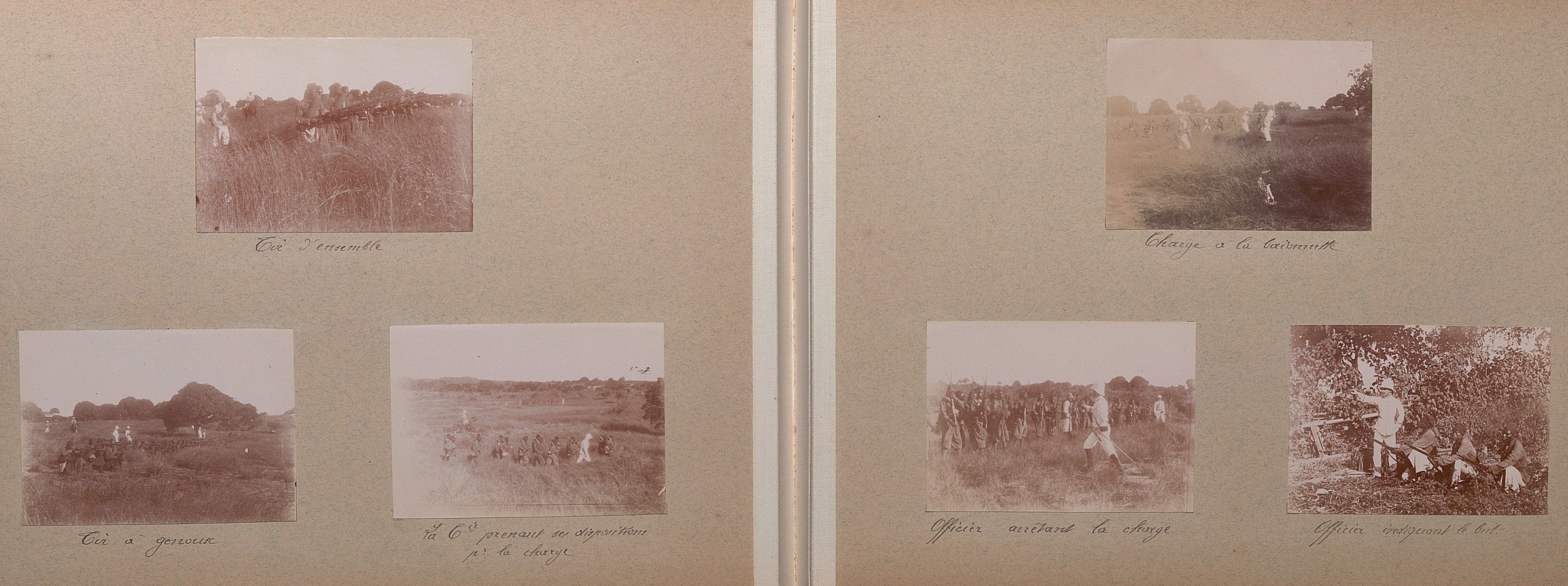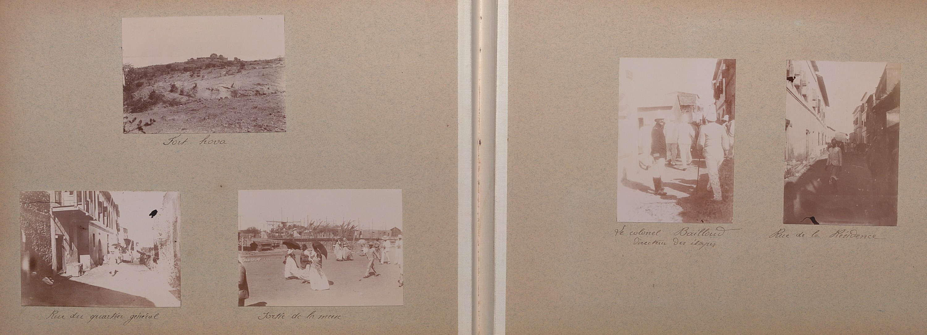 Album photo à l’italienne, 21 x 26 cm, contenant env. 250 clichés photographiques, 6x 8 cm, contrecollés sur carton fort, tous légendés et classés ; rare et bel ensemble de photographies témoignant de l’expédition militaire française qui se déroule à Madagascar au cours du premier semestre 1895, dont :