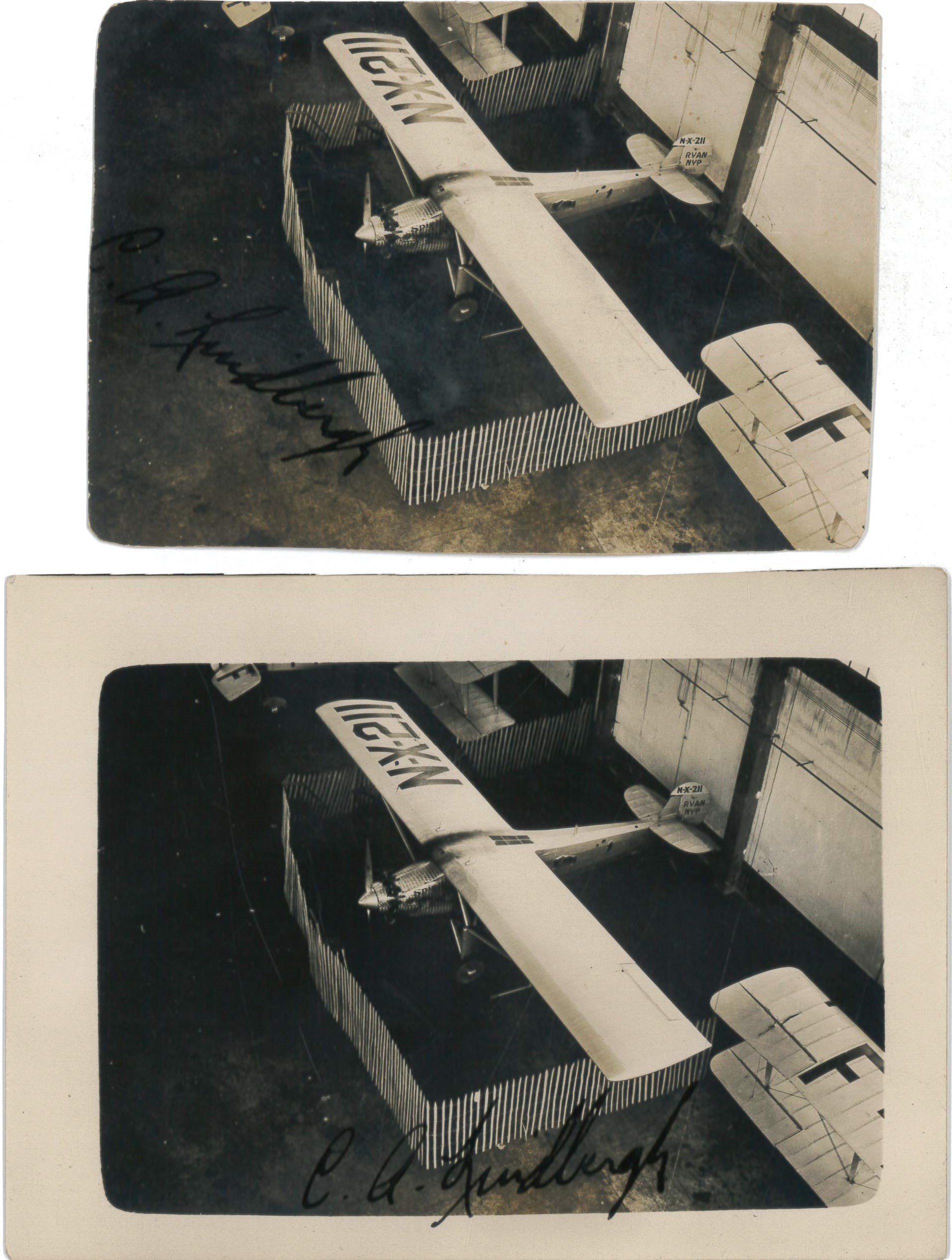2 photographies originales, 9 x 12 et 7 x 10 cm, avec chacune la signature autographe à la plume de Charles Lindbergh, représentant son avion « Spirit of Saint Louis », conservé dans le hangar de l’aérodrome du Bourget, monoplan avec lequel il fit la première traversée aérienne de l’océan Atlantique de New York à Paris (aérodrome du Bourget) en solitaire et sans escale les 20 et 21 mai 1927.