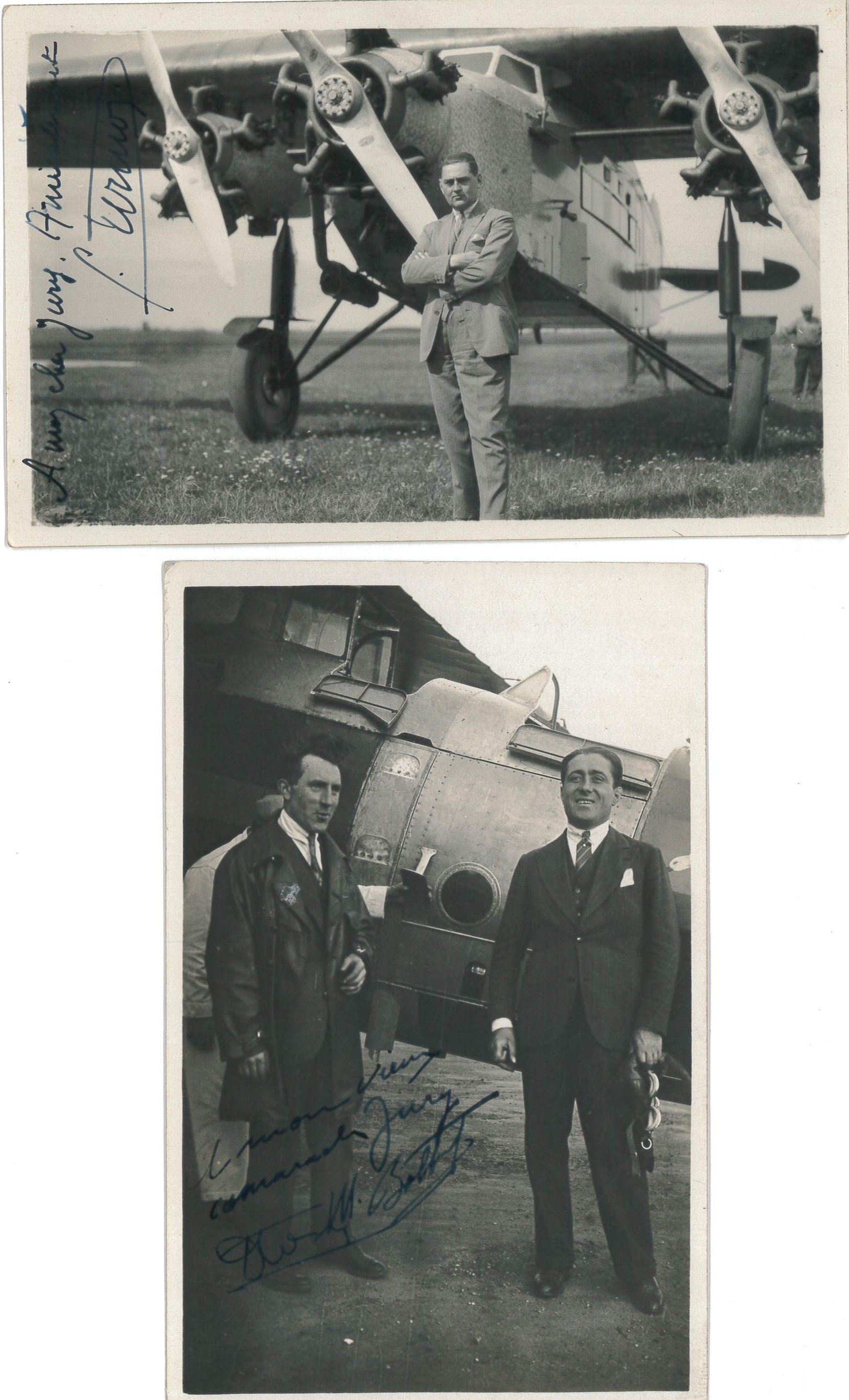 - carte photo avec dédicace « A mon vieux camarade Jury » et signatures autographes des aviateurs Dieudonné Costes et de Maurice Bellonte, ayant réussi l’exploit en 1930 à bord du Bréguet « Le Point d’interrogation » de quitter l’aérodrome du Bourget pour atterrir à New York, Jean Jury ayant été chef de piste au Bourget ;