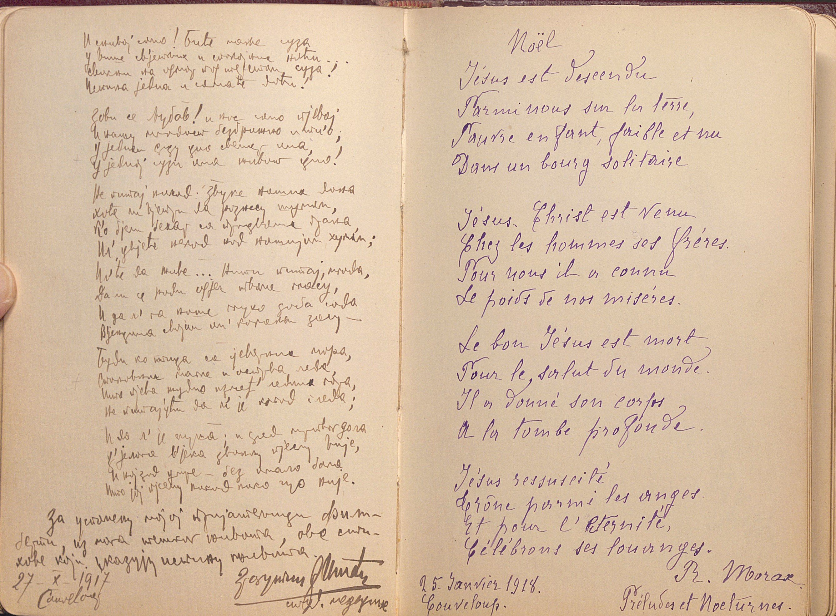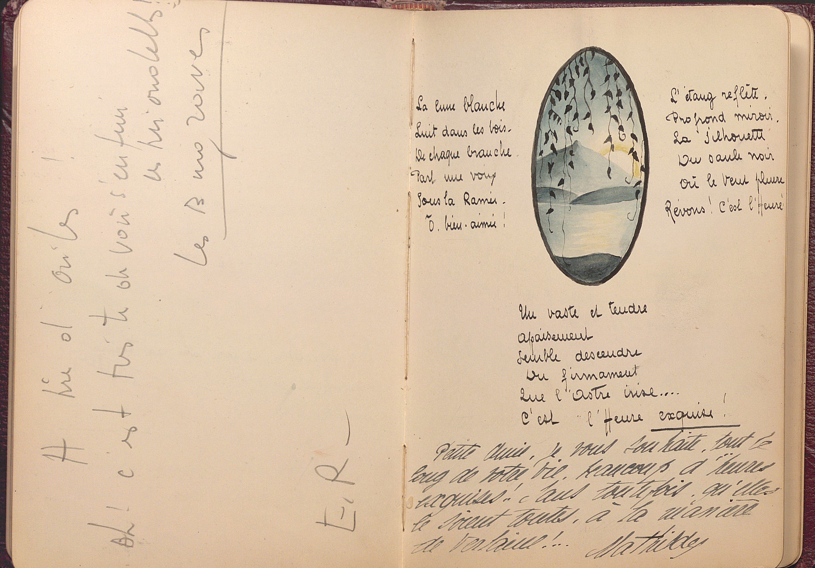 Petit carnet amicorum manuscrit, in-8 env. 43 feuillets, 1912-1926, ayant appartenu à Philiberte Abre (1900-1989) fille d’un banquier de Bonneville (Haute-Savoie), contenant poèmes, partitions musicales, citations, dessins, d’après des œuvres d’Emile Verhaeren, Sully Prudhomme, Verlaine, Victor Hugo, etc, dédicacés par des camarades de pensionnat de l’école des beaux-arts de Genève, mais aussi des camarades de retraites ou de vacances au Clos à Ayze (Haute-Savoie), La Clusaz, Couveloup à Saint Vital.