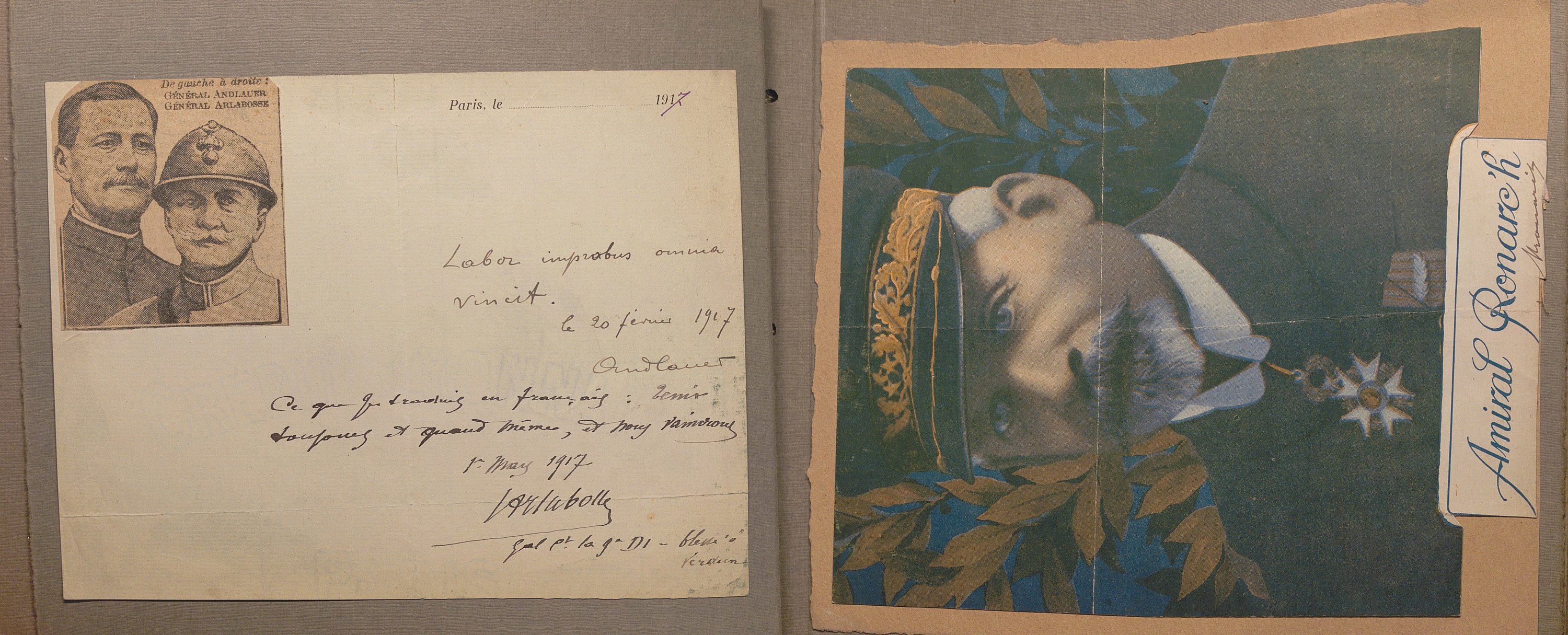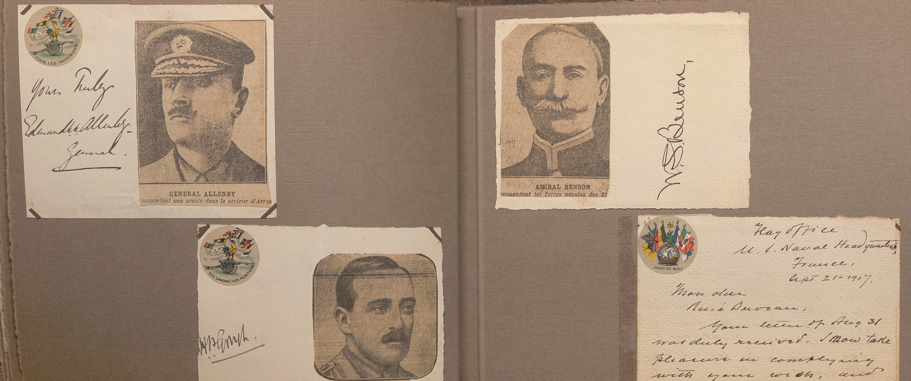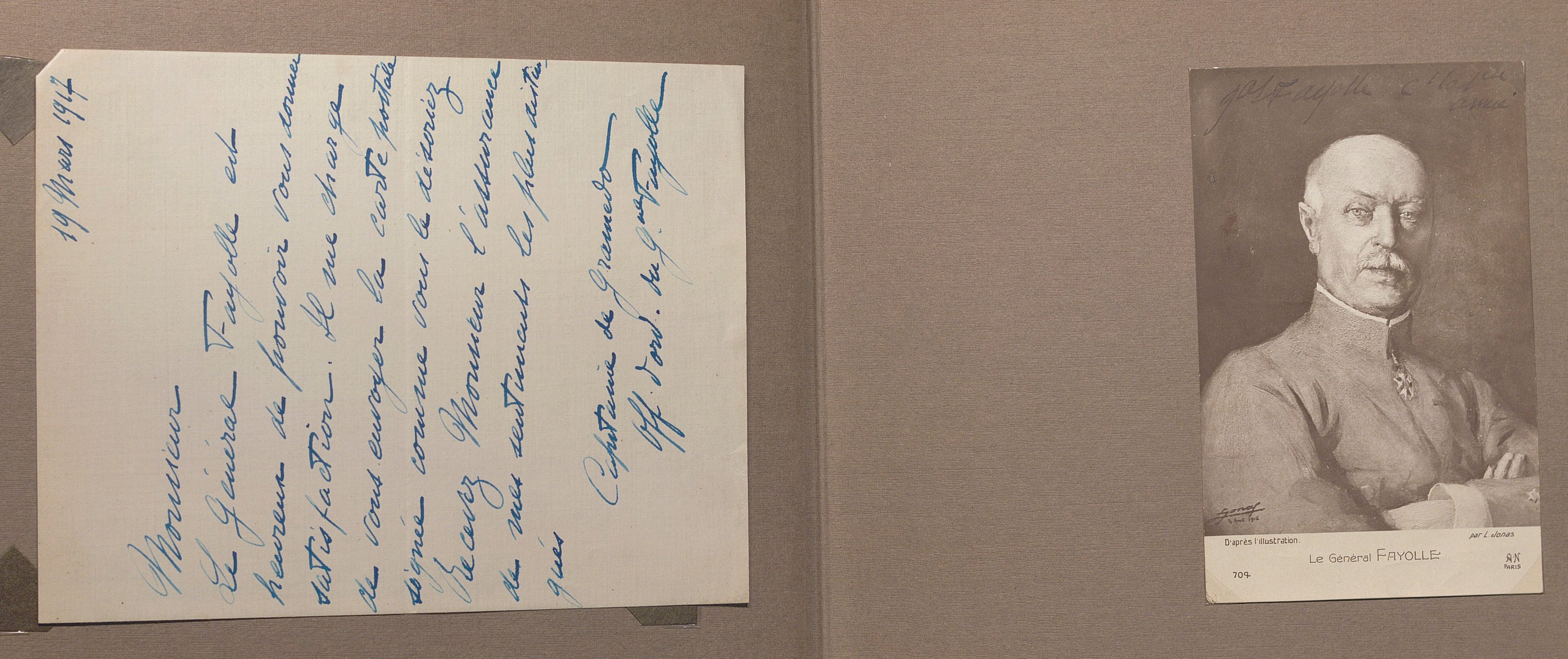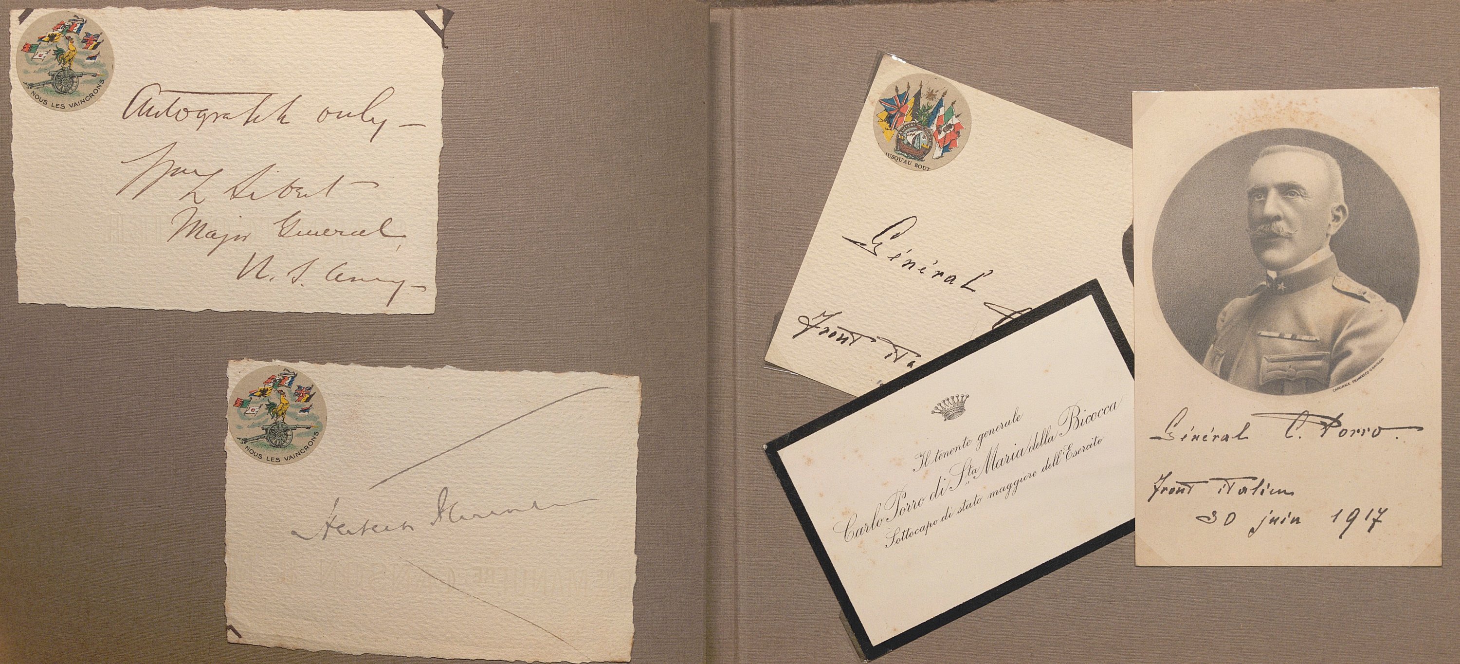 Portraits sous forme de cartes postales et divers documents avec signatures manuscrites de Raymond Poincaré, président de la République ; maréchal Joffre ; maréchal Foch ; maréchal Philippe Pétain ; général Fayolle ; P.A.S. général Franchet d’Espérez ; Woodrow Wilson président des Etats-Unis ; David Lloyd George premier ministre du Royaume-Uni ; P.A.S. général John Pershing commandant du corps expéditionnaire américain en Europe ; général Gouraud ; Antonin Dubost président du Sénat ; Paul Deschanel président de la chambre des députés ; général Mangin ; maréchal Douglas Haig ; amiral John Jellicoe ; Lucien Lacaze ministre de la marine ; général Pau ; général d’Amade ; général Dubois ; général de Maud’huy ; général d’Urbal ; colonel Deport ; général de Langle de Cary ; général Balfourier ; P.A.S. général Brulard ; général Alix ; général Rat ; général de Villaret ; général Eydoux ; L.A.S. colonel Paillé ; lieutenant Marcel Vialet pilote aviateur as de guerre (1887-1925) ; Eugène Gilbert aviateur et as de guerre (1889-1918) Mort pour la France ; René Dorme aviateur as de guerre (1894-1917) Mort pour la France ; Charles Nungesser aviateur et as de guerre (1882-1927) ; P.A.S. abbé Jules-Auguste Lemire député ; général Carlo Porro ; général Dallolio ministre ; marquis Salvago Raggi diplomate italien ; Francis Bertie ambassadeur du Royaume-Uni ; William Graves Sharp ambassadeur des Etats-Unis ; général Edmund Allenby ; général Hubert Gough ; amiral William S. Benson ; général Ruquoy ; général Guillaumat ; général Maistre ; général Gérard ; colonel Sohier ; Gaston Doumergue ministre ; René Viviani ministre ; Albert Claveille ministre ; Justin Godart ministre ; Théodore Steeg ministre ; Albert Dalimier ministre ; général Arlabosse ; amiral Ronarc’h ; etc. Suivi de lettres de refus et portraits cartes-photos de Georges Clémenceau, général de Freycinet, général Lyautey, général Dubail.