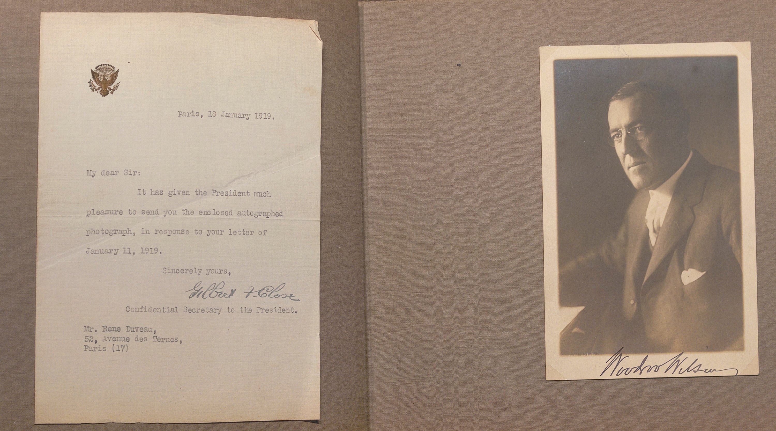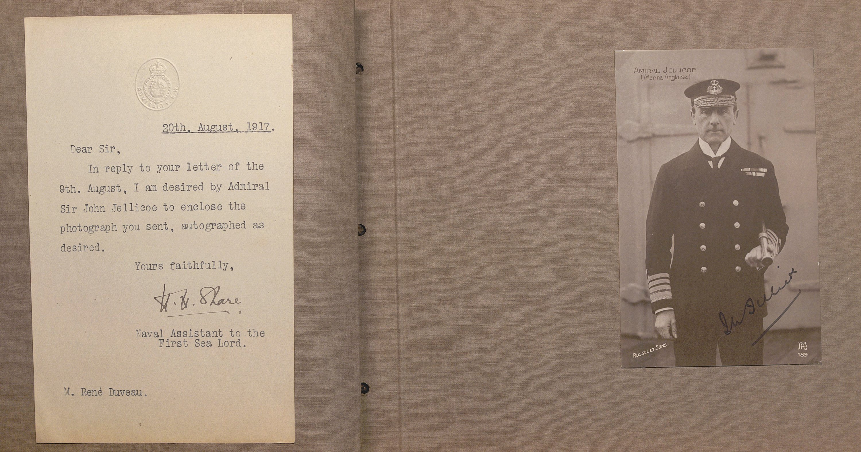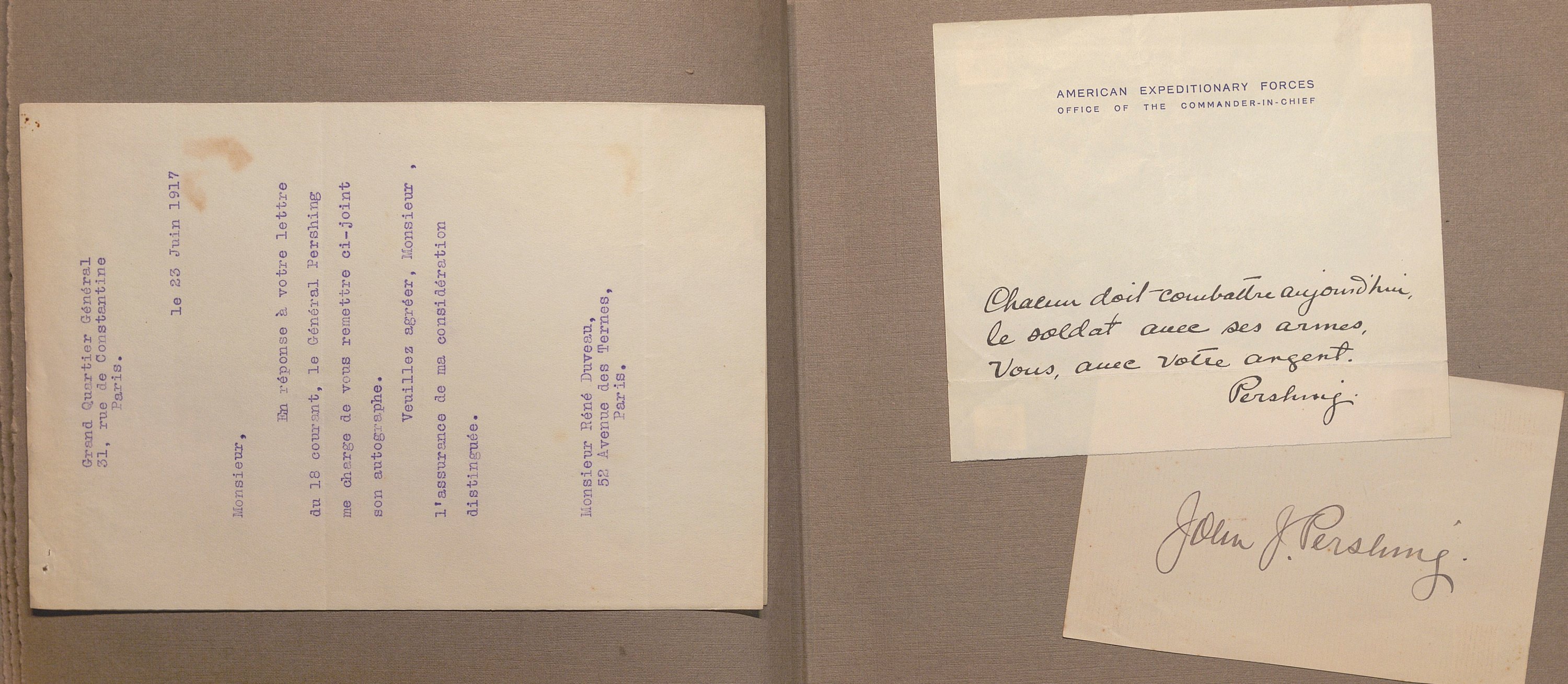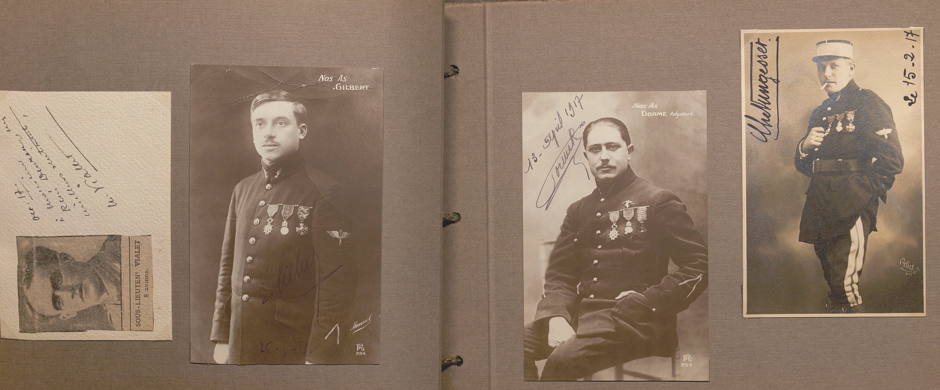Portraits sous forme de cartes postales et divers documents avec signatures manuscrites de Raymond Poincaré, président de la République ; maréchal Joffre ; maréchal Foch ; maréchal Philippe Pétain ; général Fayolle ; P.A.S. général Franchet d’Espérez ; Woodrow Wilson président des Etats-Unis ; David Lloyd George premier ministre du Royaume-Uni ; P.A.S. général John Pershing commandant du corps expéditionnaire américain en Europe ; général Gouraud ; Antonin Dubost président du Sénat ; Paul Deschanel président de la chambre des députés ; général Mangin ; maréchal Douglas Haig ; amiral John Jellicoe ; Lucien Lacaze ministre de la marine ; général Pau ; général d’Amade ; général Dubois ; général de Maud’huy ; général d’Urbal ; colonel Deport ; général de Langle de Cary ; général Balfourier ; P.A.S. général Brulard ; général Alix ; général Rat ; général de Villaret ; général Eydoux ; L.A.S. colonel Paillé ; lieutenant Marcel Vialet pilote aviateur as de guerre (1887-1925) ; Eugène Gilbert aviateur et as de guerre (1889-1918) Mort pour la France ; René Dorme aviateur as de guerre (1894-1917) Mort pour la France ; Charles Nungesser aviateur et as de guerre (1882-1927) ; P.A.S. abbé Jules-Auguste Lemire député ; général Carlo Porro ; général Dallolio ministre ; marquis Salvago Raggi diplomate italien ; Francis Bertie ambassadeur du Royaume-Uni ; William Graves Sharp ambassadeur des Etats-Unis ; général Edmund Allenby ; général Hubert Gough ; amiral William S. Benson ; général Ruquoy ; général Guillaumat ; général Maistre ; général Gérard ; colonel Sohier ; Gaston Doumergue ministre ; René Viviani ministre ; Albert Claveille ministre ; Justin Godart ministre ; Théodore Steeg ministre ; Albert Dalimier ministre ; général Arlabosse ; amiral Ronarc’h ; etc. Suivi de lettres de refus et portraits cartes-photos de Georges Clémenceau, général de Freycinet, général Lyautey, général Dubail.