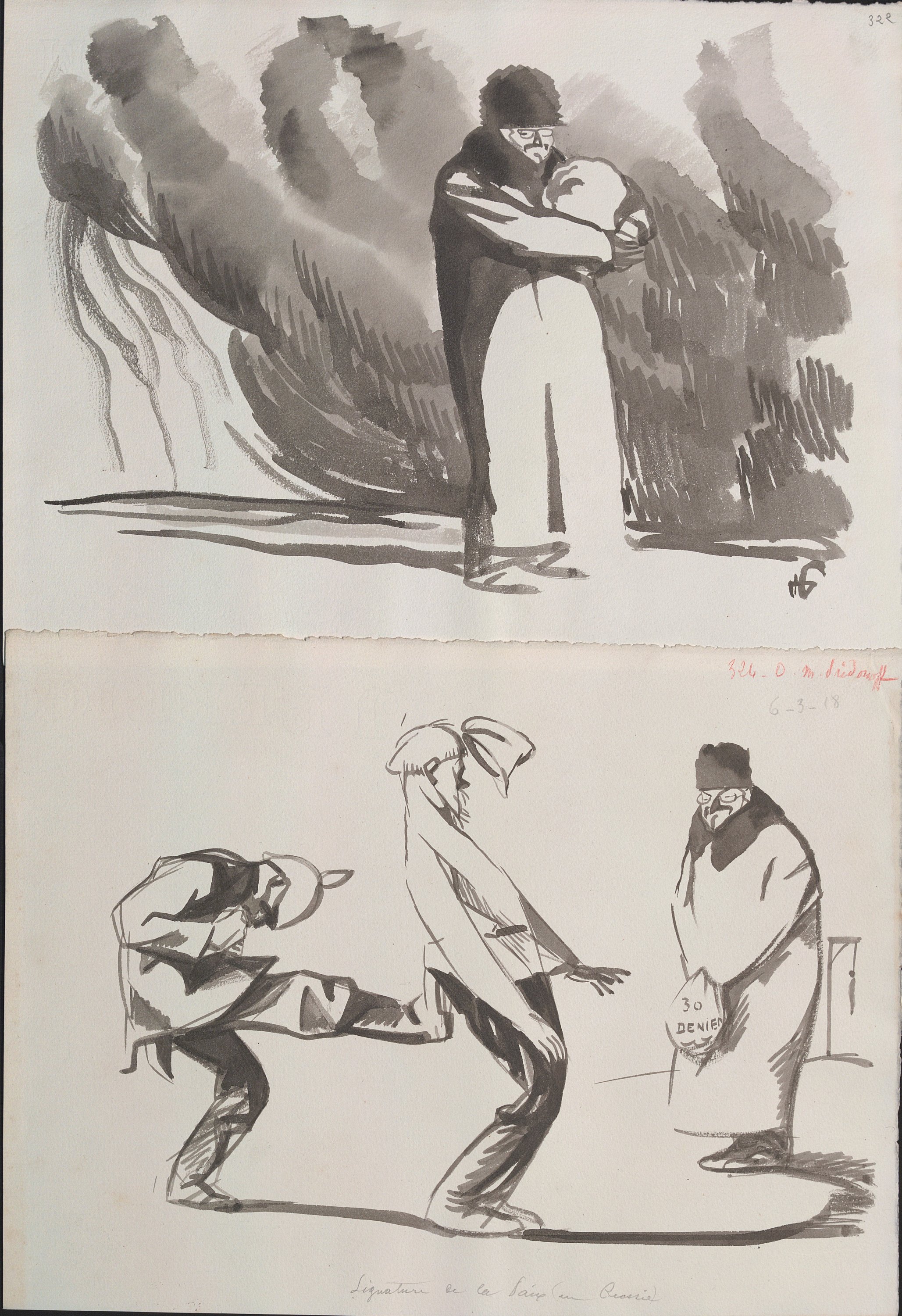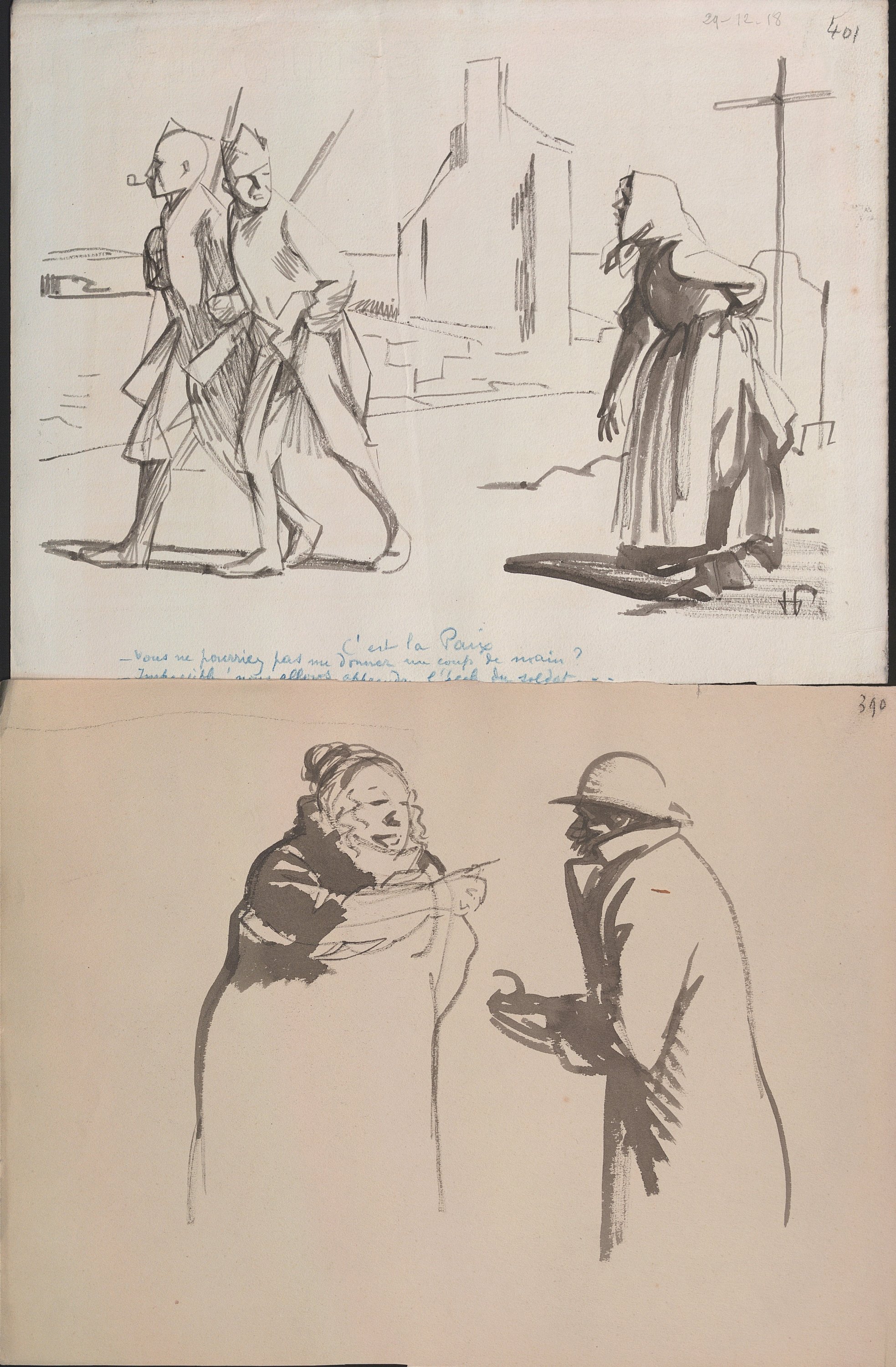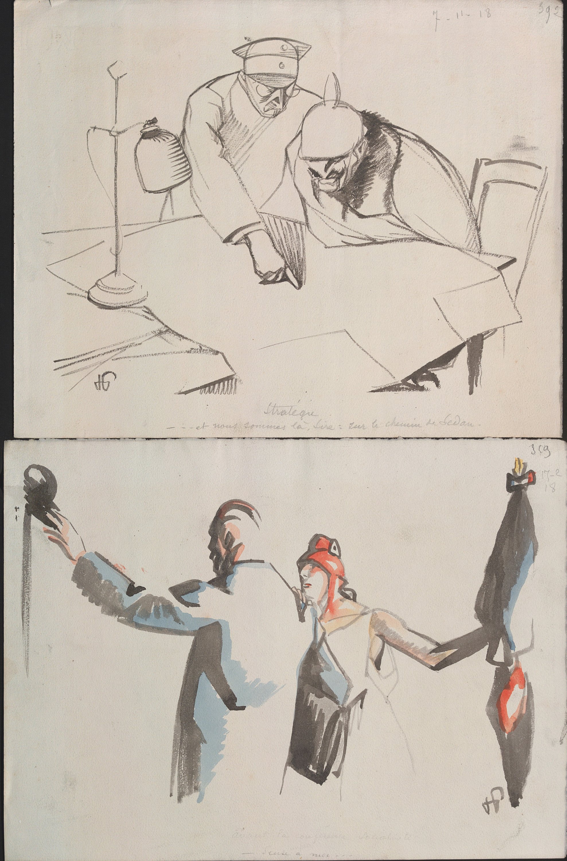 Il s’agit à la fois des ébauches, dessins préparatoires ou maquettes abouties en vue de leur publication dans la presse dont le journal « La Victoire - quotidien révisionniste : organe de la république autoritaire et plébiscitaire » sous la direction de Gustave Hervé paru à partir du 1er janvier 1916.