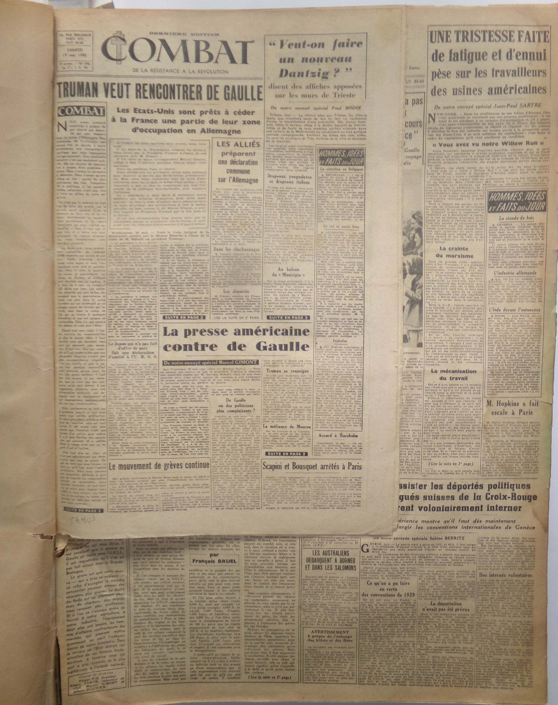 « Combat, de la résistance à la révolution », journal quotidien parisien, n° du 19 mai au 31 décembre 1945 + n° du 27 et 30 mai 1944 et du 8 mai 1945 ;