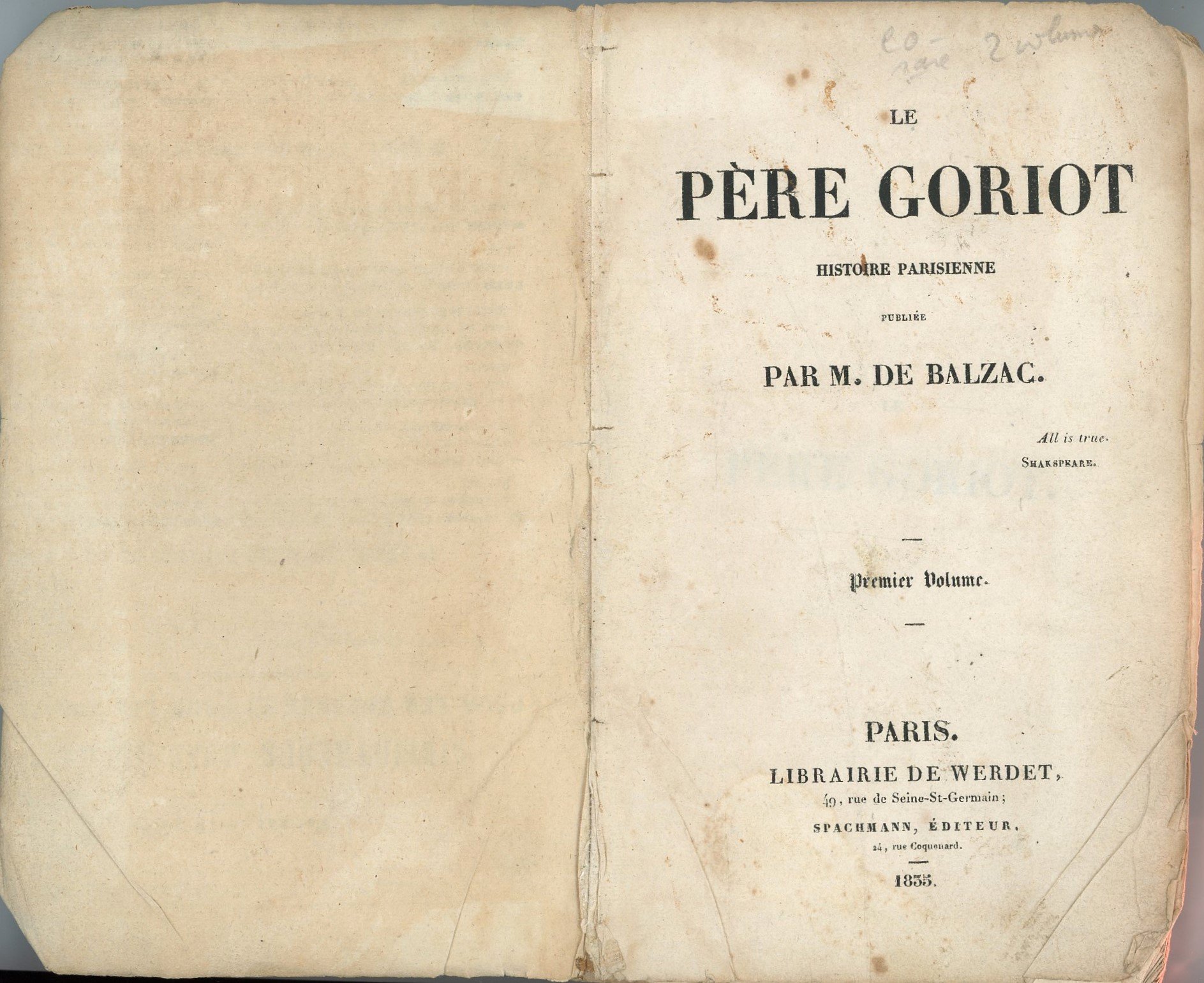 Le Père Goriot, histoire parisienne. 2 vol. Paris, librairie de Werdet et Spachmann, 1835. In-8 broch. (dos cassés), 336 et 374 pp. (qqs pages dérel. et rest. anc., rousseurs, qqs manques en coin) (manque page de titre « Une pension bourgeoise » dans le 1er tome)