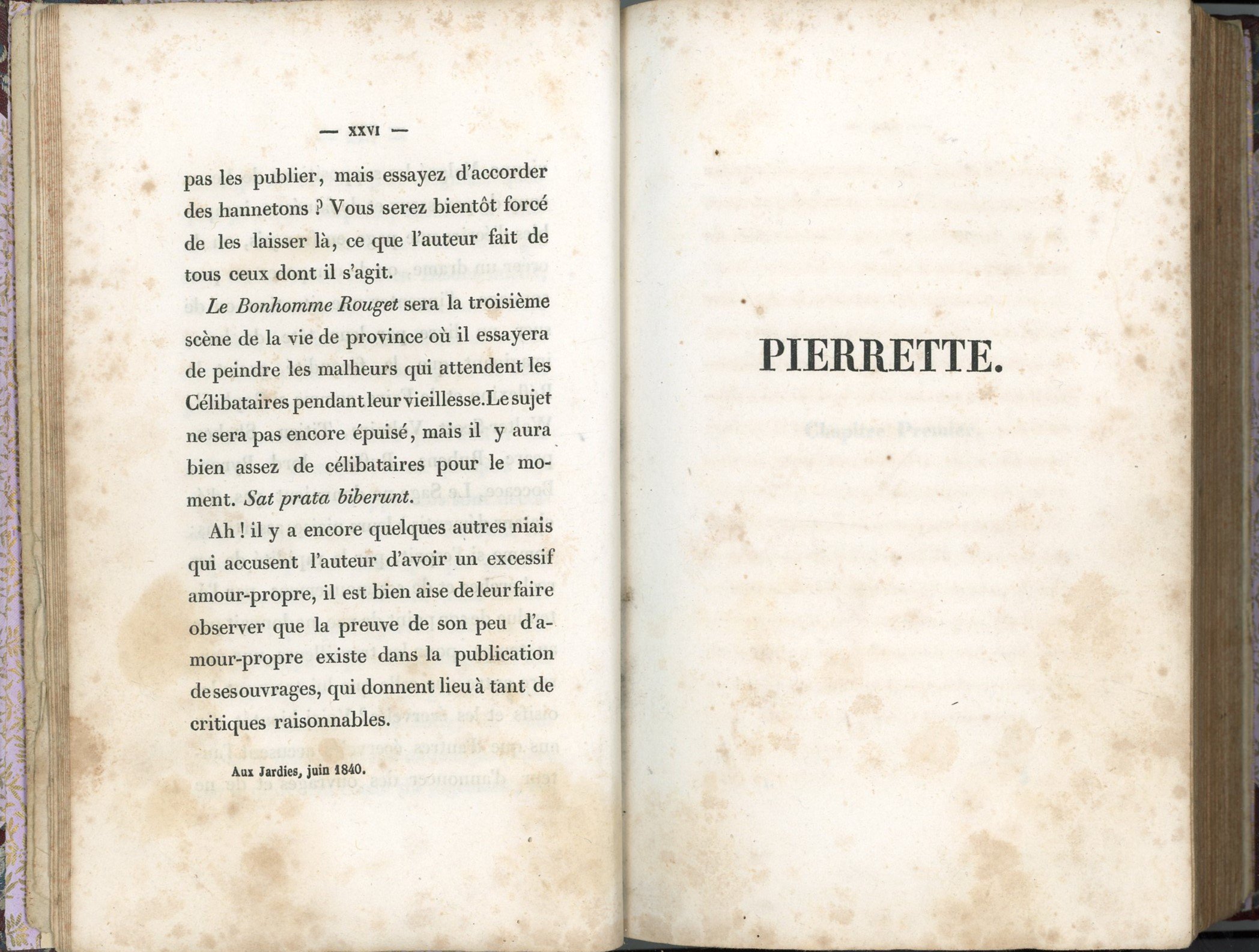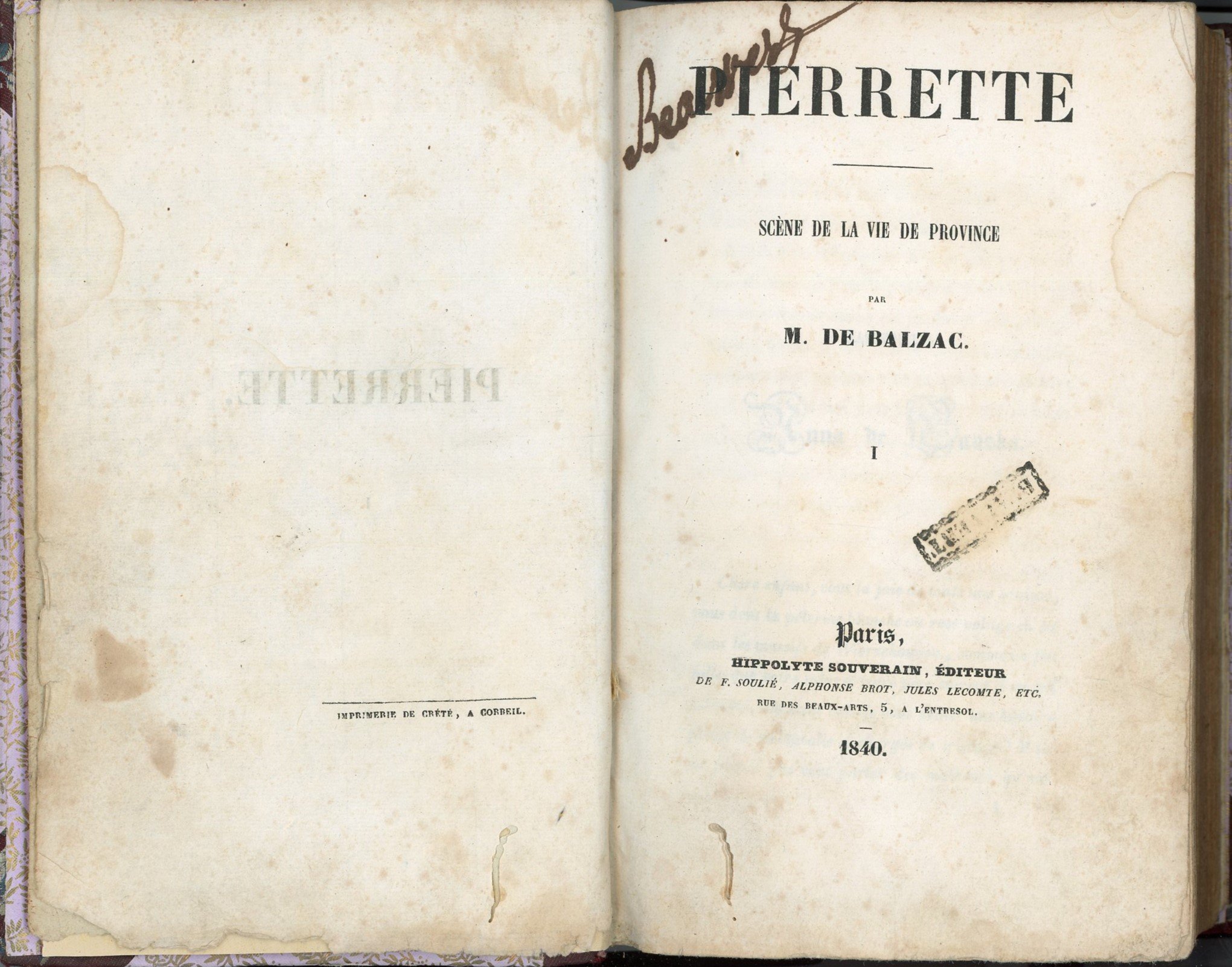 Pierrette, scène de la vie de Province. 2 vol. Paris, Souverain, 1840. In-8 rel. couverte de tissus, 294 et 325 pp. (1er tome incomplet, mque qqs pages de la préface) (rousseurs, trous de ver).