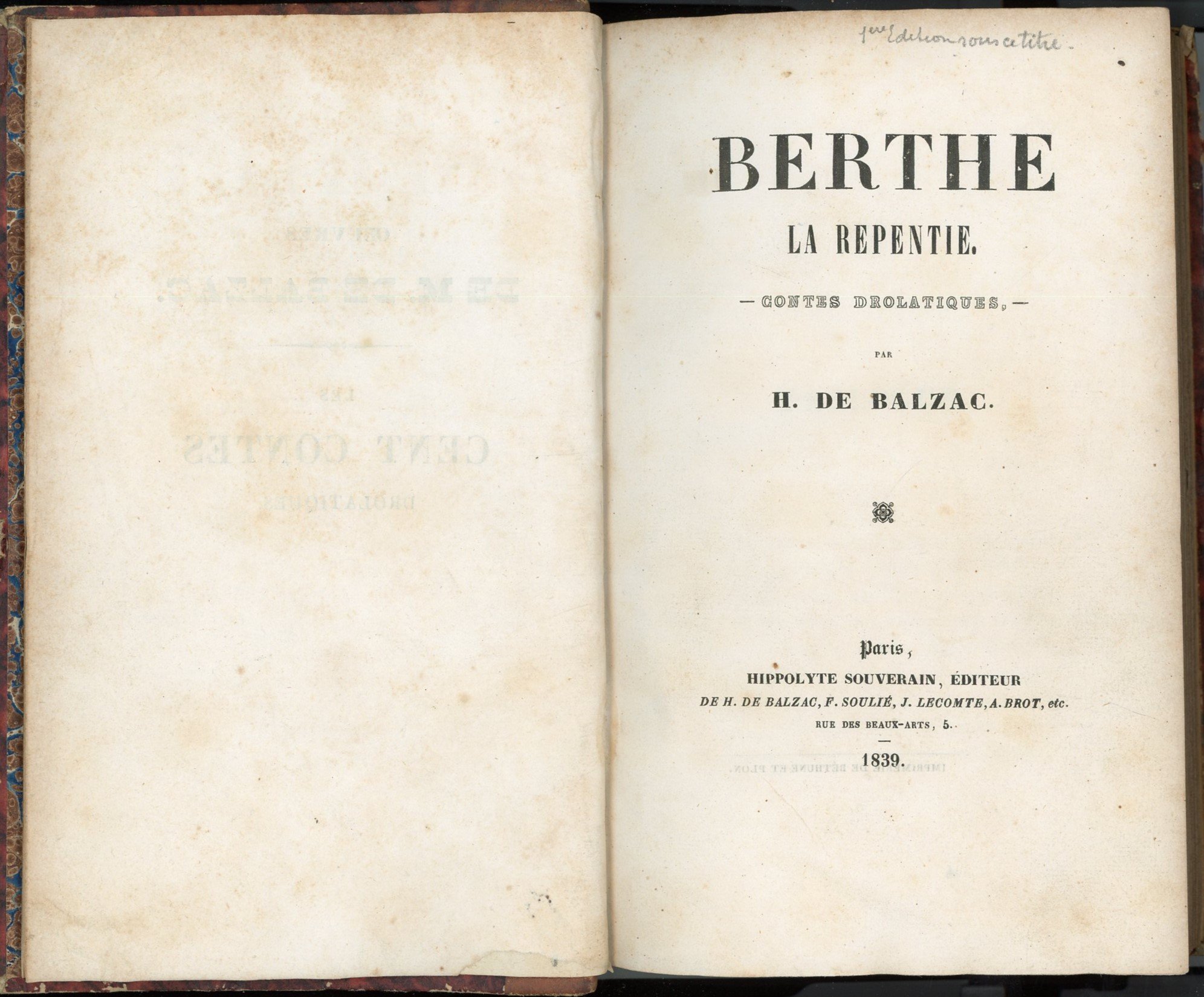 Œuvres de M. de Balzac Les cent contes drolatiques. Berthe la repentie, contes drolatiques. Paris, Souverain Hippolyte, 1839. In-8 rel. ½ basane (en l’état), 376 pp. (rousseurs) ;