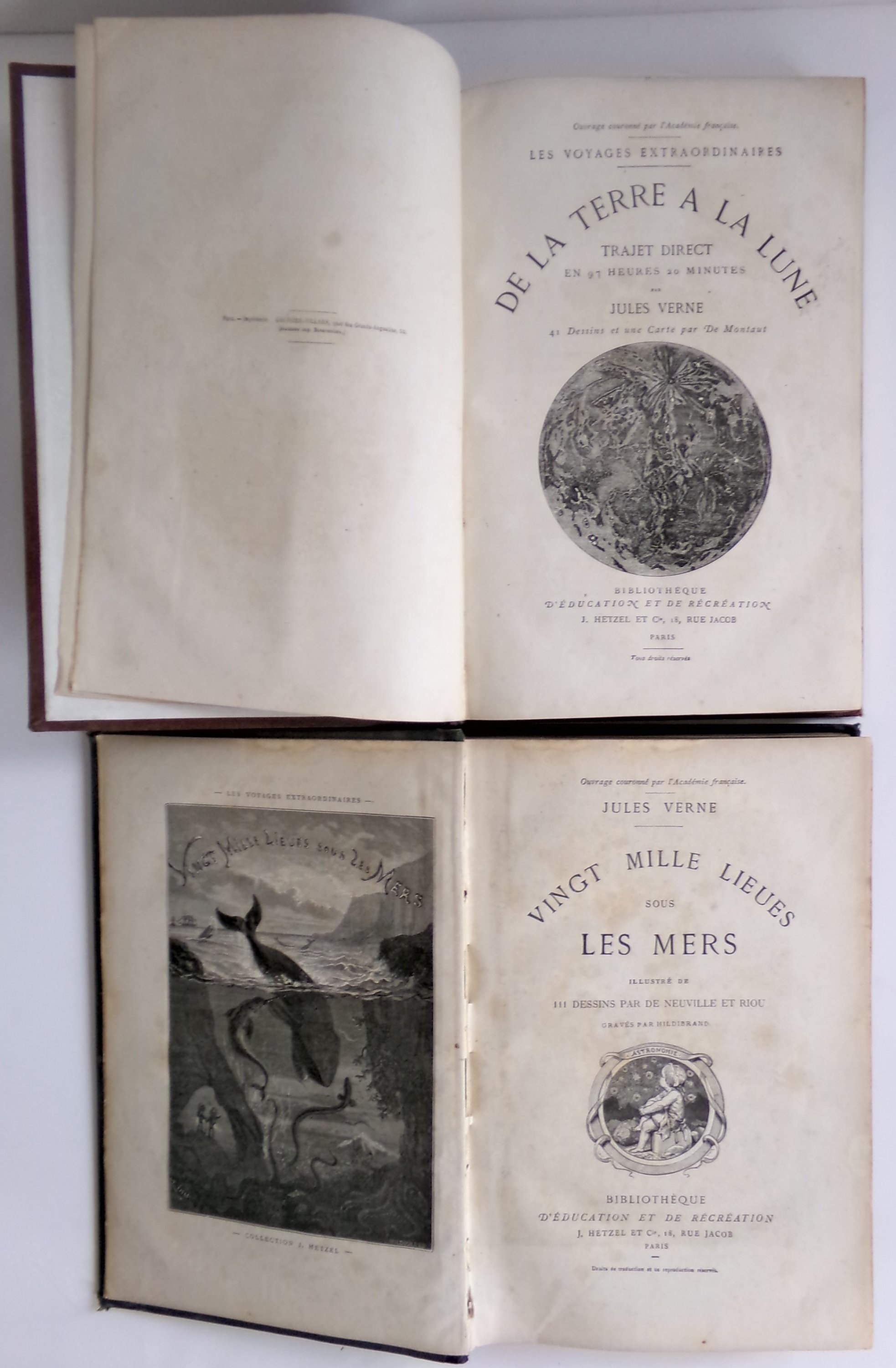 De la Terre à la Lune, et Autour de la Lune. Illustrations par de Montaut (De la Terre à la Lune) et Emile Bayard et A. de Neuville (Autour de la Lune). Paris, Bibliothèque d'Education et de Récréation, J. Hetzel et Cie, s.d., imprimé par Gauthier-Villars. (4)-172-(4)-180 pp. A l'intérieur, les légendes des illustrations pages 25 et 32 ont été rétablies correctement (légères rousseurs).