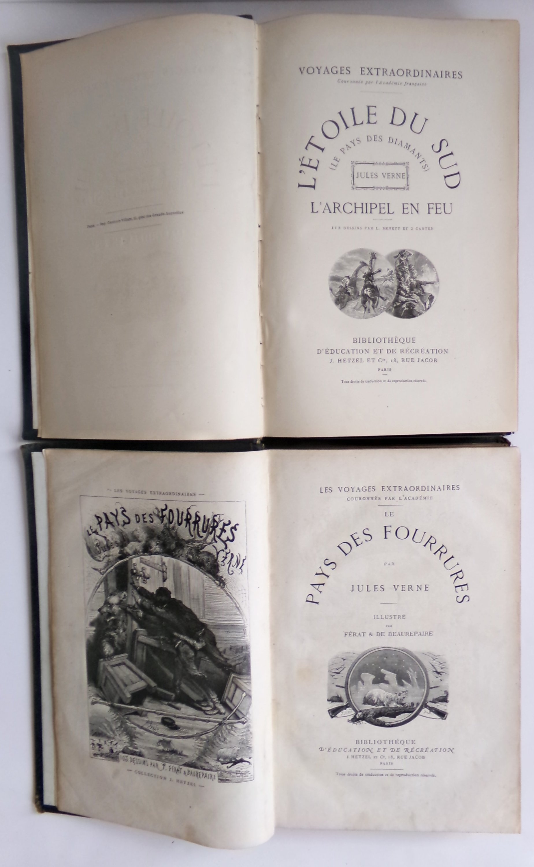 Voyages extraordinaires - L’étoile du sud (le pays des diamants). L’archipel en feu. 112 dessins par L. Benett et 2 cartes. Paris, Bibliothèque d'éducation et de récréation, J. Hetzel et Cie, s.d., imprimé par Gauthier-Villars. (4)-243-(4)-199 pp.