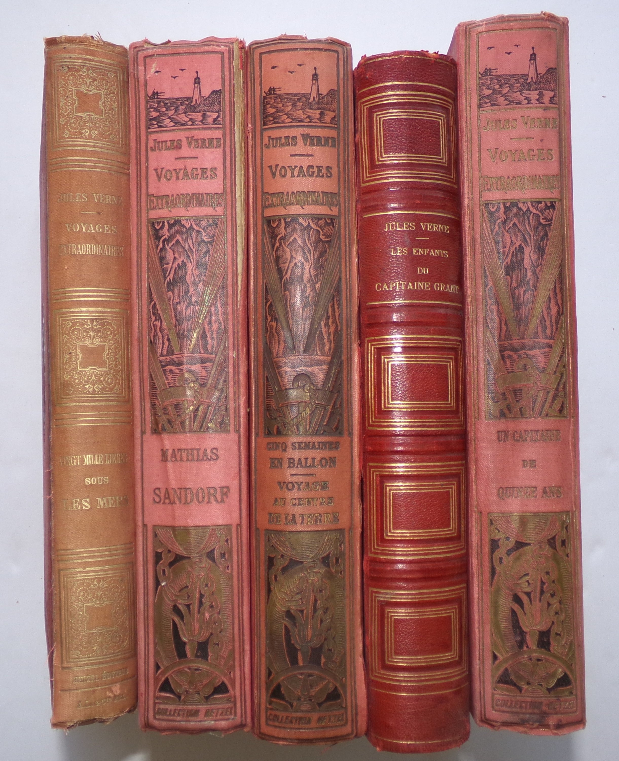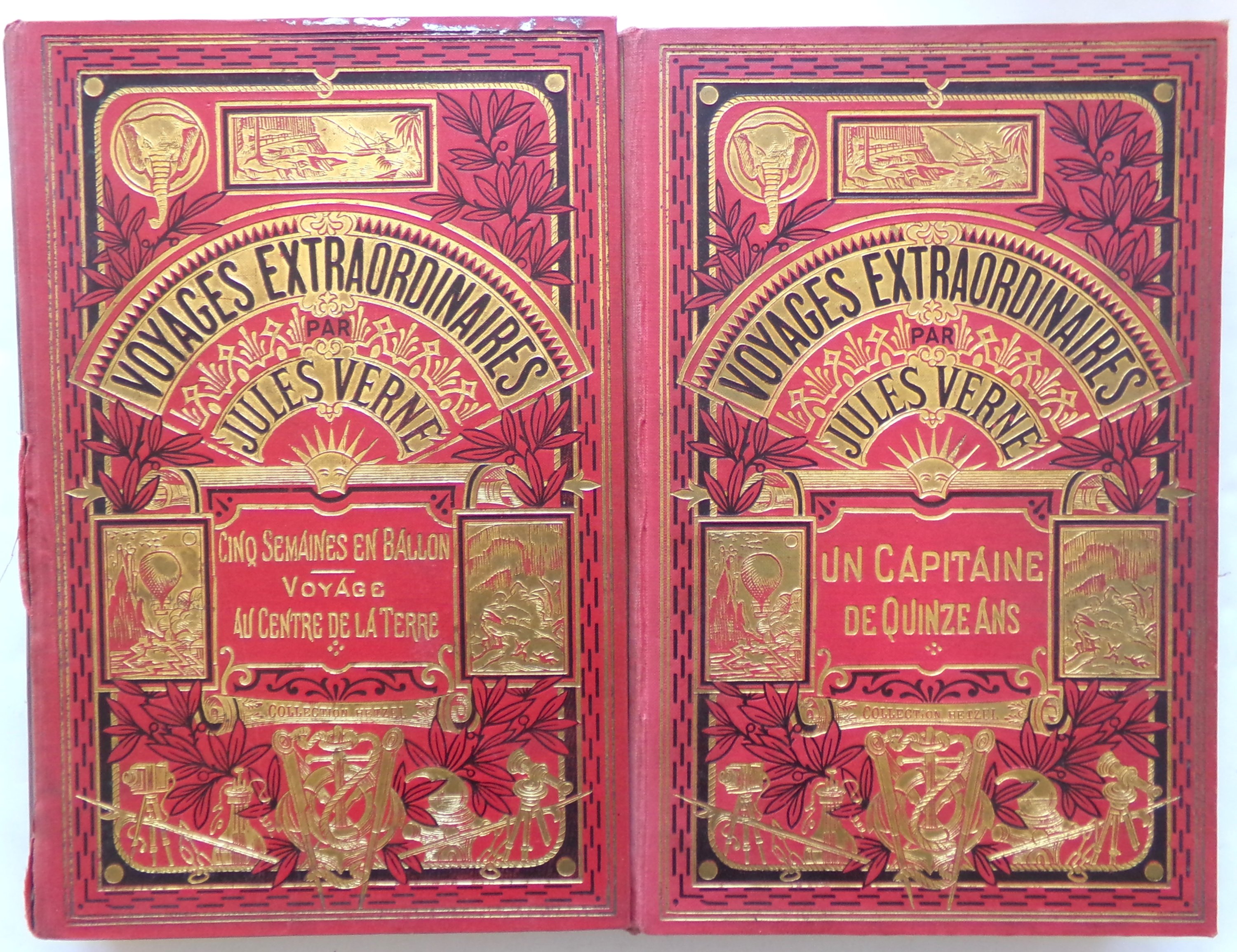 Cinq semaines en ballon Voyage au centre de la terre. Paris, libr. Hachette, 1929. Cartonnage Hetzel à un éléphant (usures à la couv.) ;