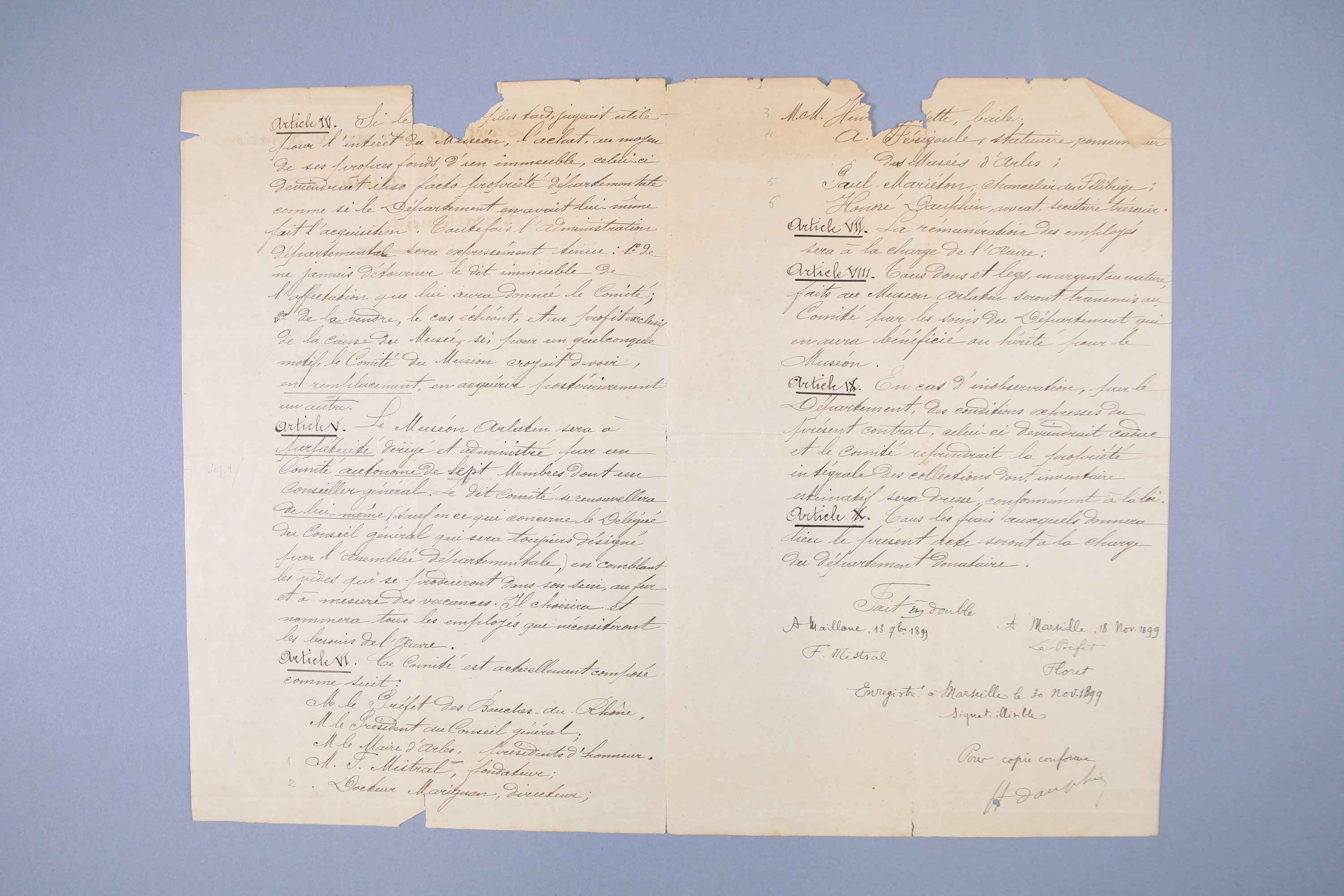 Copie manuscrite du « Projet de contrat de donation du Muséon Arlaten au département », sans date, 3 pages in-4 (accdts), signée par Honoré Dauphin (1867-1946), avocat et secrétaire-trésorier du musée.