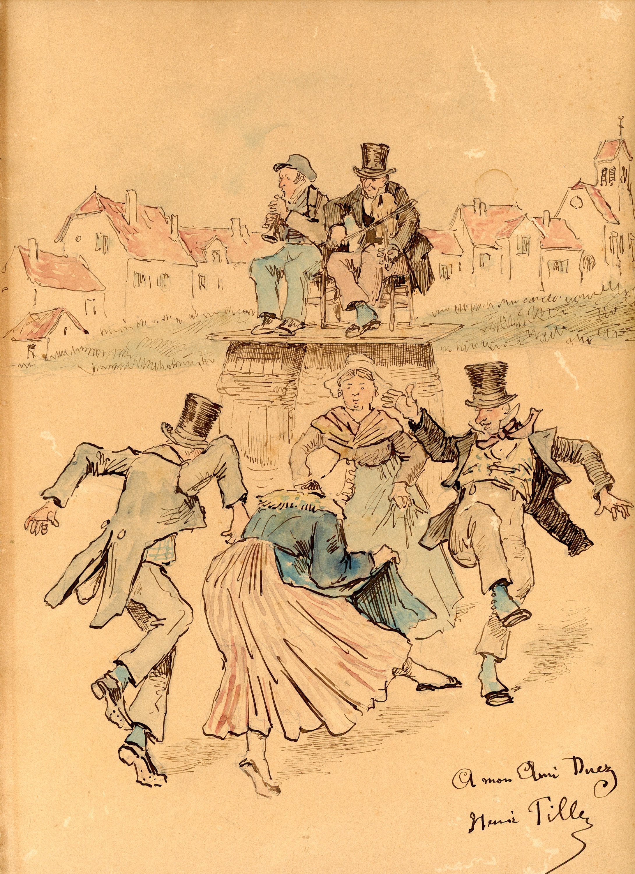 Scène de danse et musique, encre et aquarelle, signée et dédicacée « A mon ami Duez », 33 x 22,5 cm ;