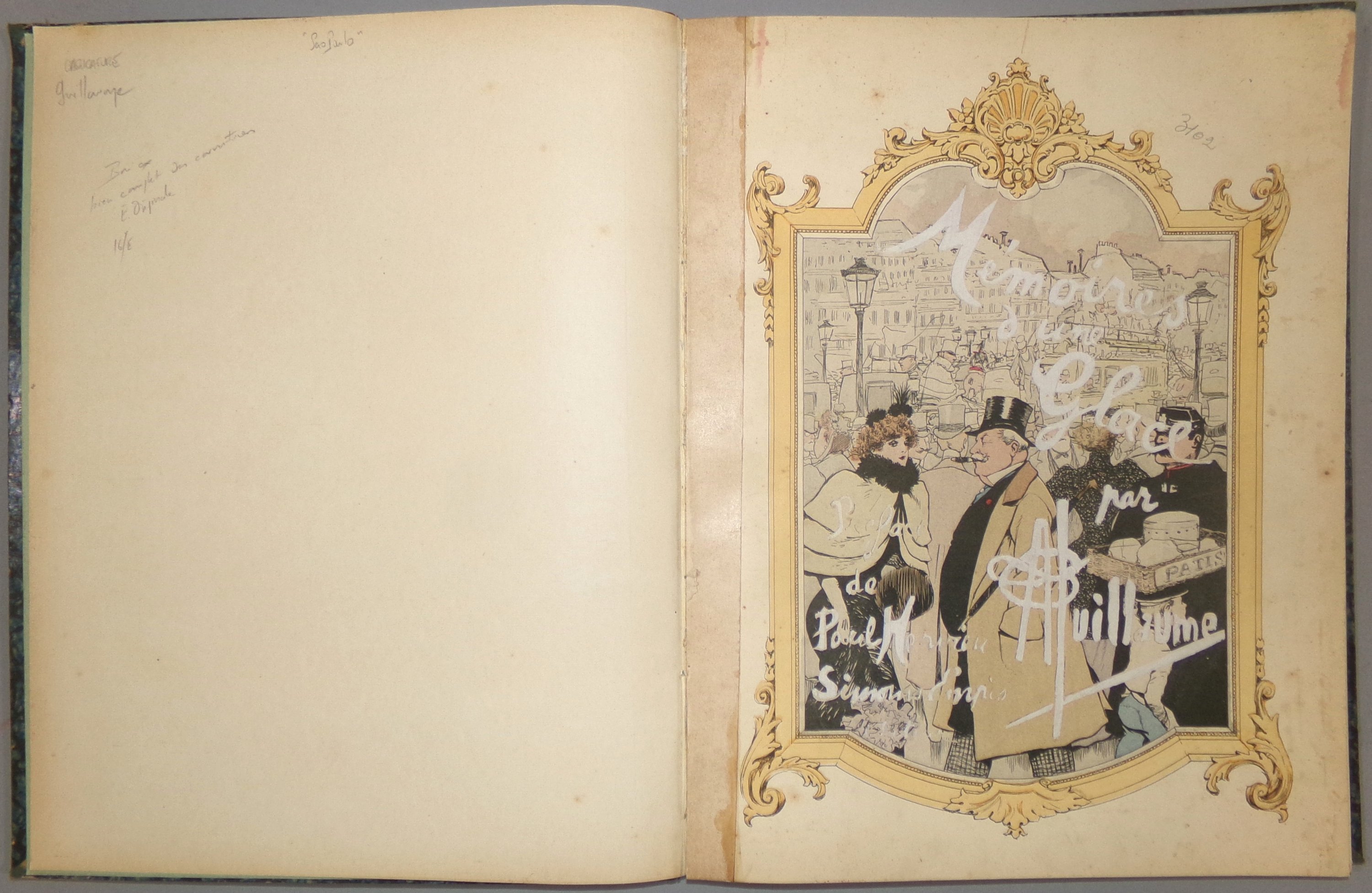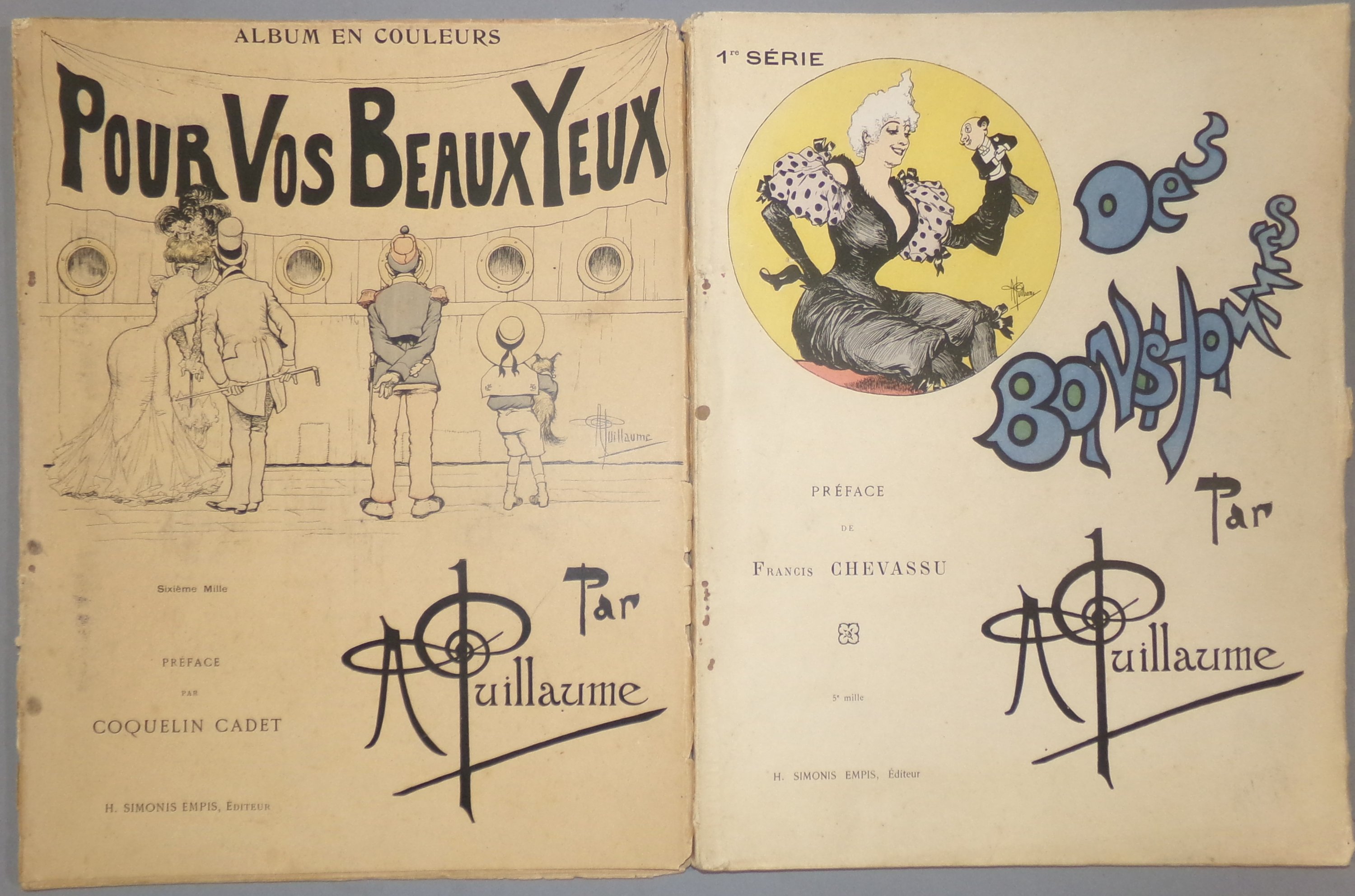 Réunion de 9 albums grand in-4 broch. ou rel. illustrés par des dessins satiriques en couleurs ou en noir d’Albert Guillaume, édités par H. Simonis Empis, Paris, vers 1895-1900 : Mes 28 jours (2 ex.) ; Mon sursis ; Mémoires d’une glace (2 ex.) ; Pour vos beaux yeux ; R’vue d’fin d’année ; Des bonhommes 1ère (2 ex.) et 2ème série.