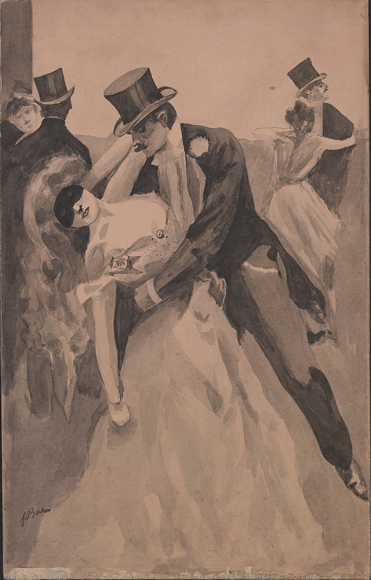 Le bal masqué, lavis, sur carton épais, signé en bas à gauche, 26,5 x 17 cm.