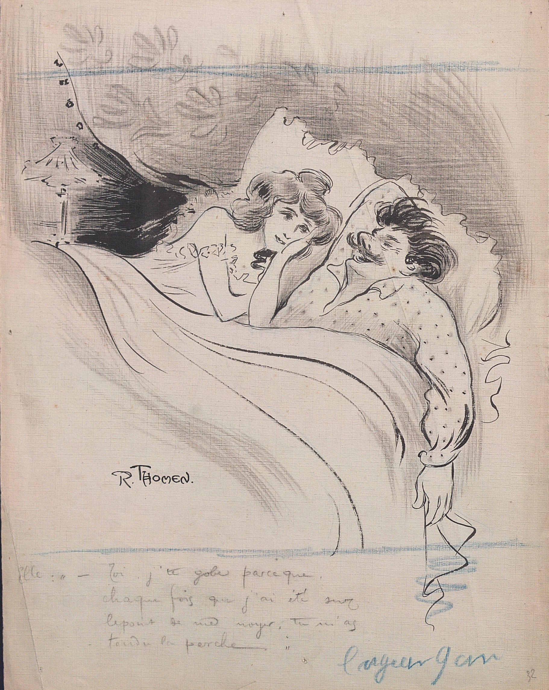 Encre et crayon bleu, signé en bas à droite, légendé au crayon « Tiens mon petit ami voici une pièce de cinq francs ; sois économe et ne la change pas de suite. Soyez tranquille madame je ne la changerai pas : je la dépenserai d’un seul coup », 24 x 31 cm ;