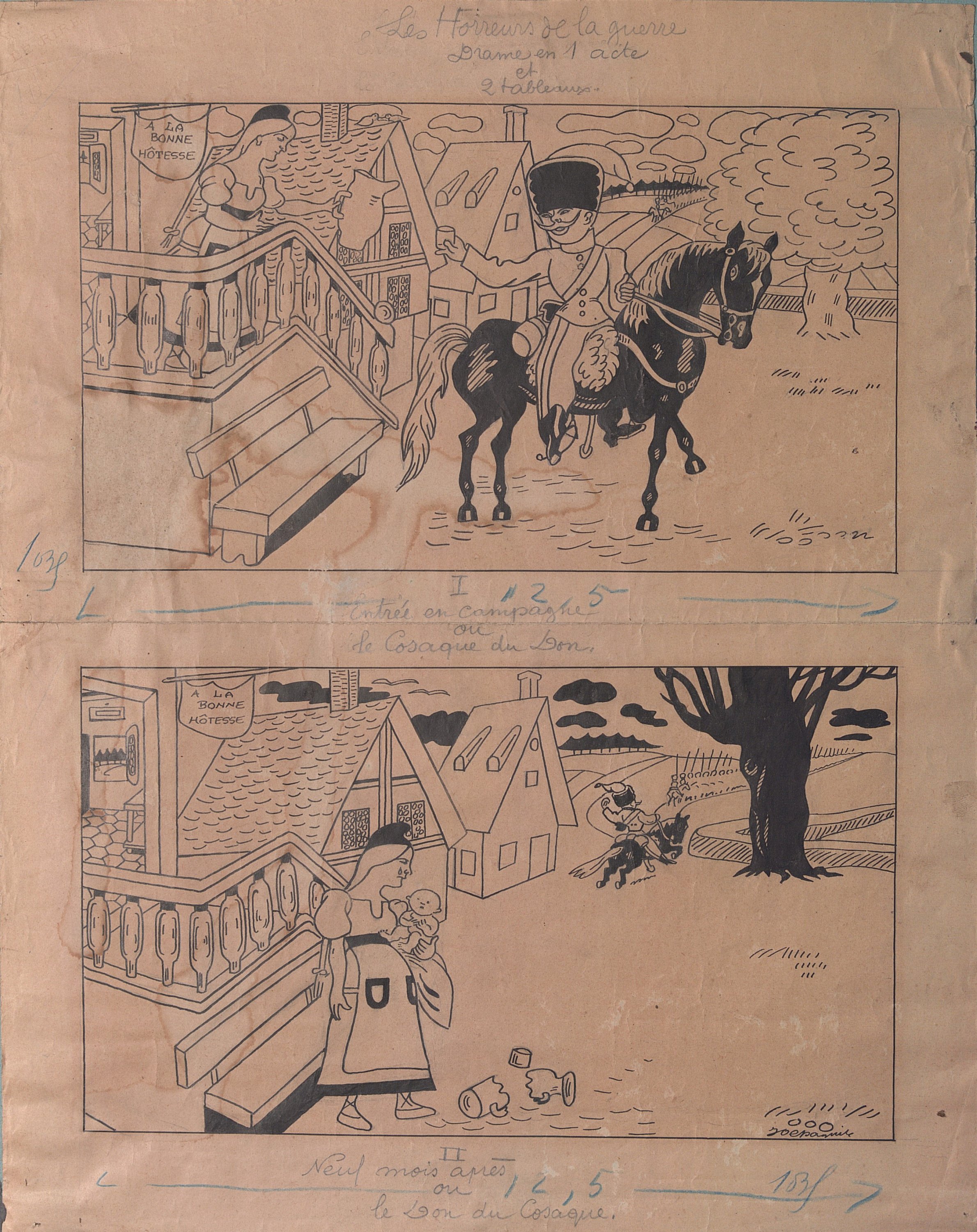 Le drame de la guerre, 2 dessins à l’encre, l’un signé en bas à droite, légendés au crayon (mouillures), 23 x 36 cm ;