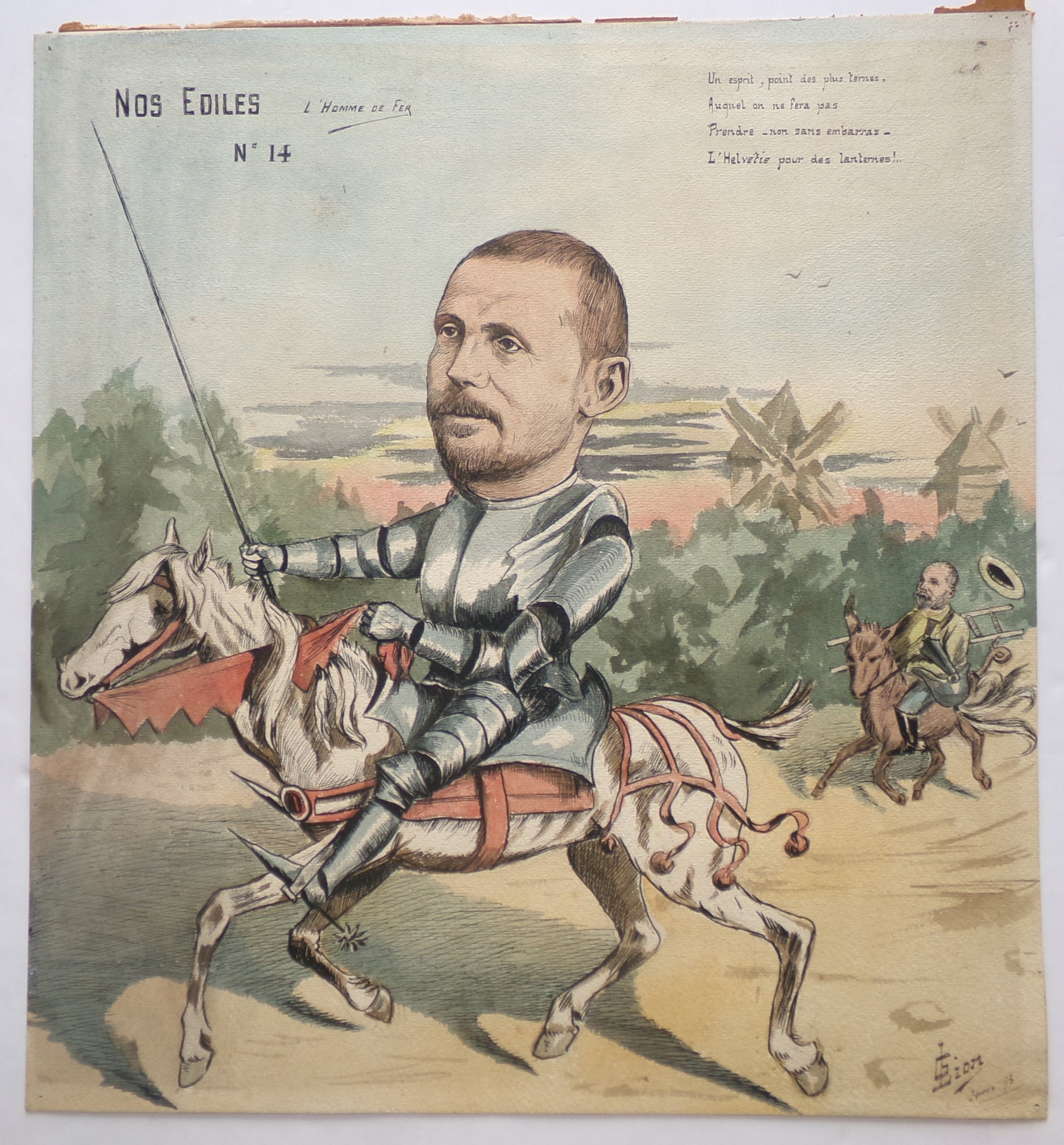 Gabriel Lion, Nos édiles, L’homme de fer, encre et aquarelle, signé et daté janvier 1893 en bas à droite, légendé, 47,5 x 43 cm ;