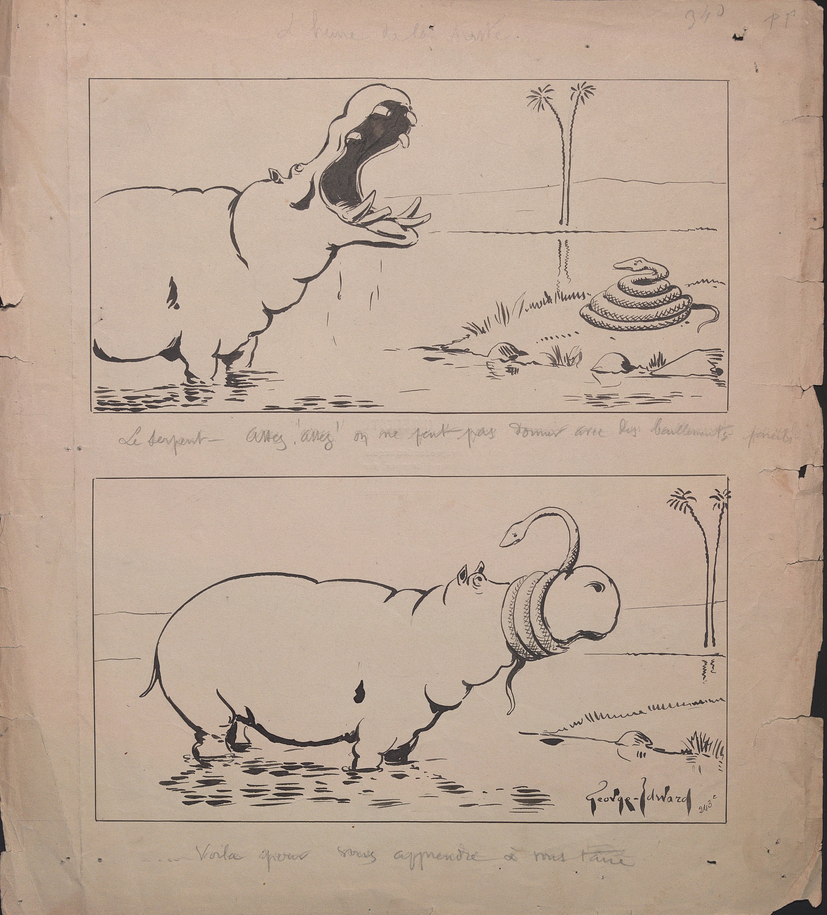 L’heure de la sieste, encre, signé en bas à droite, titrée et légendée au crayon, 36 x 32 cm (petites déchirures en marge) ; dessin destiné à la publication dans le journal Le Pêle-Mêle.