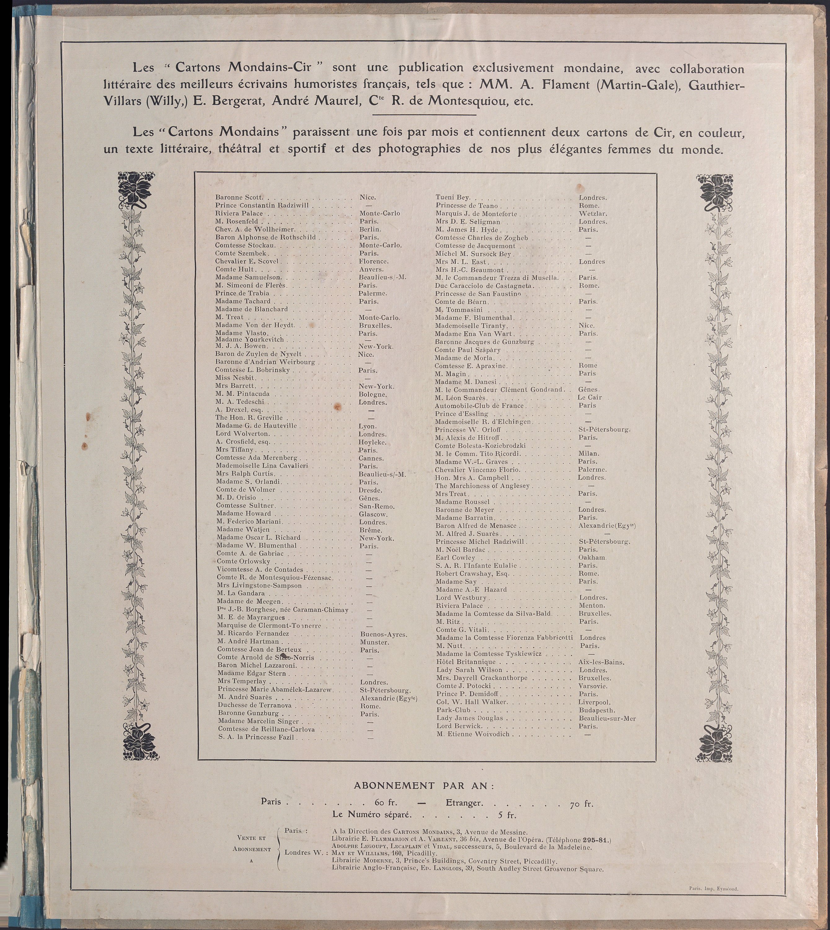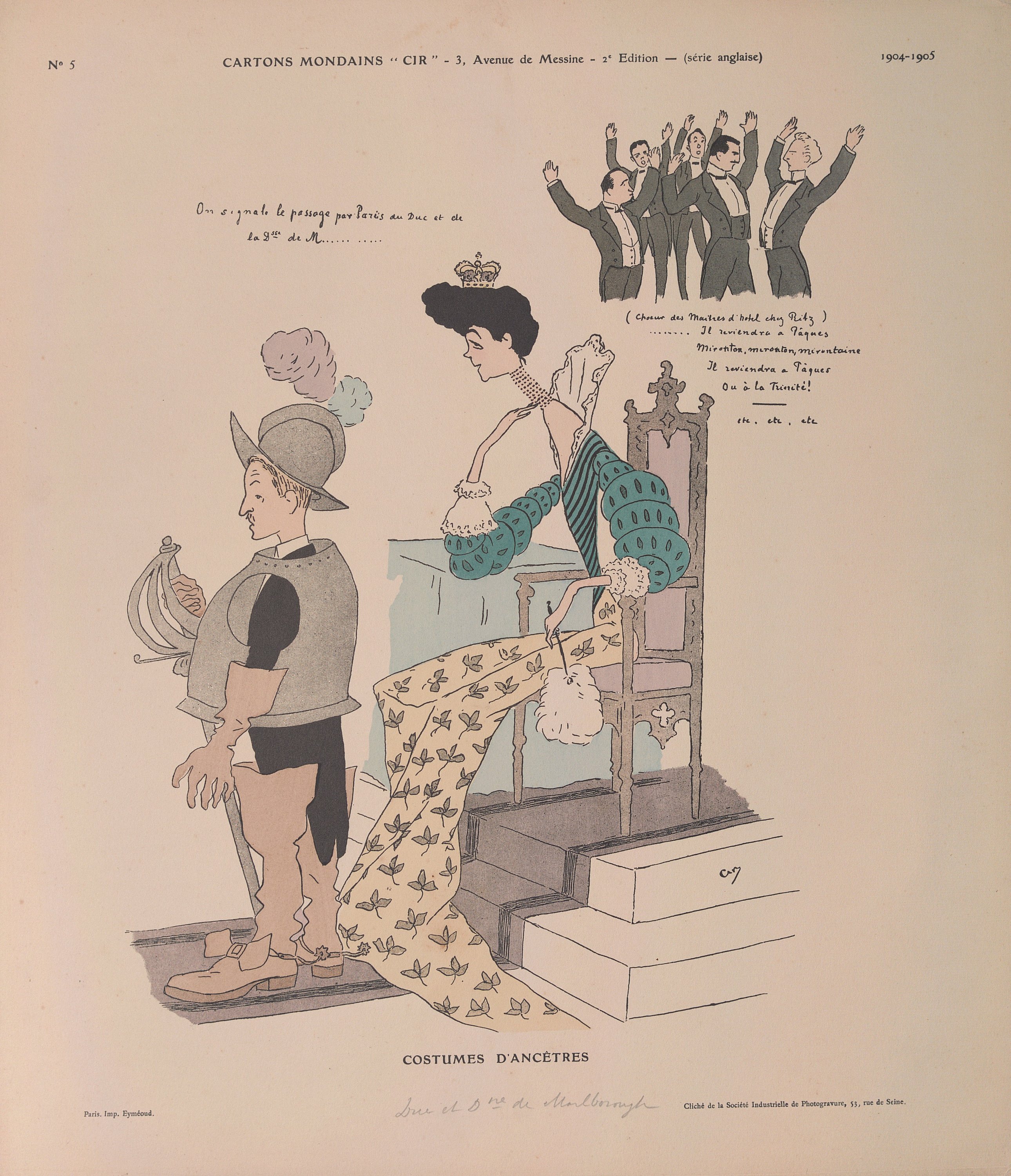 Elles représentent des personnages composant le gotha de l’époque : princes, aristocrates, hommes d’affaires, etc, dont le duc de Devonshire devant l’Hôtel de Paris à Monte-Carlo ; le grand-duc Michel de Russie au Golf-Club à Cannes ; le Maharaja Duleep Singh à Monte-Carlo ; le duc et la duchesse de Marlborough à Paris ; lord et lady de Grey au Carlton restaurant à Londres ; James Gordon Bennet junior homme de presse américain et fils du fondateur du New York Herald ; comte de Montesquiou ; etc. Peu courant (rousseurs éparses)