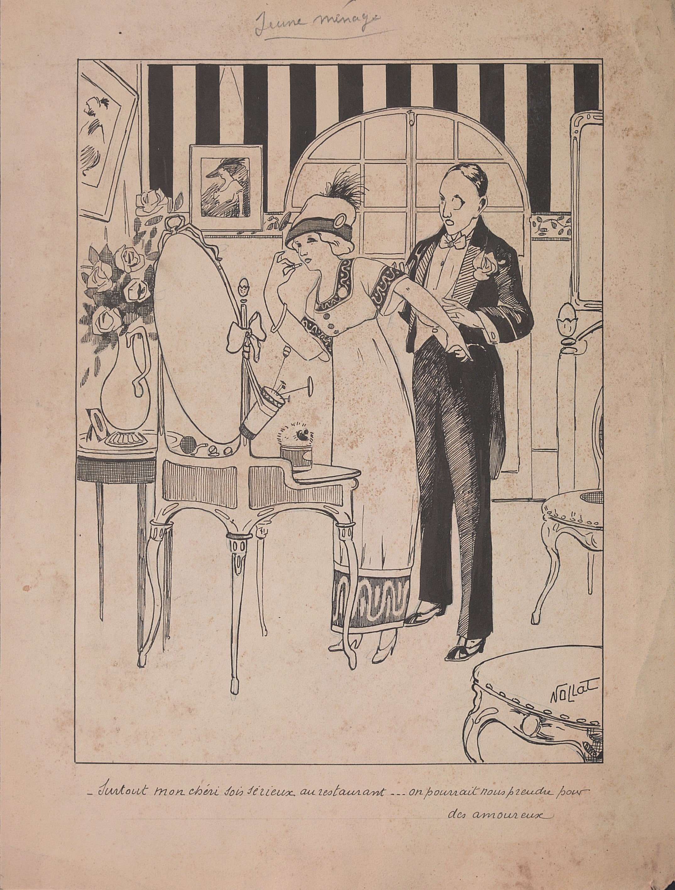 Jeune ménage, encre, signé en bas à droite, titré et légendé « Surtout mon chéri sois sérieux au restaurant on pourrait nous prendre pour des amoureux », 39 x 29 cm (rousseurs) ;