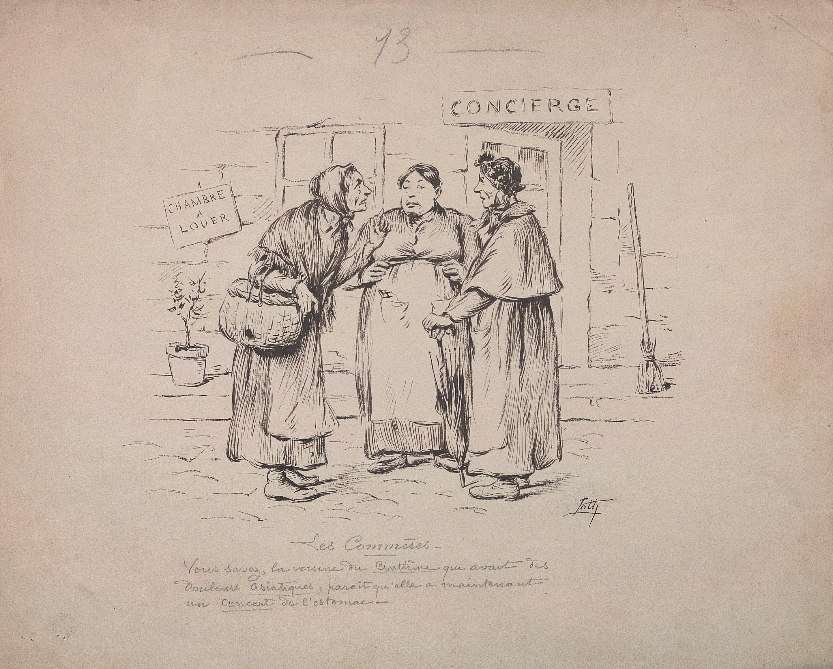 Les commères, encre, signé en bas à droite « Loth », titré et légendé au crayon « Vous savez, la voisine du cintième qui avait des douleurs asiatiques, parait qu’elle a maintenant un concert de l’estomac ! », 32 x 40 cm.