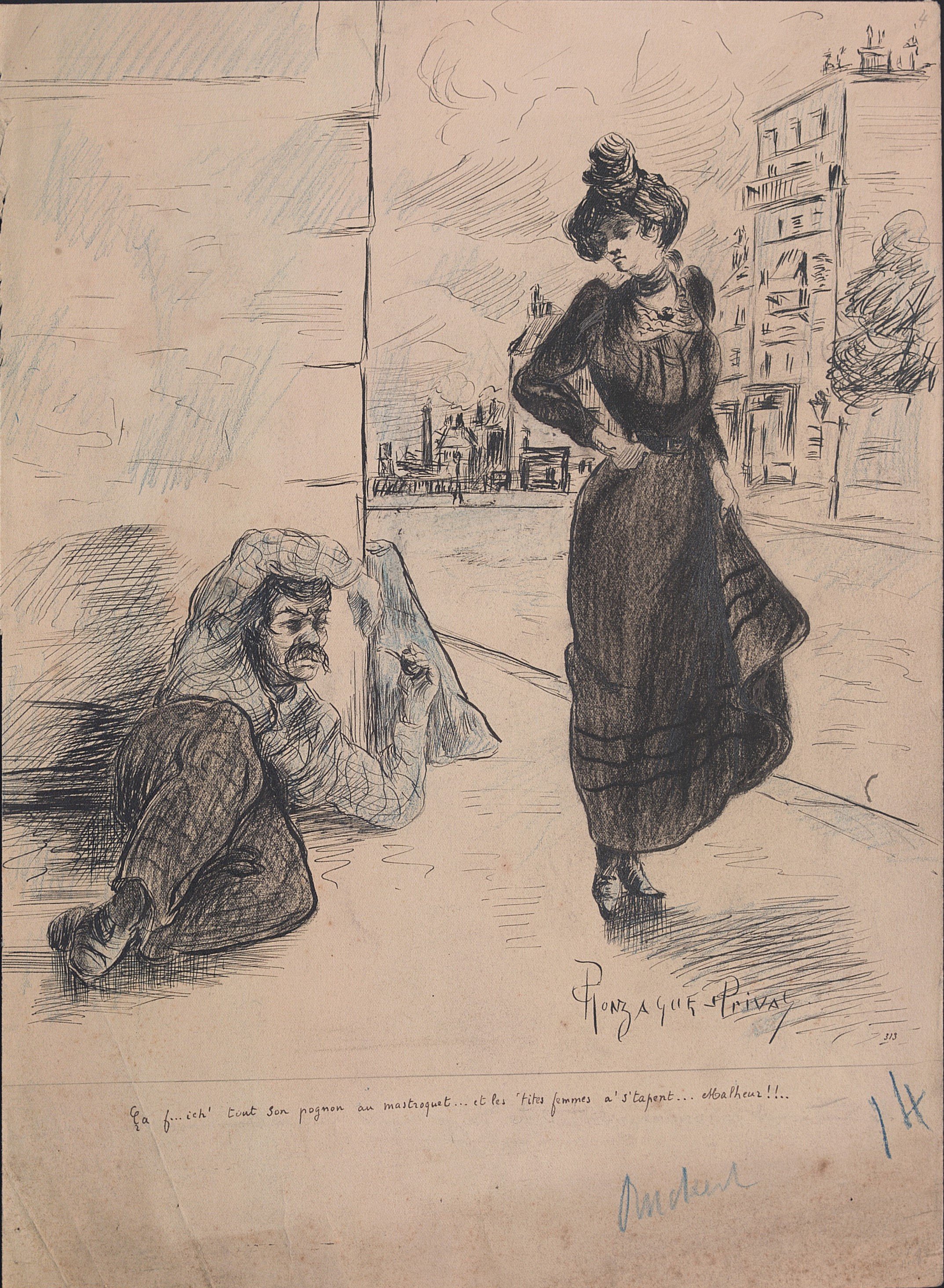 Sans titre, encre, fusain et crayon bleu, signé en bas à droite « P. Gonzague-Privat », légendé « Ca f ich’ tout son pognon au mastroquet et les tites femmes à s’tapent Malheur !! », 41 x 29 cm ;
