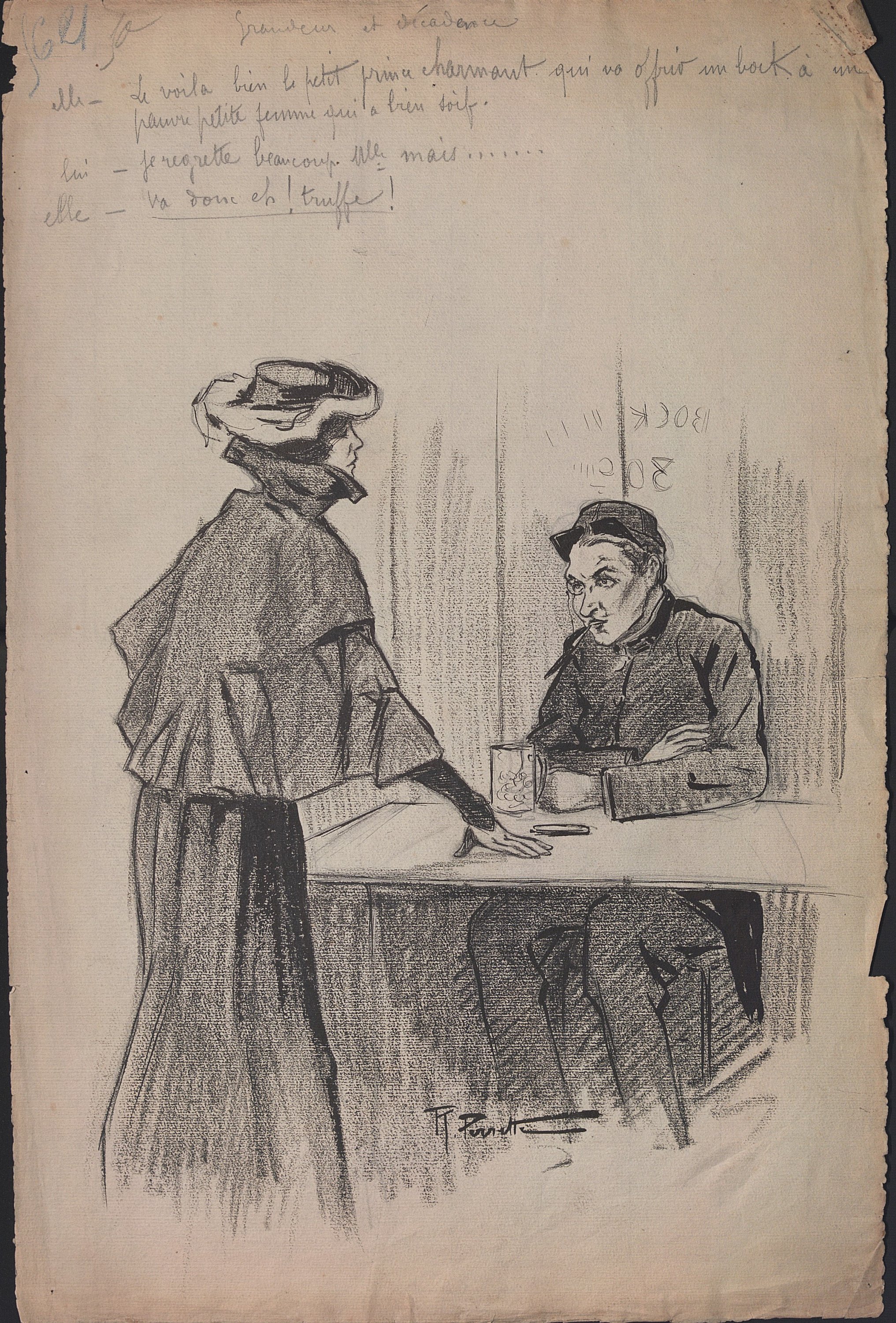 Grandeur et décadence, fusain et encre, signé en bas, titré et légendé au crayon : « Le voilà bien le petit prince charmant qui va offrir un bock à une pauvre petite femme qui a bien soif. - Je regrette beaucoup Melle mais - Va donc eh ! truffe ! », 47,5 x 32 cm (petites déchirures en marge) ;