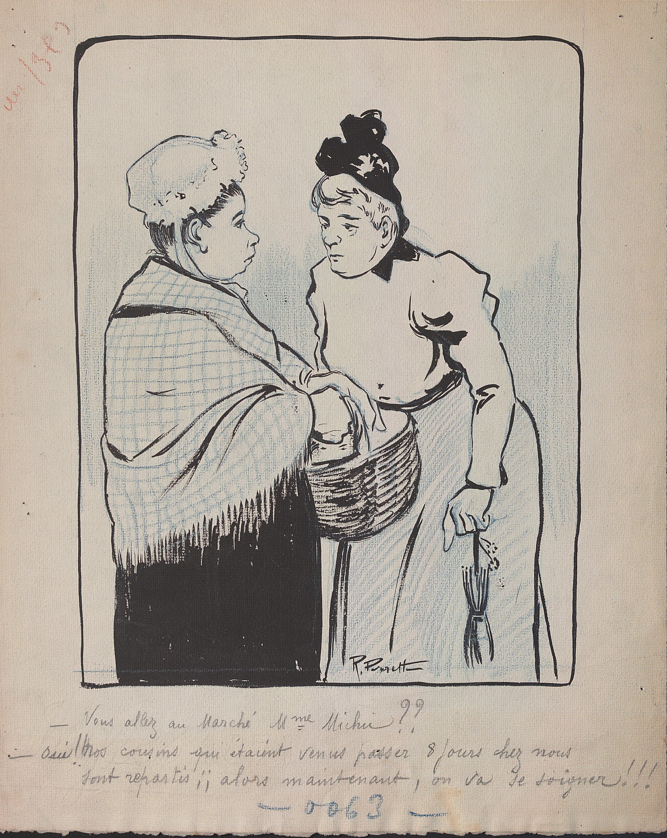 Sans titre, encre et rehauts de crayon bleu, signé, légendé au crayon « - Vous allez au marché Mme Michu ?? Oui ! nos cousins qui étaient venus passer 8 jours chez nous sont repartis ; alors maintenant on va se soigner !! », 37 x 29,5 cm.