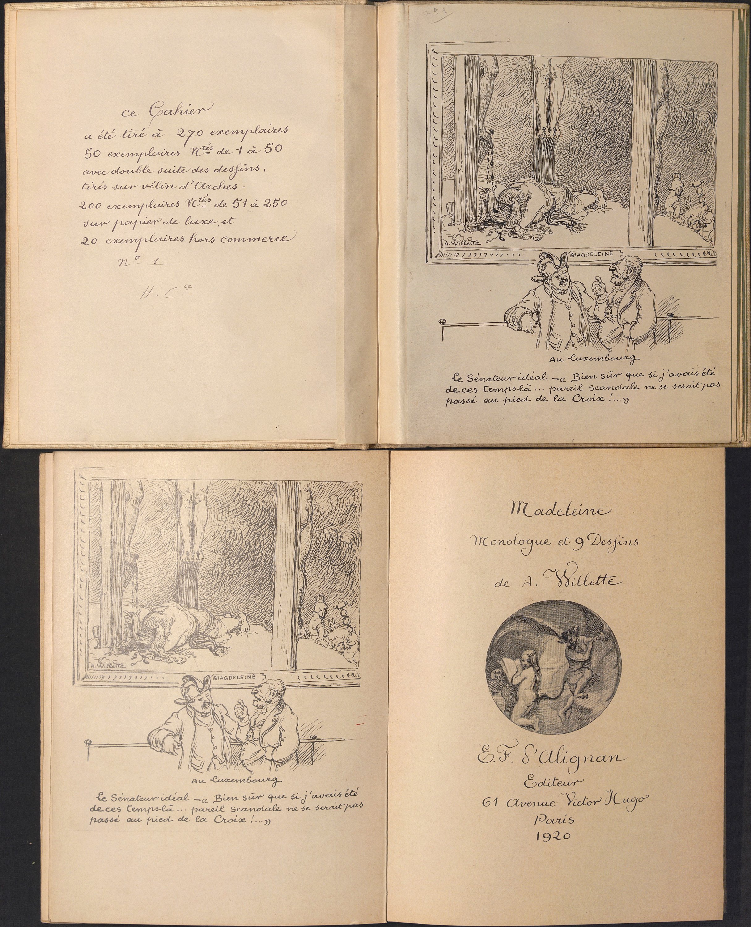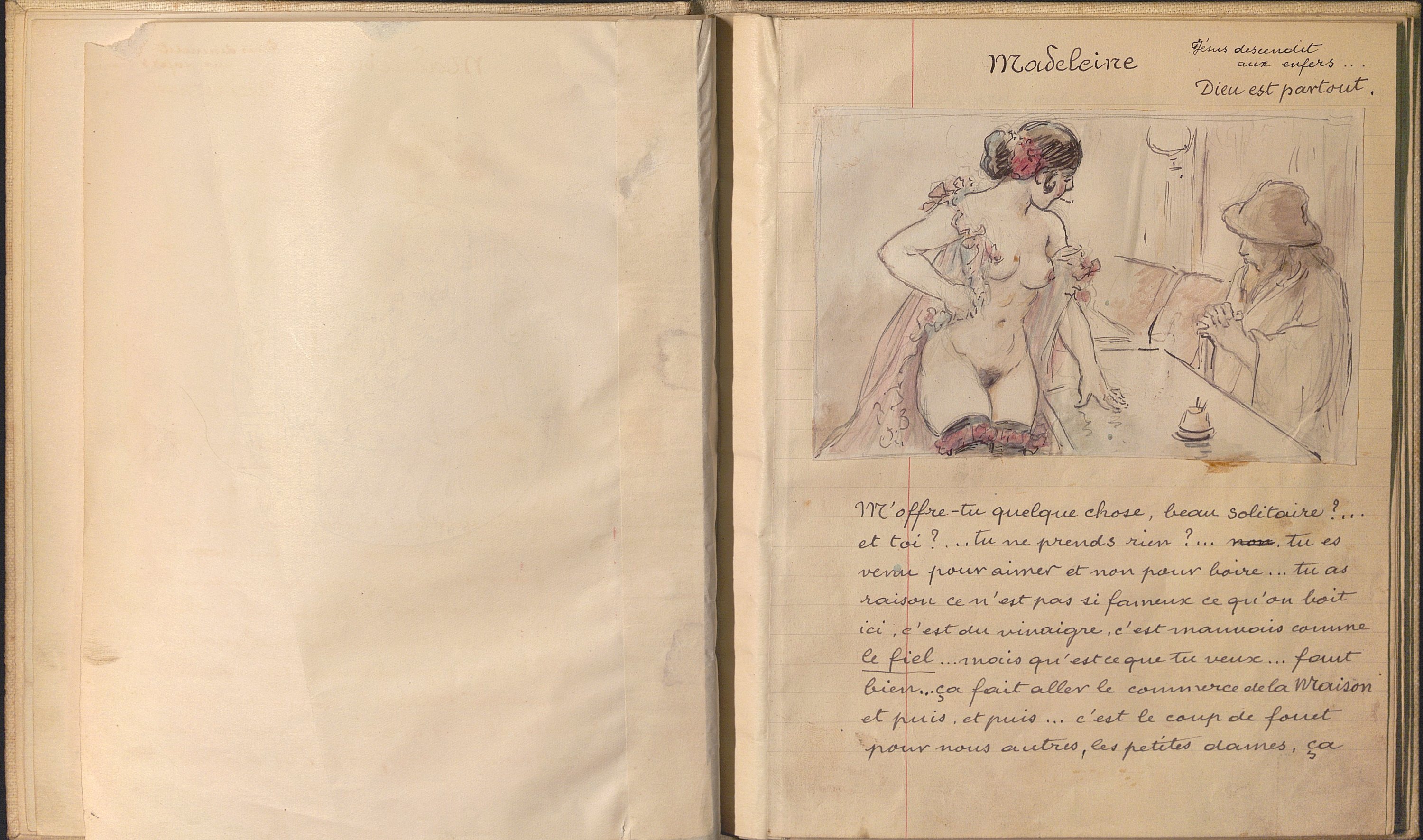 Madeleine, Monologue et 9 dessins. Manuscrit autographe avec dessins à l’encre et rehauts de crayons de couleurs contrecollés. In-8, 10 pp., montées sur onglet, toile blanche. Maquette pour l’édition en fac-similé, signée et datée en fin « Les Epinettes, 31 juillet 1911 ». Il est illustré de 9 dessins à la plume dont 5 rehaussés à l’aquarelle et au lavis.