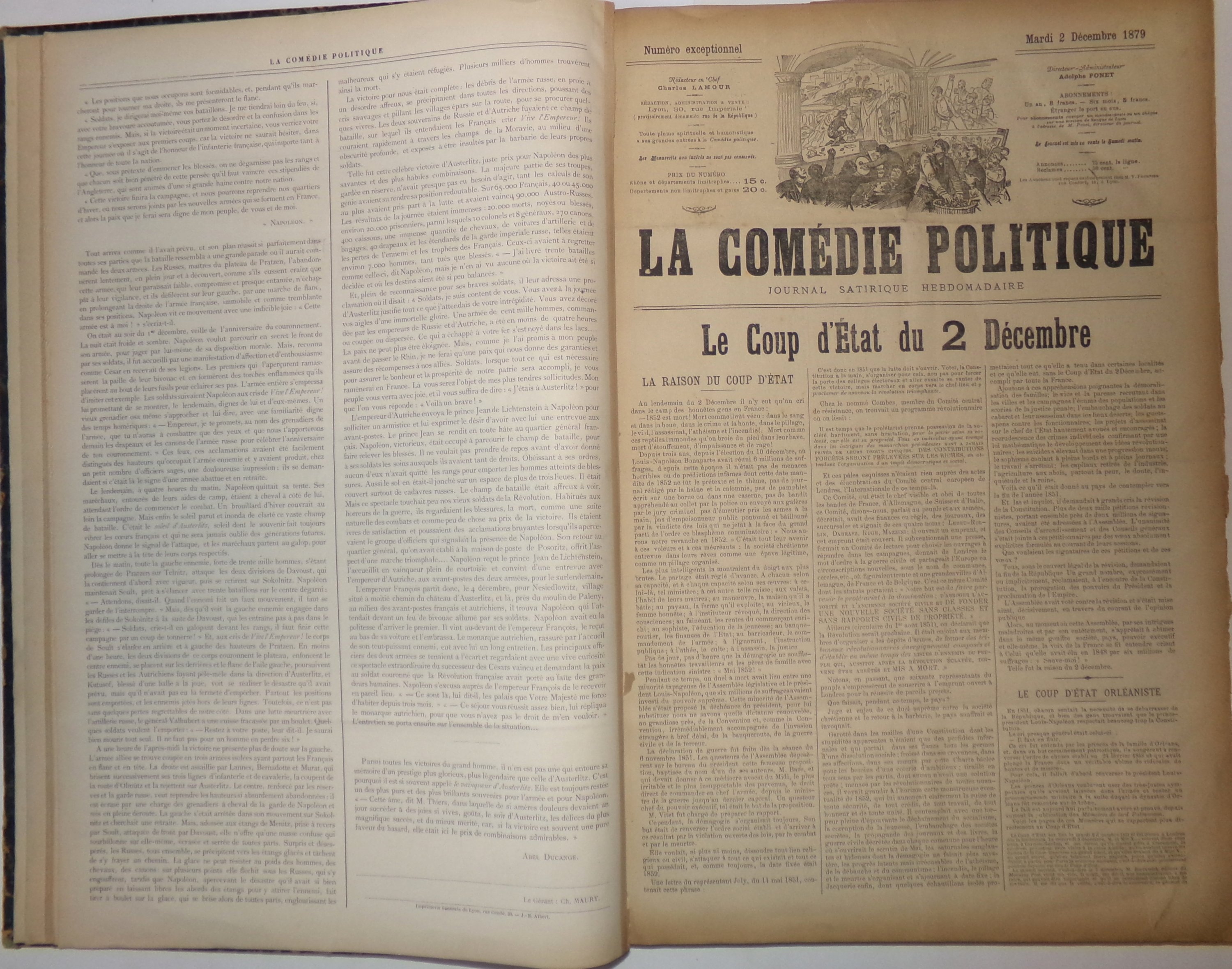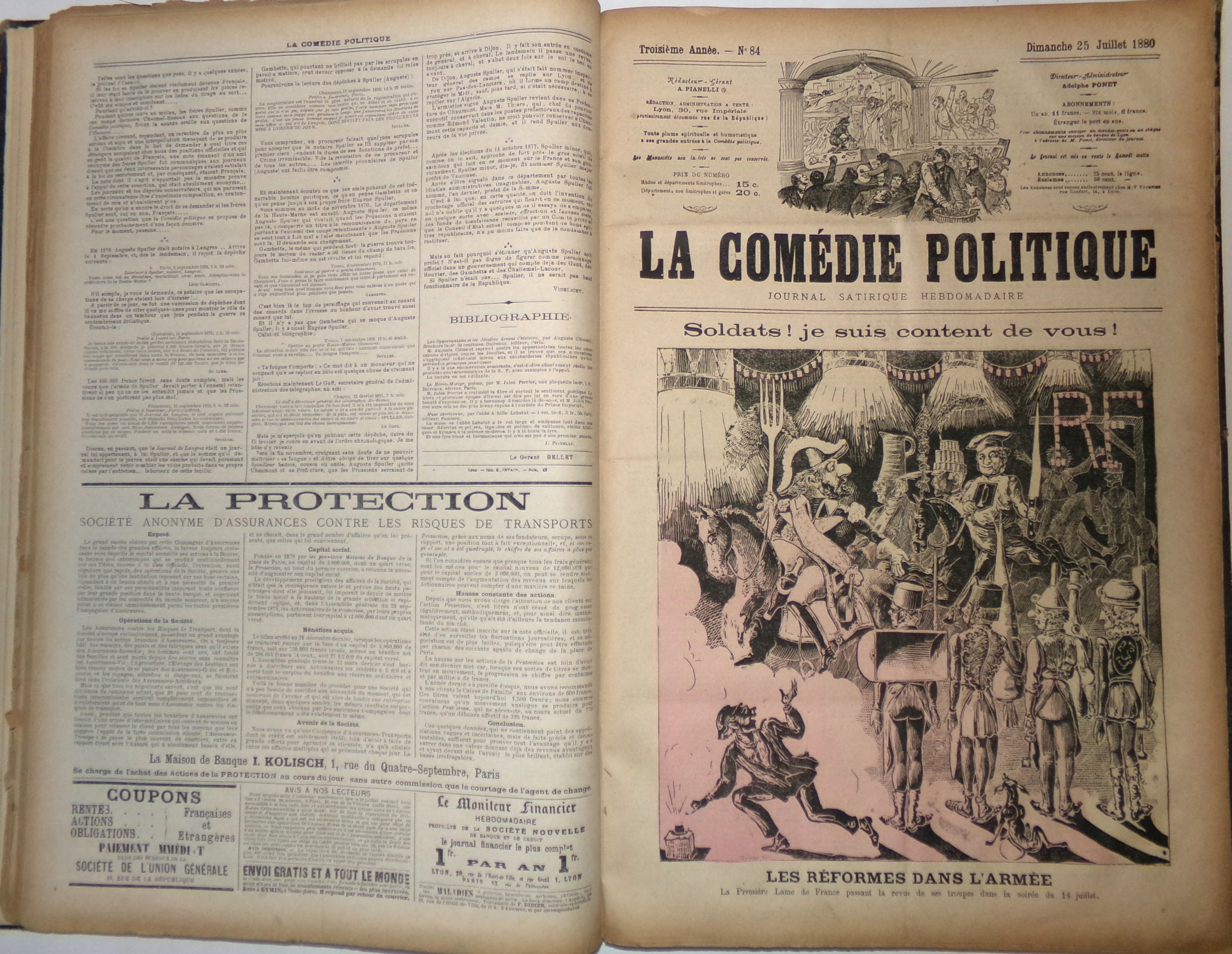 La Comédie politique est un journal fondé en 1871 à Lyon par Adolphe Ponet (1837-1900), ancien typographe devenu journaliste, et membre du Comité impérialiste lyonnais. Initialement pro-Bonapartiste, La Comédie politique est fortement anti-républicaine et ne manque pas de critiquer la mise en oeuvre de la IIIème République sous la présidence de Jules Grévy. La succession des ministres et les remaniements consécutifs du gouvernement dans les années 1880 à 1890 (Ferry, Gambetta, Freycinet) sont l'objet de ses railleries et alimentent les caricatures attractives qui font la Une du journal. De nombreuses interruptions, notamment dues à des procès et à l'emprisonnement de son fondateur.