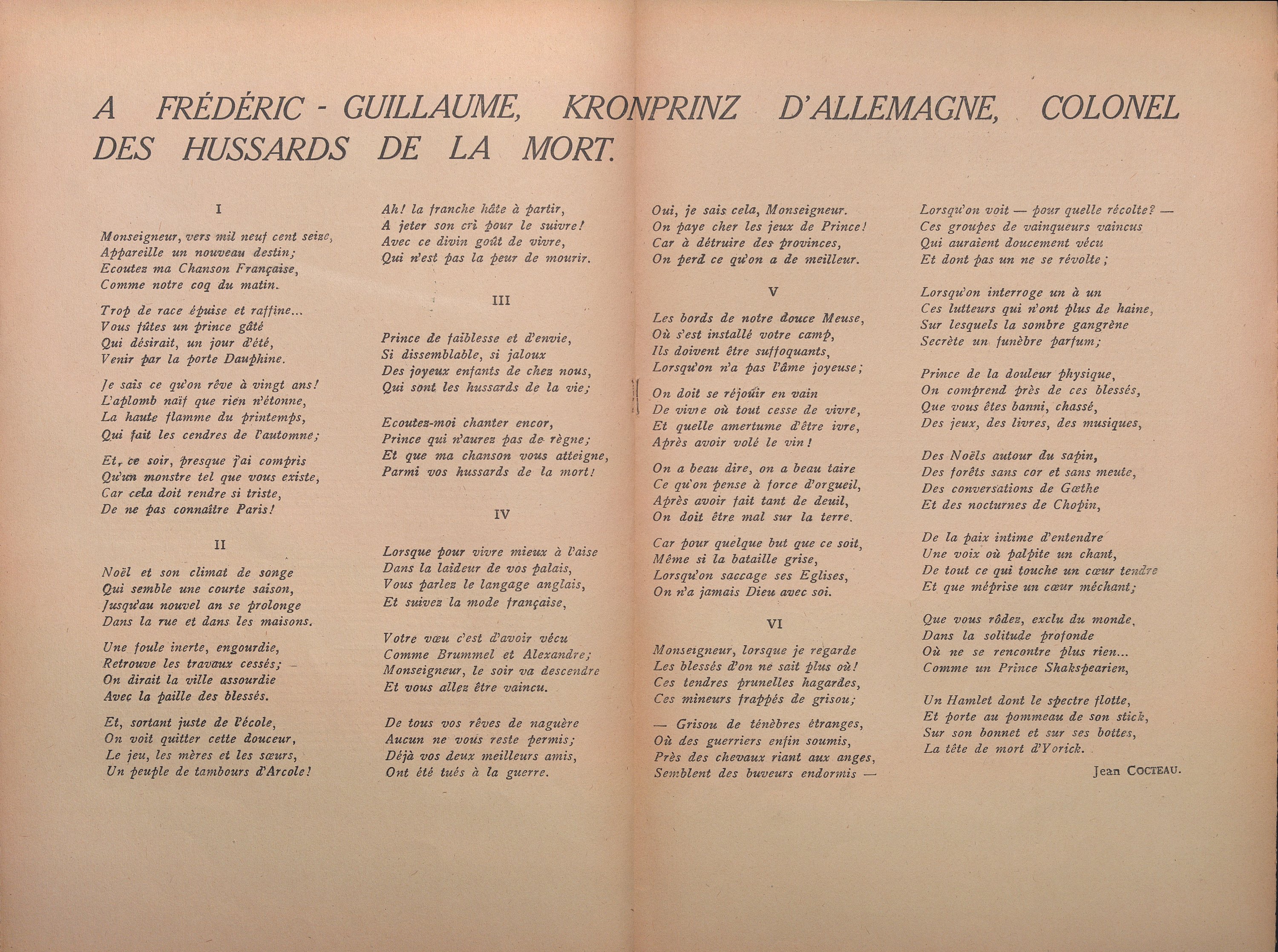 Rare et bel ensemble de cette revue satirique et patriotique, anti-allemande, dirigée par Paul Iribe en collaboration avec Jean Cocteau, que les deux amis, réformés pour raison de santé, fondèrent pour participer à l’effort de guerre.