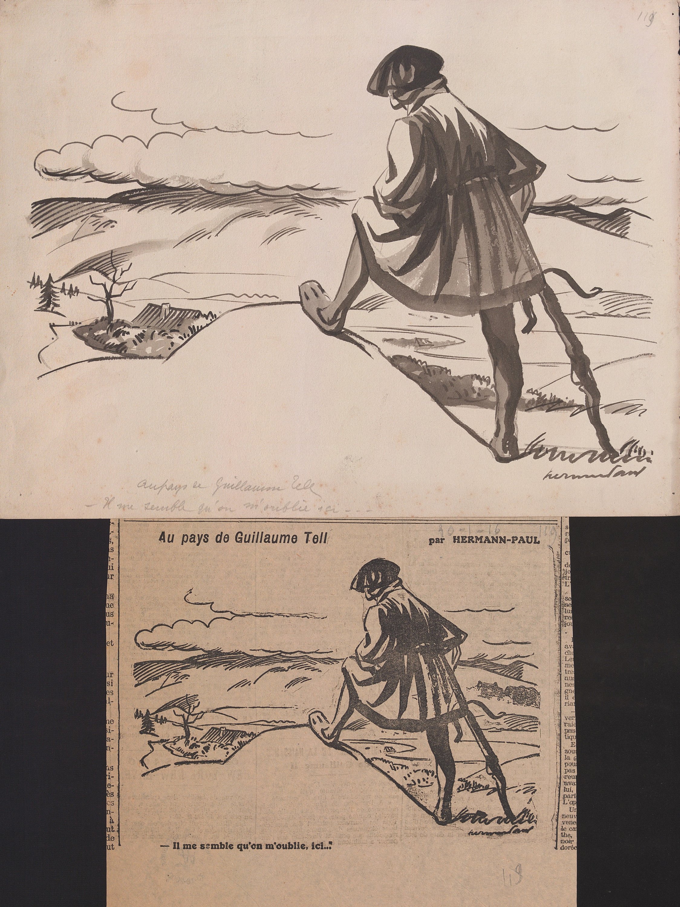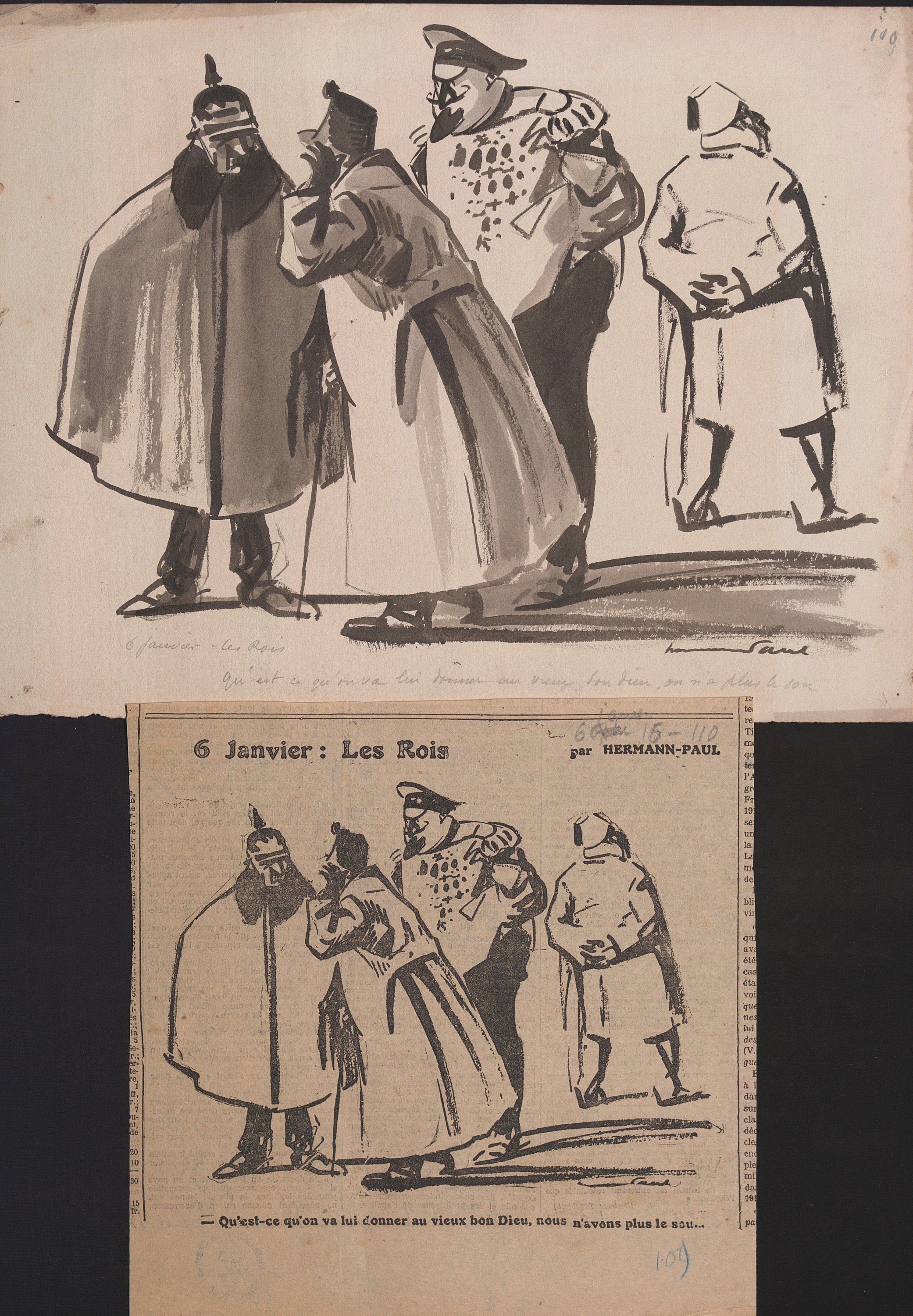 Longtemps défenseur de la paix, antimilitariste, anticolonialiste, Hermann-Paul bascule durant la Grande guerre dans le patriotisme exacerbé et un bellicisme anti-boche, les meurtrissures subies par la population des premiers mois du conflit ayant profondément heurté ses convictions pacifistes. Artiste engagé, ses dessins sont reconnaissables par leur facture minimaliste et au style épuré, influencé par les Nabis, « une synthèse puissante où ne subsiste que l’essentiel, la disparition du détail, le trait ferme, net, précis, volontaire » selon Raymond Geiger.
