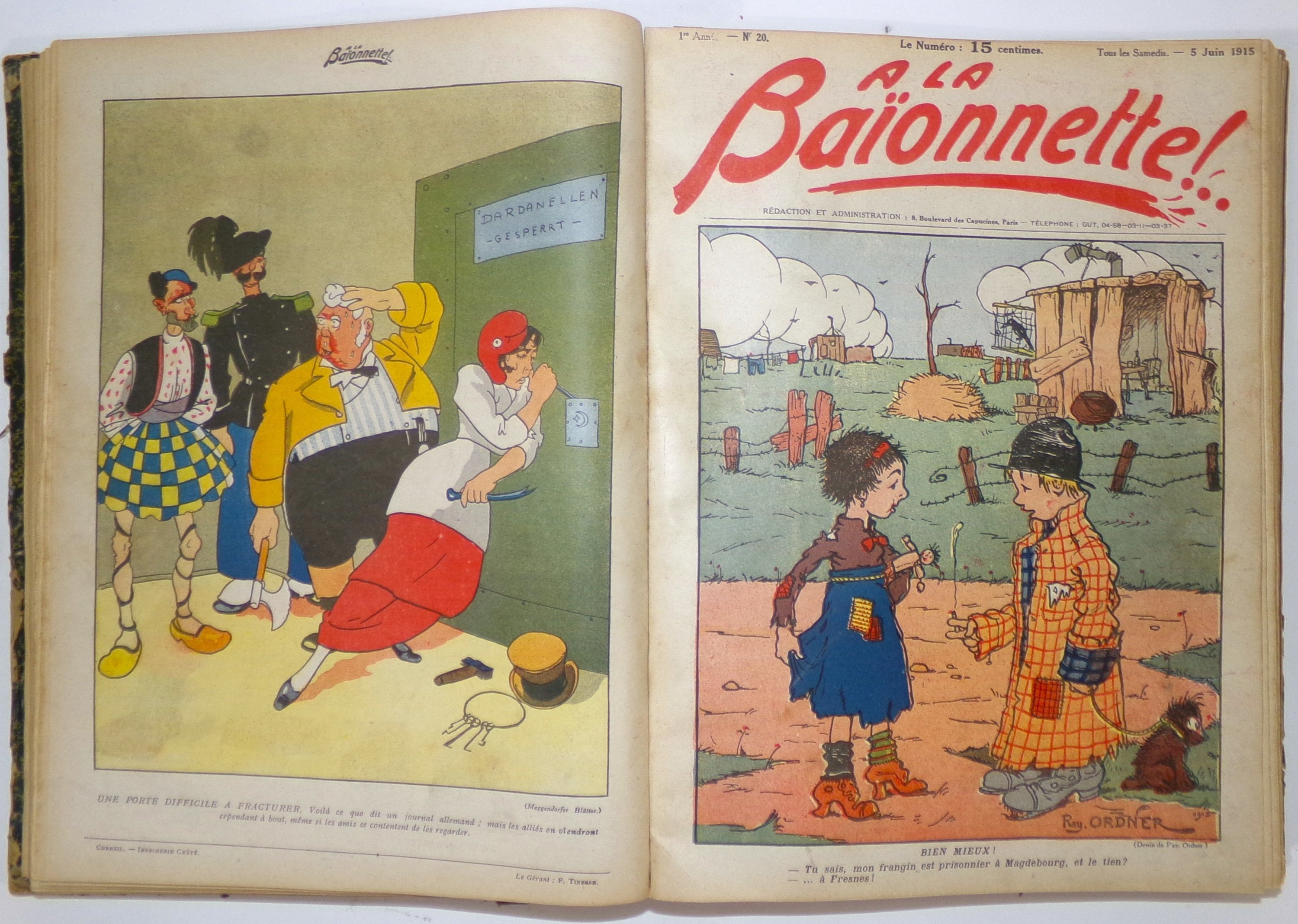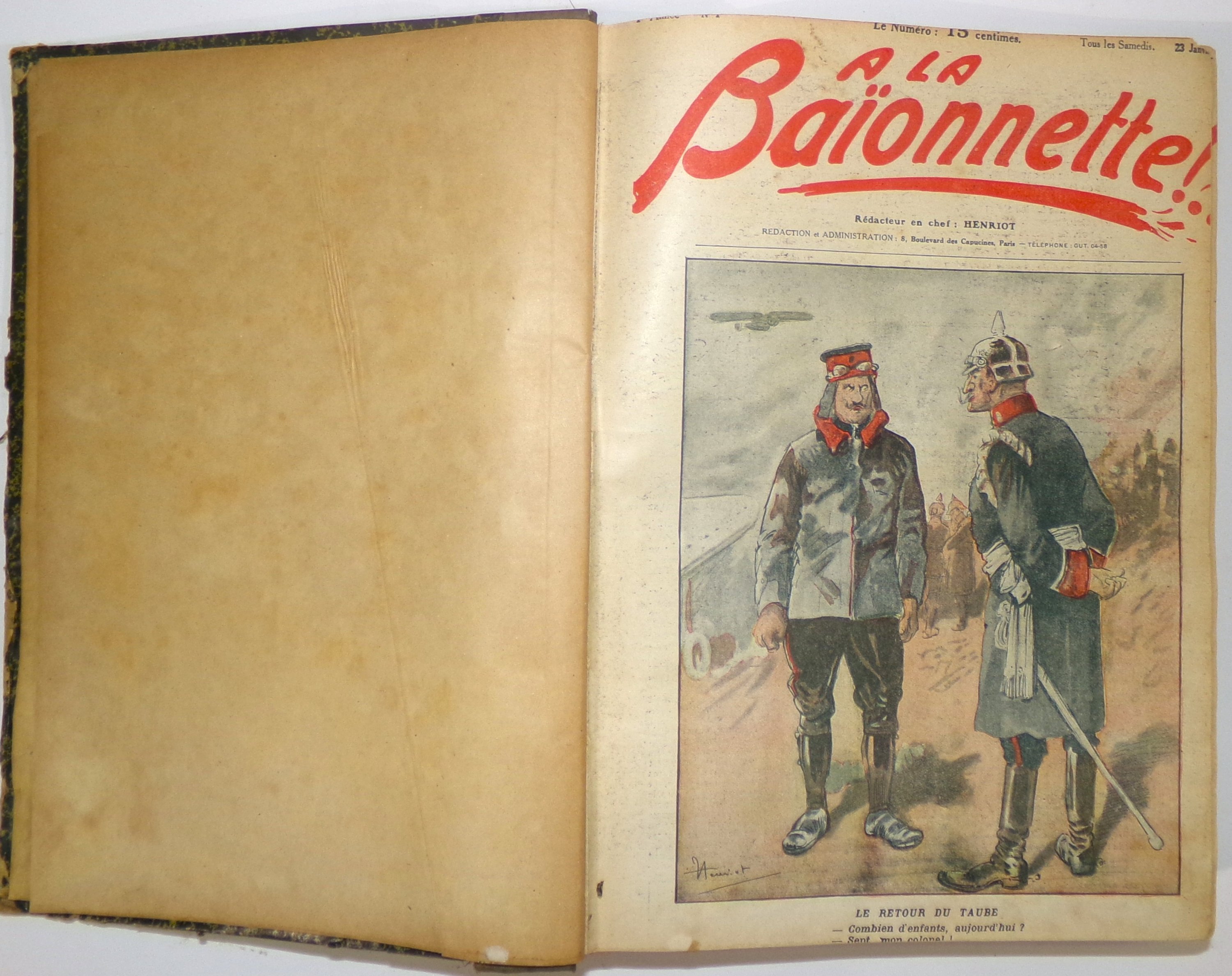 (1 vol.) « A La Baïonnette » : n°1 (23 janvier 1915) au n°23 (26 juin 1915) (mque 8) ; « A la Baïonnette » nouvelle série : n°1 (8 juil. 1915) au n°4 (29 juil. 1915) (mque 5) ; « La Baïonnette », n°6 (12 août 1915) au n°20 (18 nov. 1915), incomplet ;