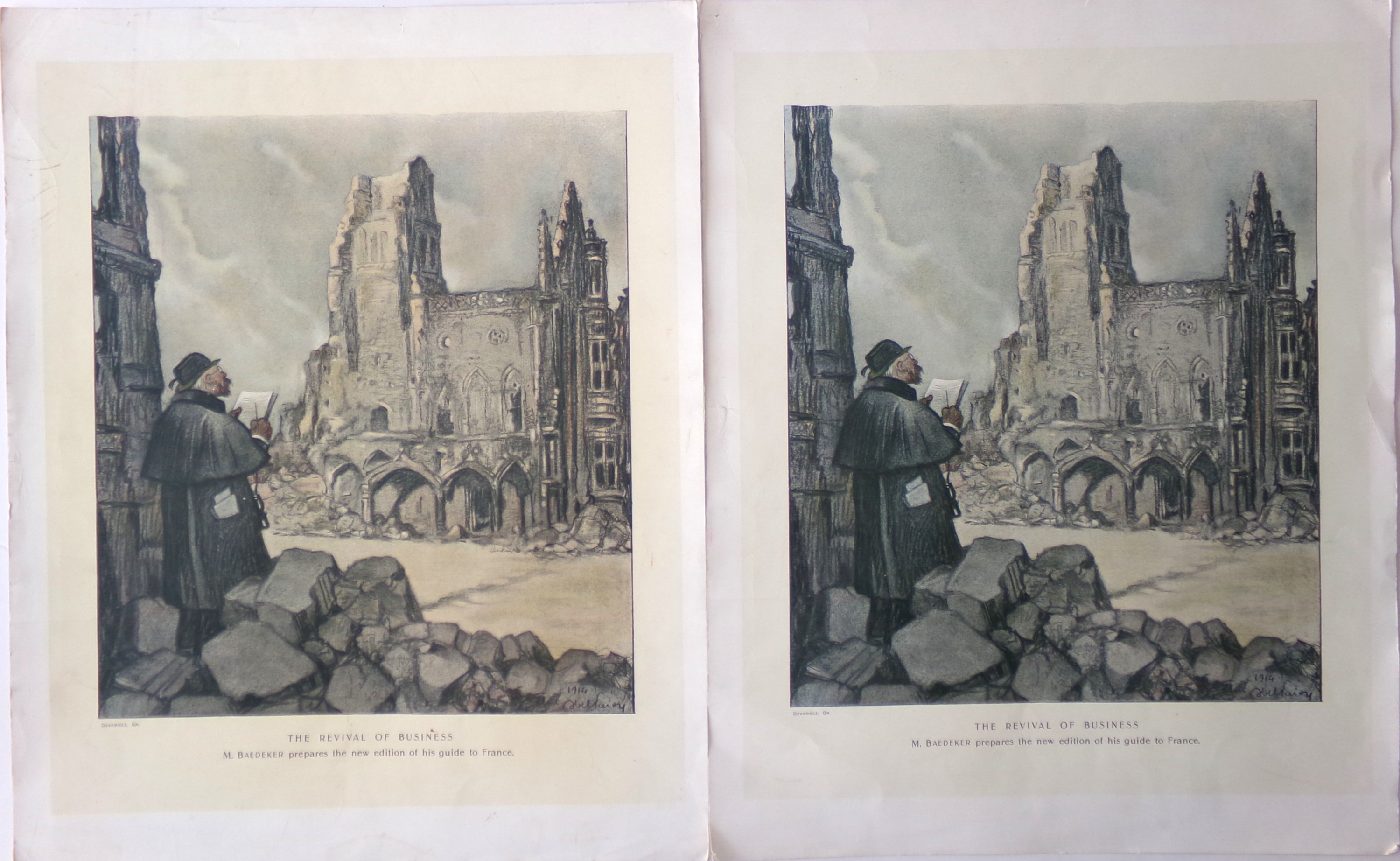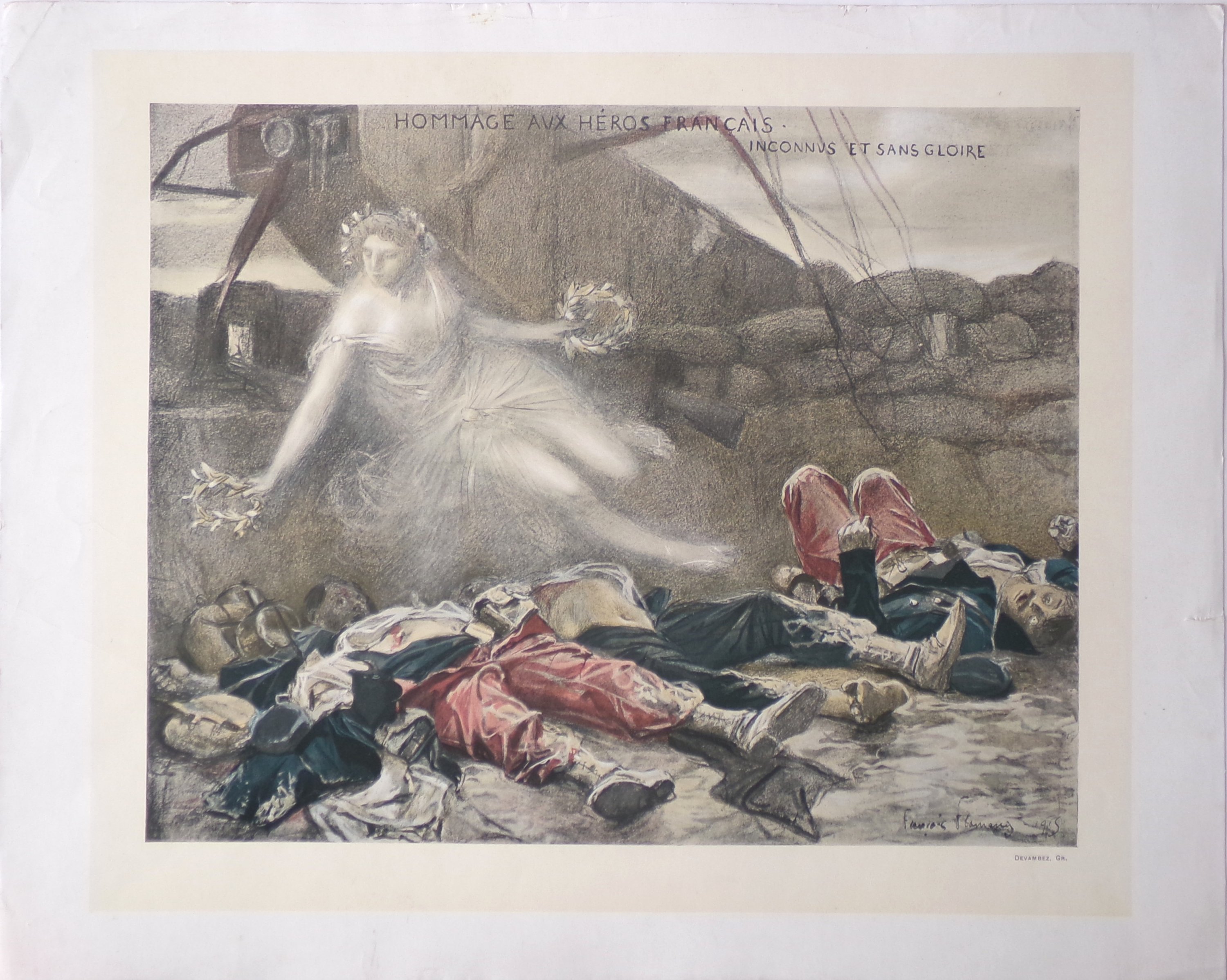 Réunion de 7 planches imprimées par procédé mécanique par Devambez à Paris, 50 x 40 cm (qqs accdts en marge) : L’Enfant au petit drapeau par Abel Faivre (3 ex.) ; La reprise des affaires (The revival of business) par Abel Faivre (2 ex.) ; Chant des Girondins par Adolphe-Léon Willette ; Hommage aux héros français inconnus et sans gloire par François Flameng.