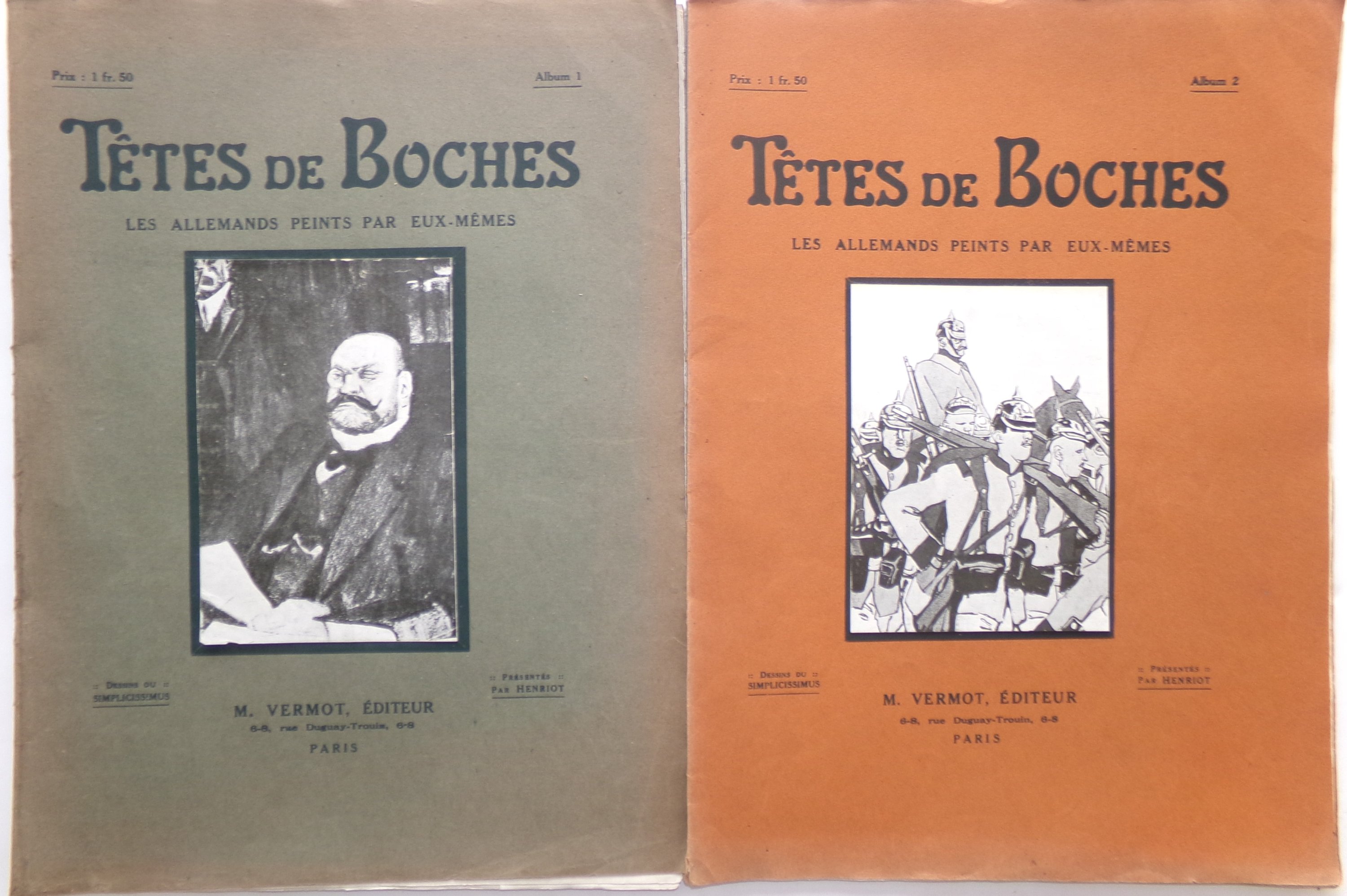 Têtes de Boches, les Allemands peints par eux-mêmes. Dessins du Simplicissimus, présentés par Henriot. Paris, Vermot édit., [entre 1916 et 1918]. 3 fascicules in-fol. ;