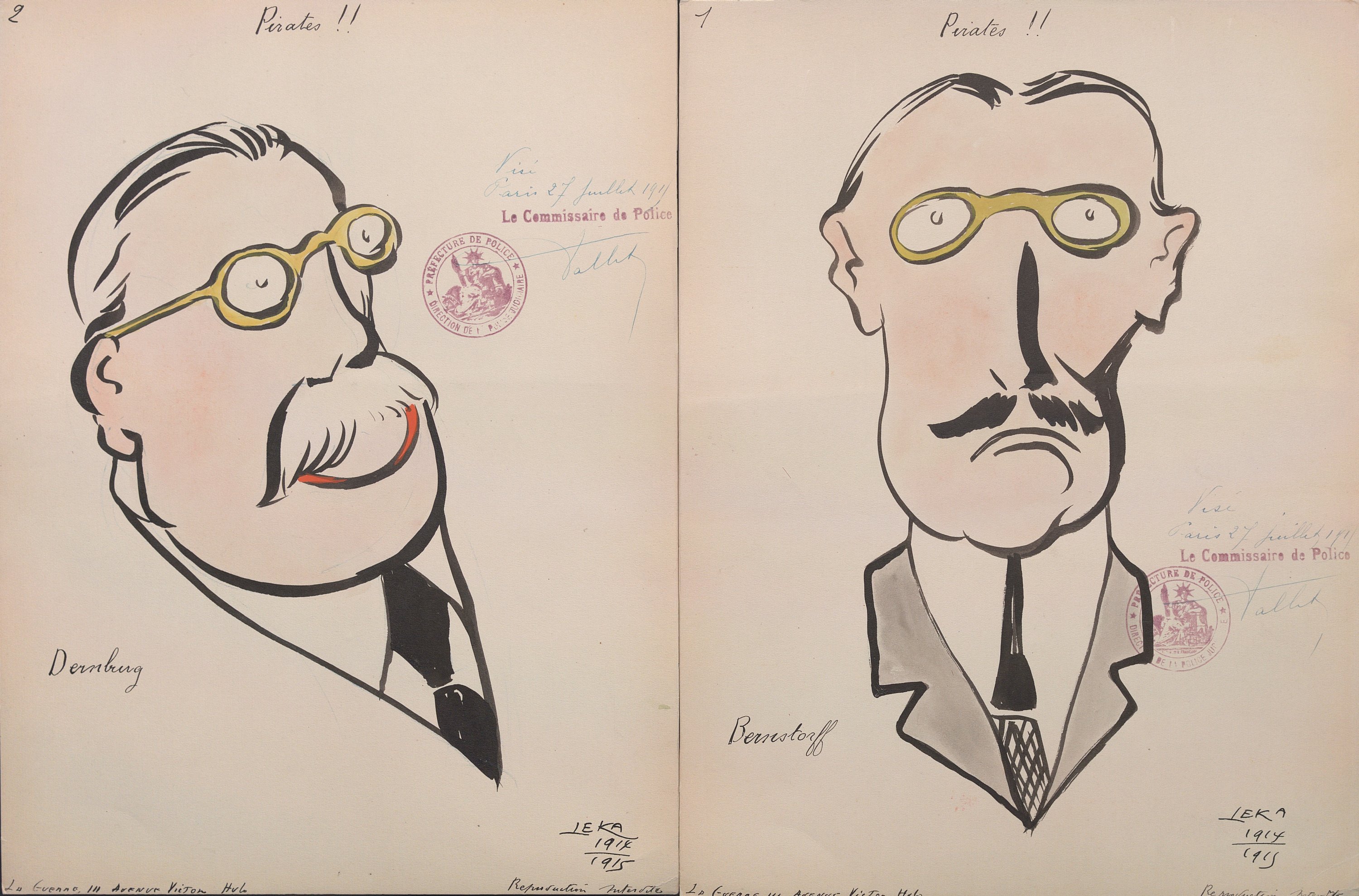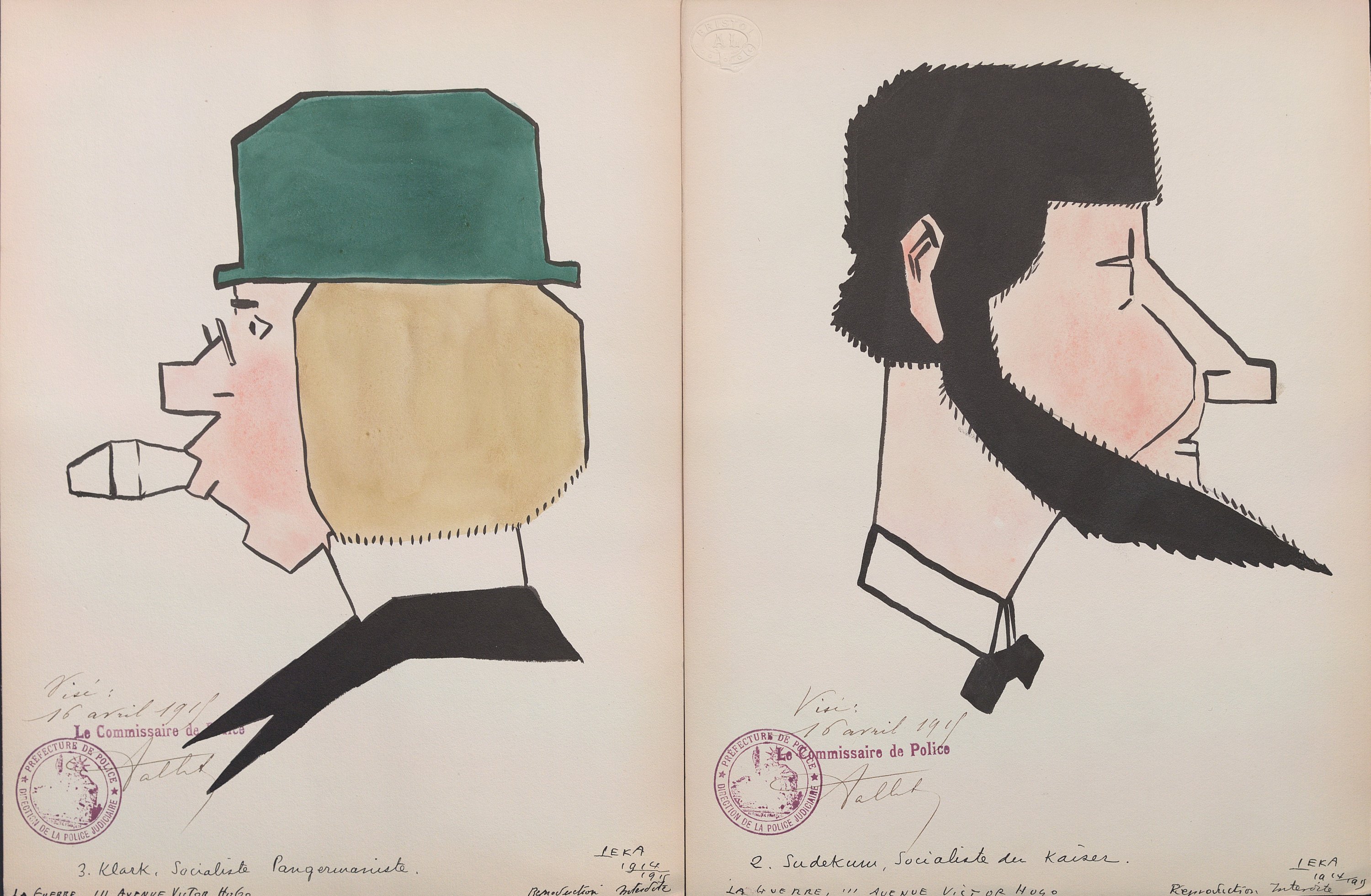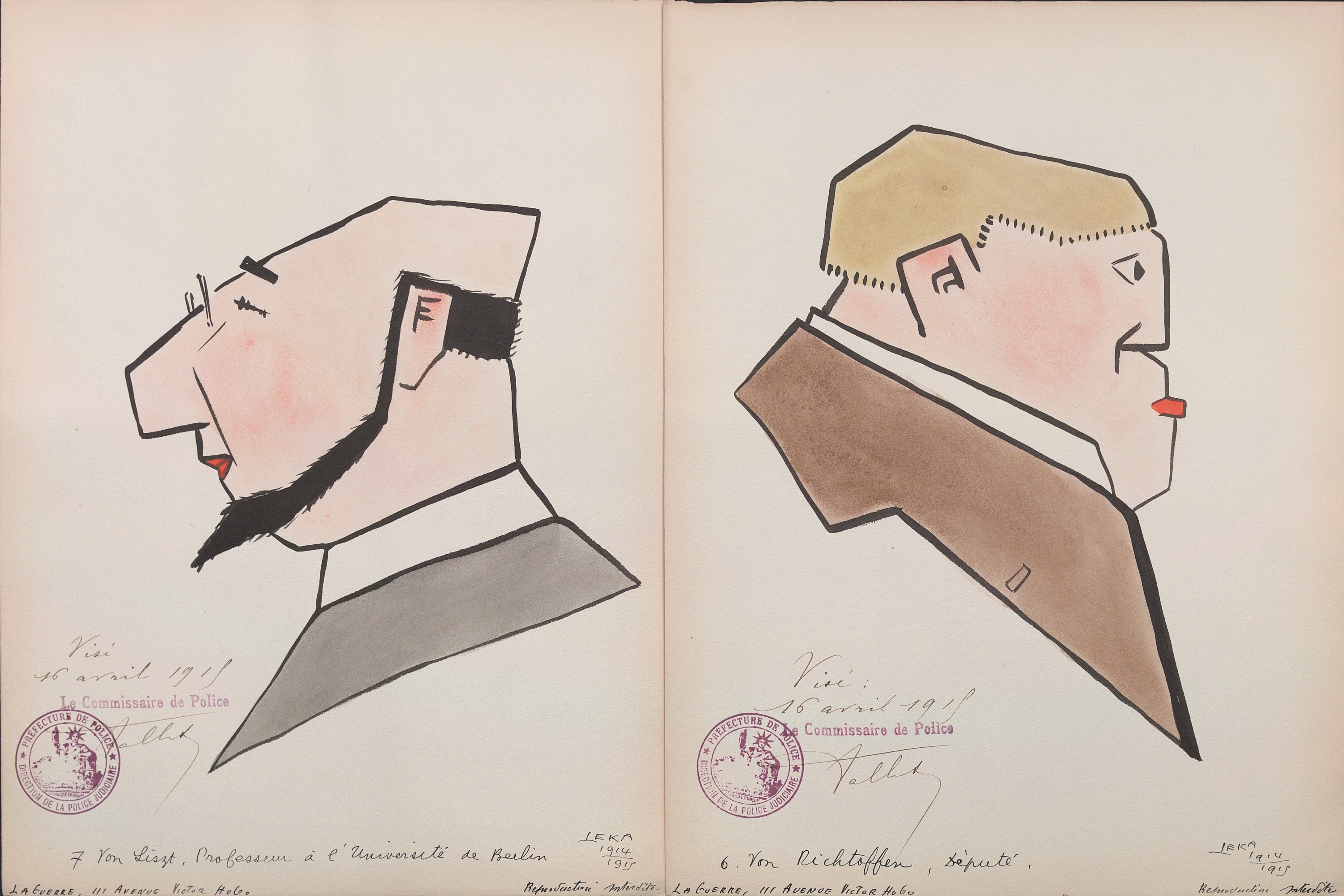 Harry Leka, Leurs intellektuels kubistés par Leka, 16 portraits caricaturés, encre et aquarelle, signés, datés 1914-1915, légendés, chacun portant le visa du commissaire de police de Paris du 16 avril 1915, 31,5 x 23,5 cm ; portraits cubistes de personnalités allemandes ;