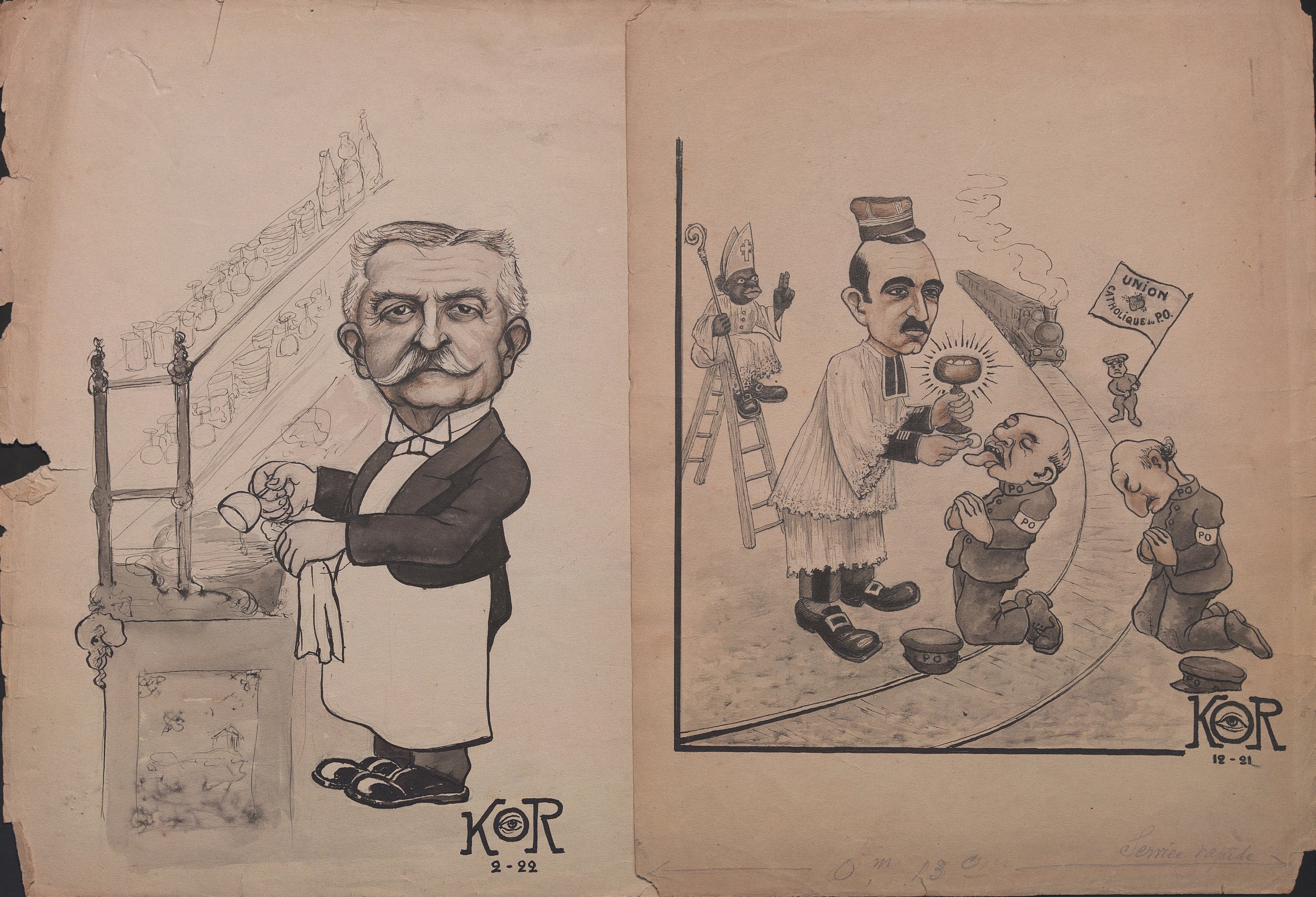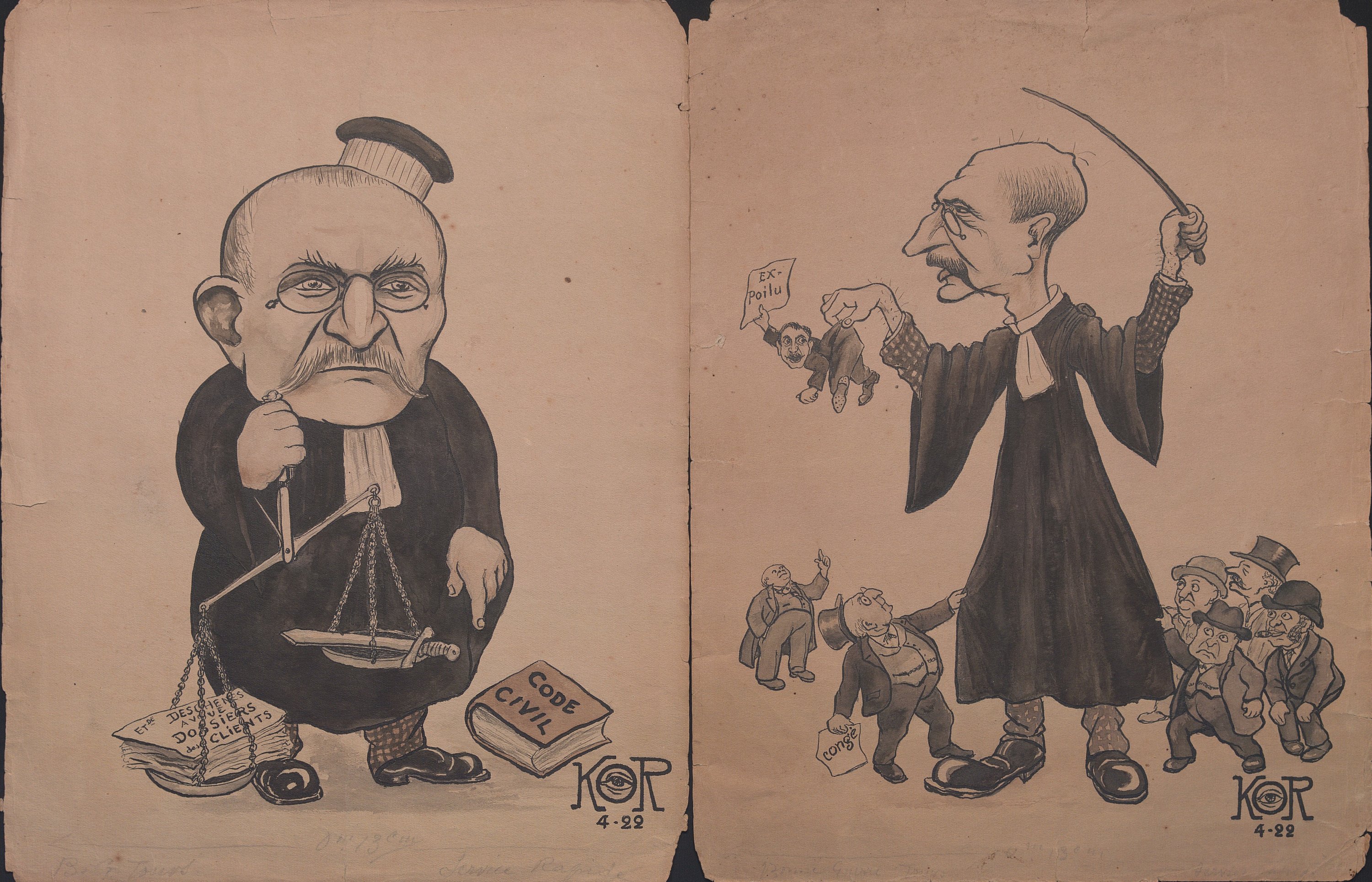 5 épreuves originales sur papier, signées et datées, entre décembre 1921 et avril 1922, scènes satiriques pour la presse finement réalisées sur le thème de la justice, la Compagnie du chemin de fer Paris-Orléans (PO), Philippe duc d’Orléans prétendant orléaniste au trône de France, etc, 33 x 25 cm (petits accdts).