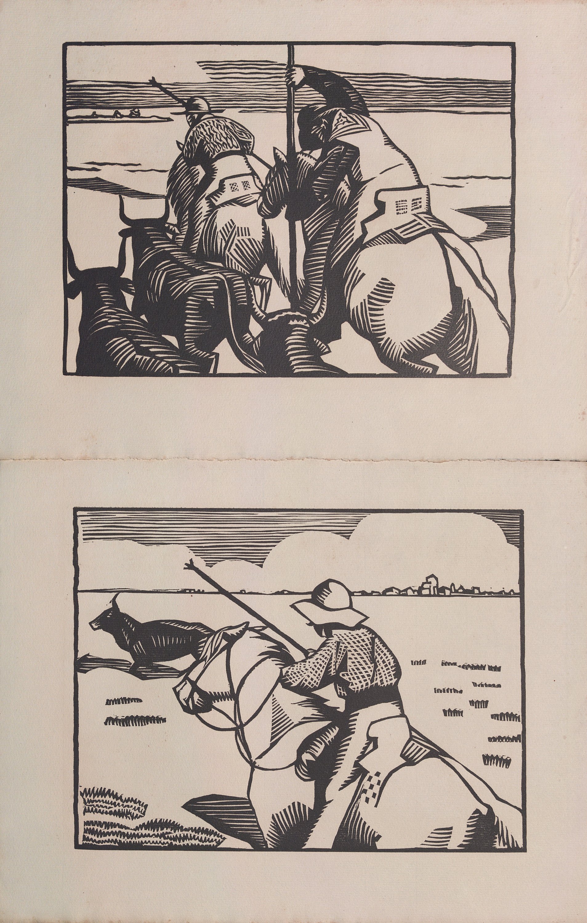 8 scènes sur le thème de la Camargue gravées sur papier épais : taureaux, gardians et tauromachie, vers 1930, env. 25 x 32 cm. Hermann-Paul s’installa à la fin de sa vie aux Saintes-Maries-de-la-Mer, retrouvant ses racines provençales et son amour pour la Camargue, auprès de ses amis manadiers le poète Joseph d’Arbaud et l’écrivain Folco de Baroncelli-Javon ;