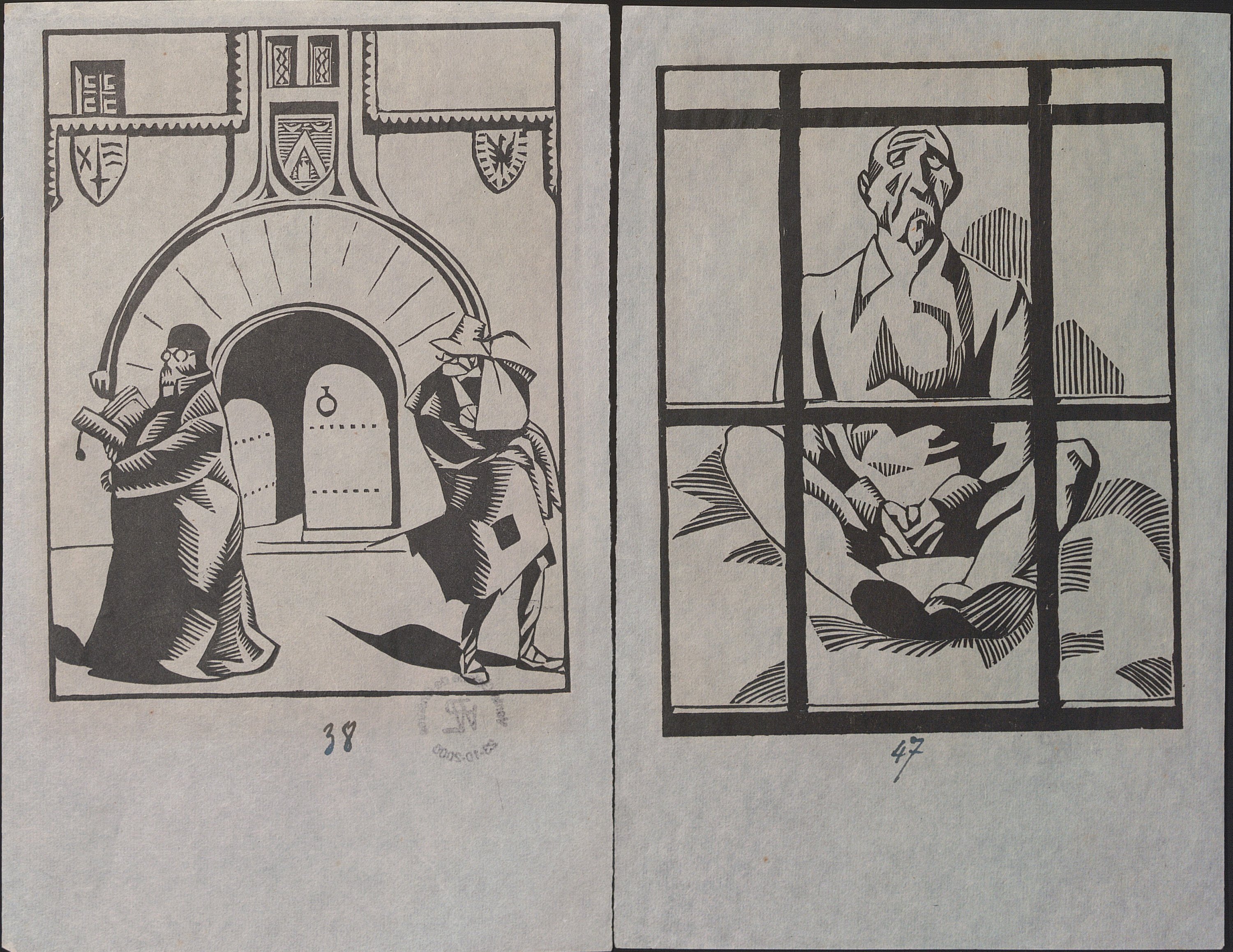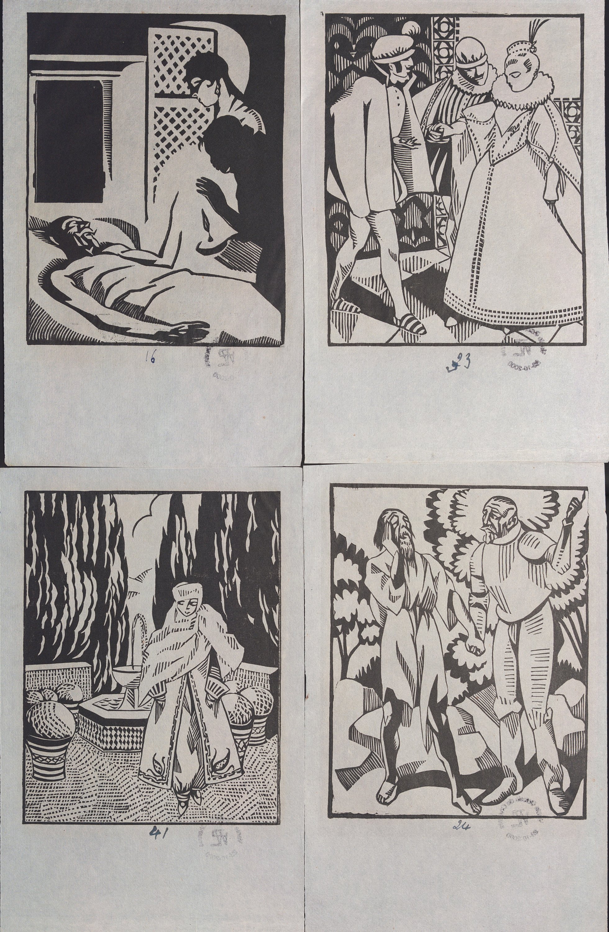 7 scènes gravées sur papier fin, dont certaines tirées de la série de Don Quichotte, parue en 1932, portant au dos cachet de la vente à la Galerie de Chartres du 23-10-2000, 25,5 x 16 cm ;