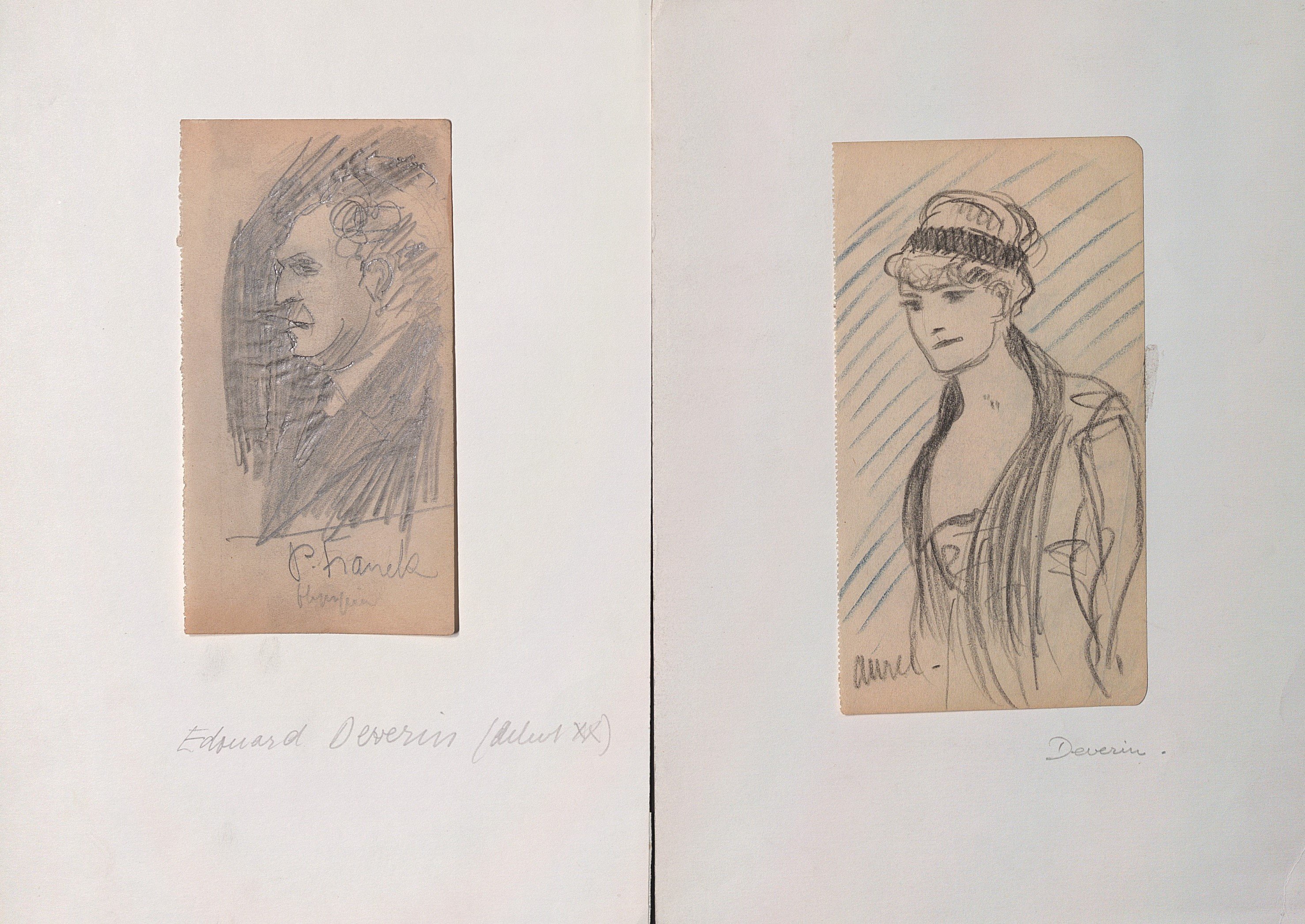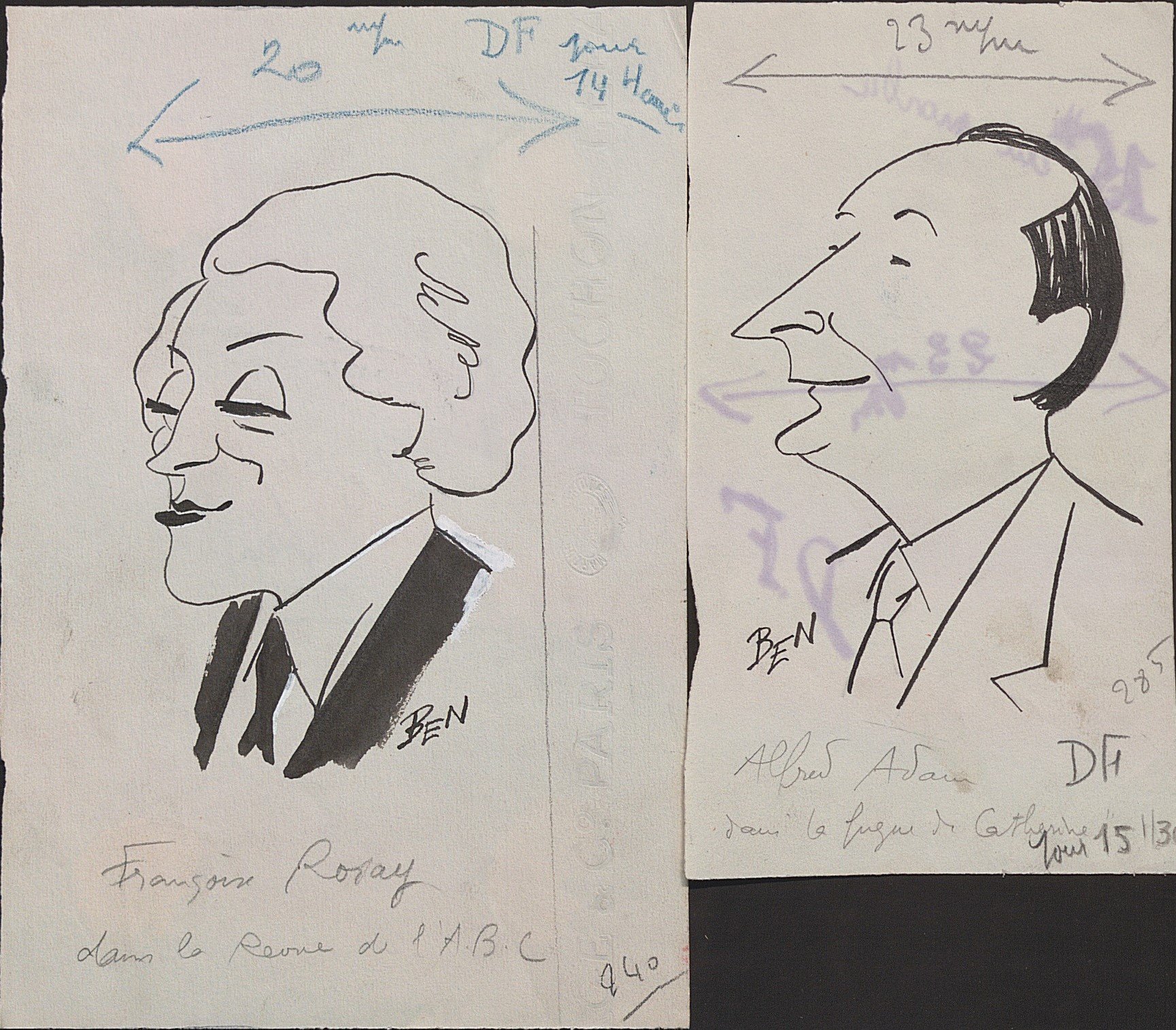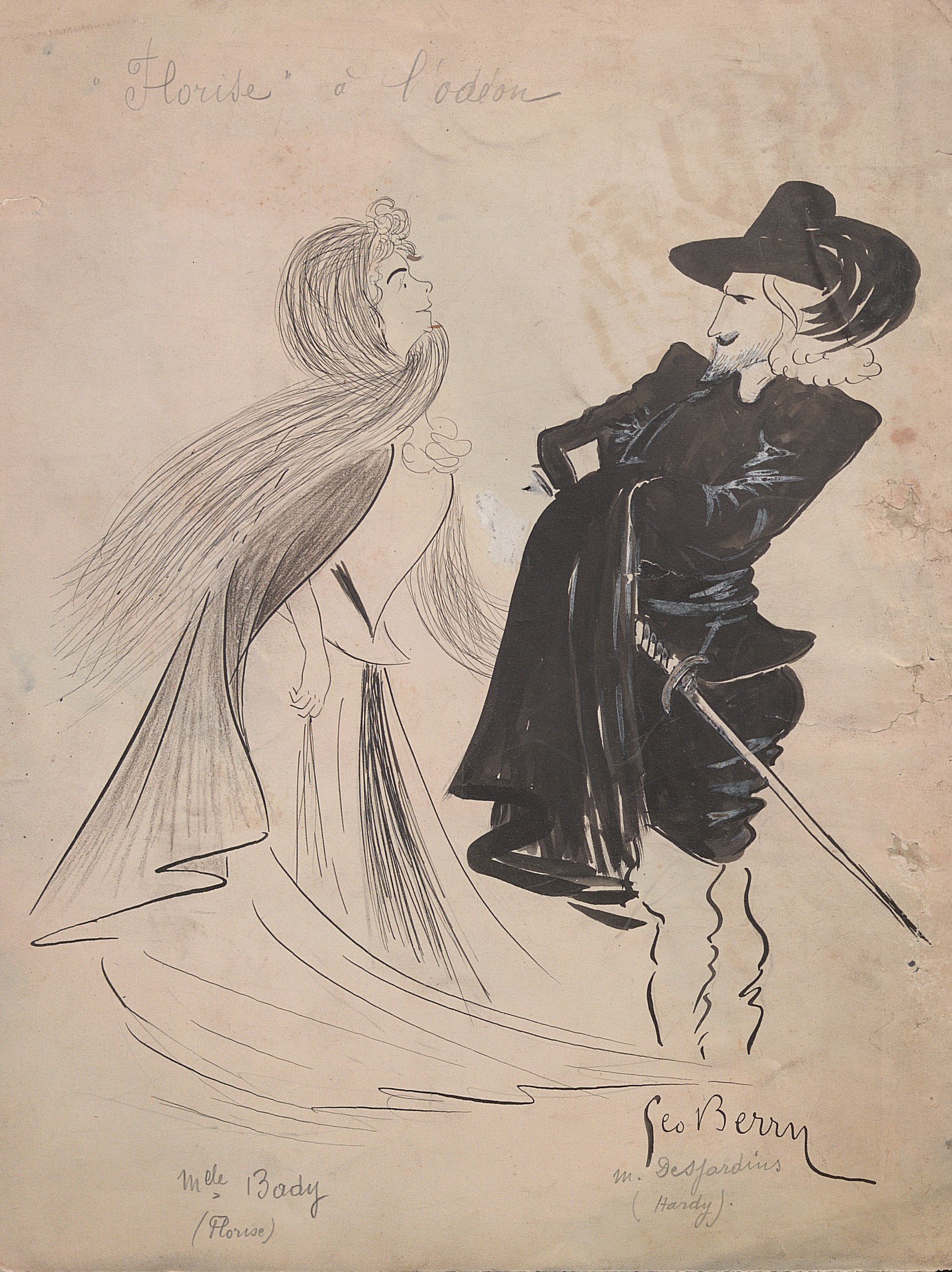 Louis Borgex (1873-1959), Cécile Sorel rôle d’Elmire dans Tartuffe, croquis pris à Londres le 28 mai 1924, encre, 22,5 x 17,5 cm, pour « Coemedia » ; Attr. à Bernhard Becan, Acrobates, encre, 23,5 x 15,5 cm ; Pierre Payen (1902-1944), 2 portraits à l’encre signés : Pauline Benda dite Madame Simone (1935), et Jean Giraudoux (1936) ; George Berry, 4 portraits à l’encre signés dont Sem le caricaturiste, Berthe Bady et Desjardins dans la comédie de Théodore Banville « Florise » jouée en 1907 ; Attr. à Edouard Deverin (1881-1946), 2 portraits au crayon dont Paul Franck comédien ; Attr. à Maurice Lourdey (1860-1934), 2 dessins à l’encre et fusain ;