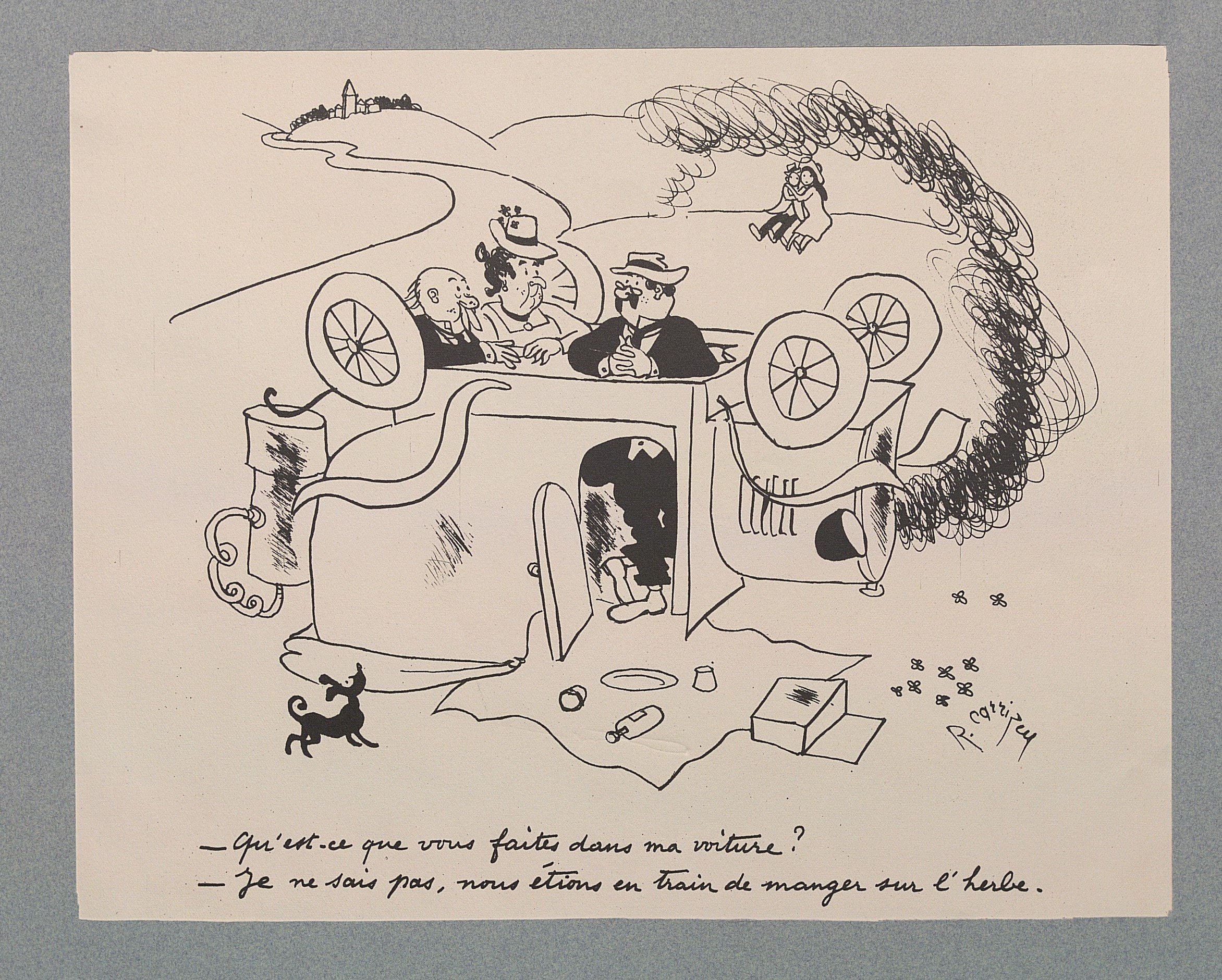 Pardon, la zone des armées SVP, légendé au crayon ; L’accident de voiture, légendé à l’encre ; L’orchestre symphonique, légendé à l’encre ; Le dialogue de sourd, légendé à l’encre ; Le bûcheron, légendé à l’encre.