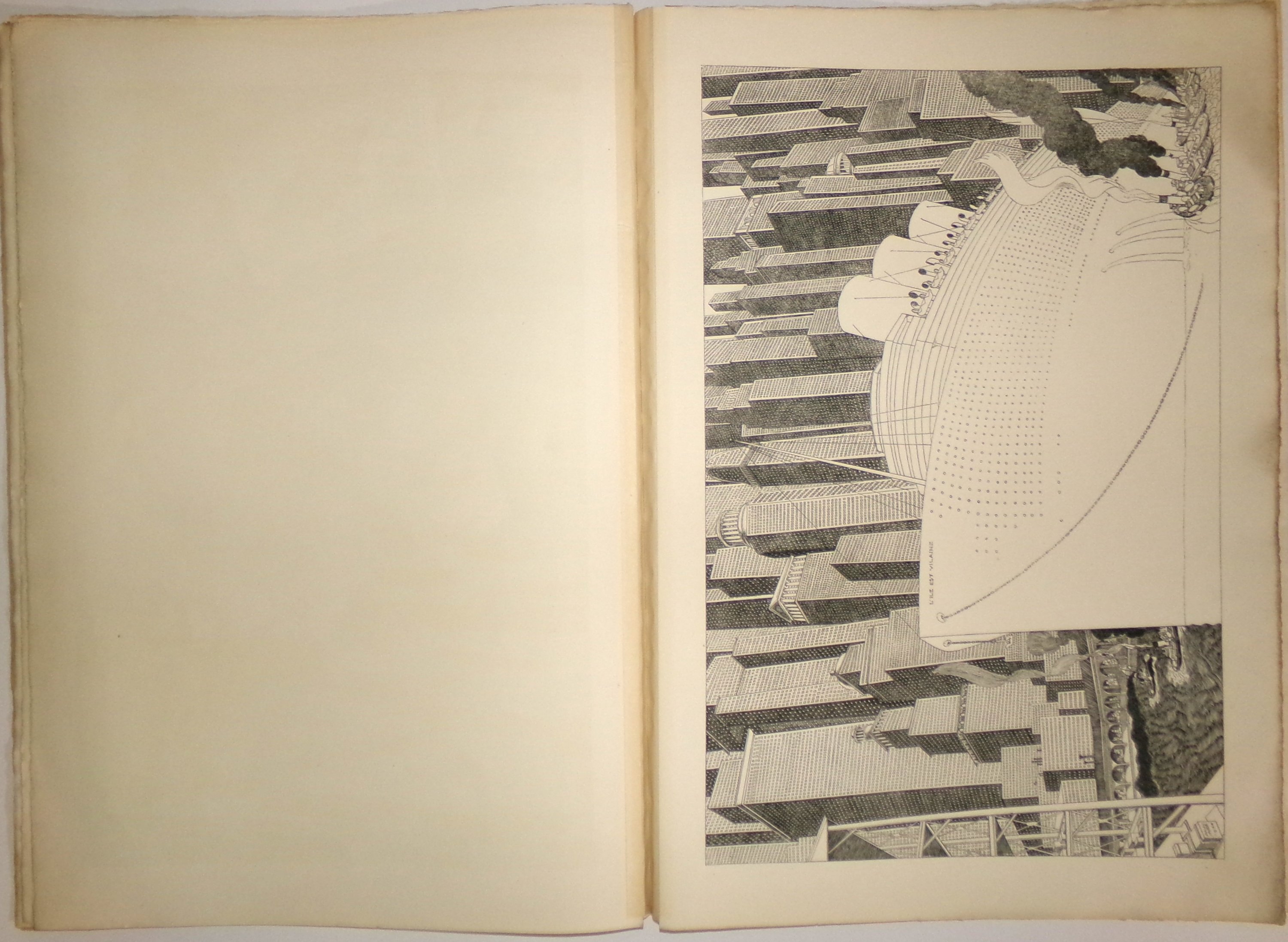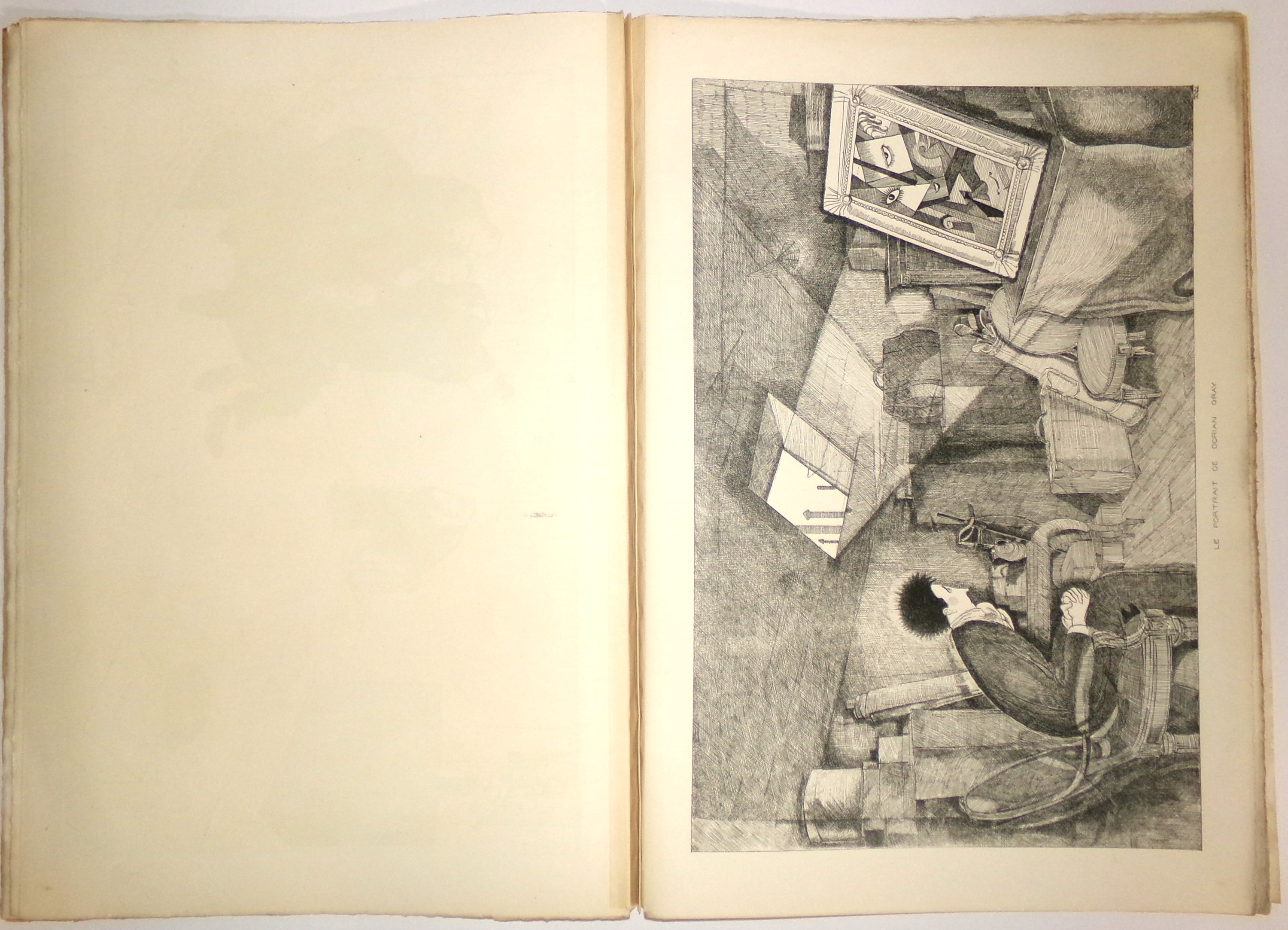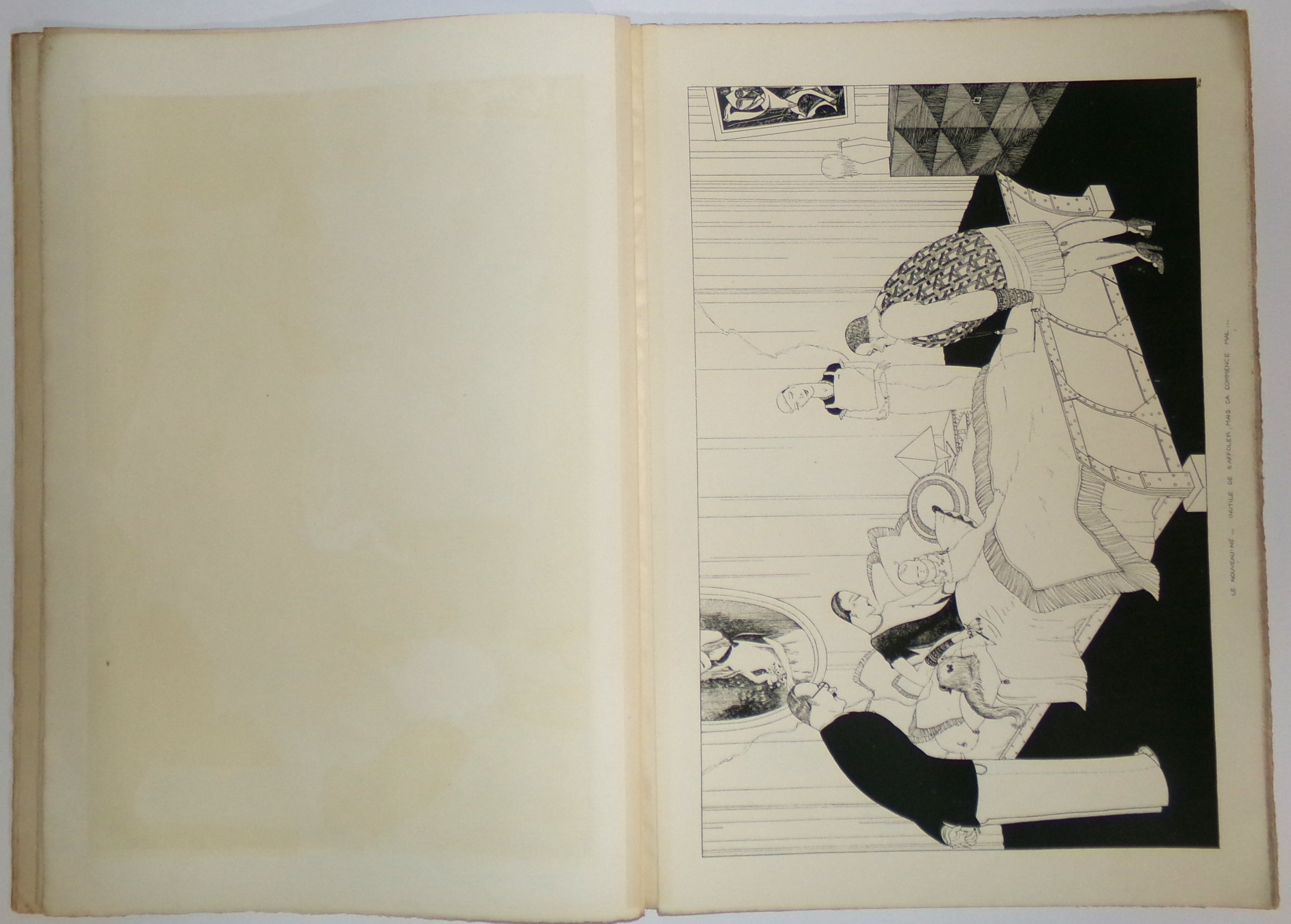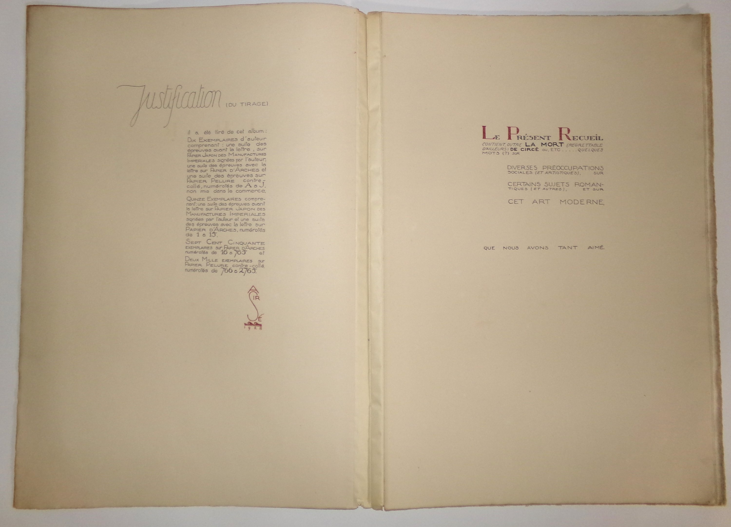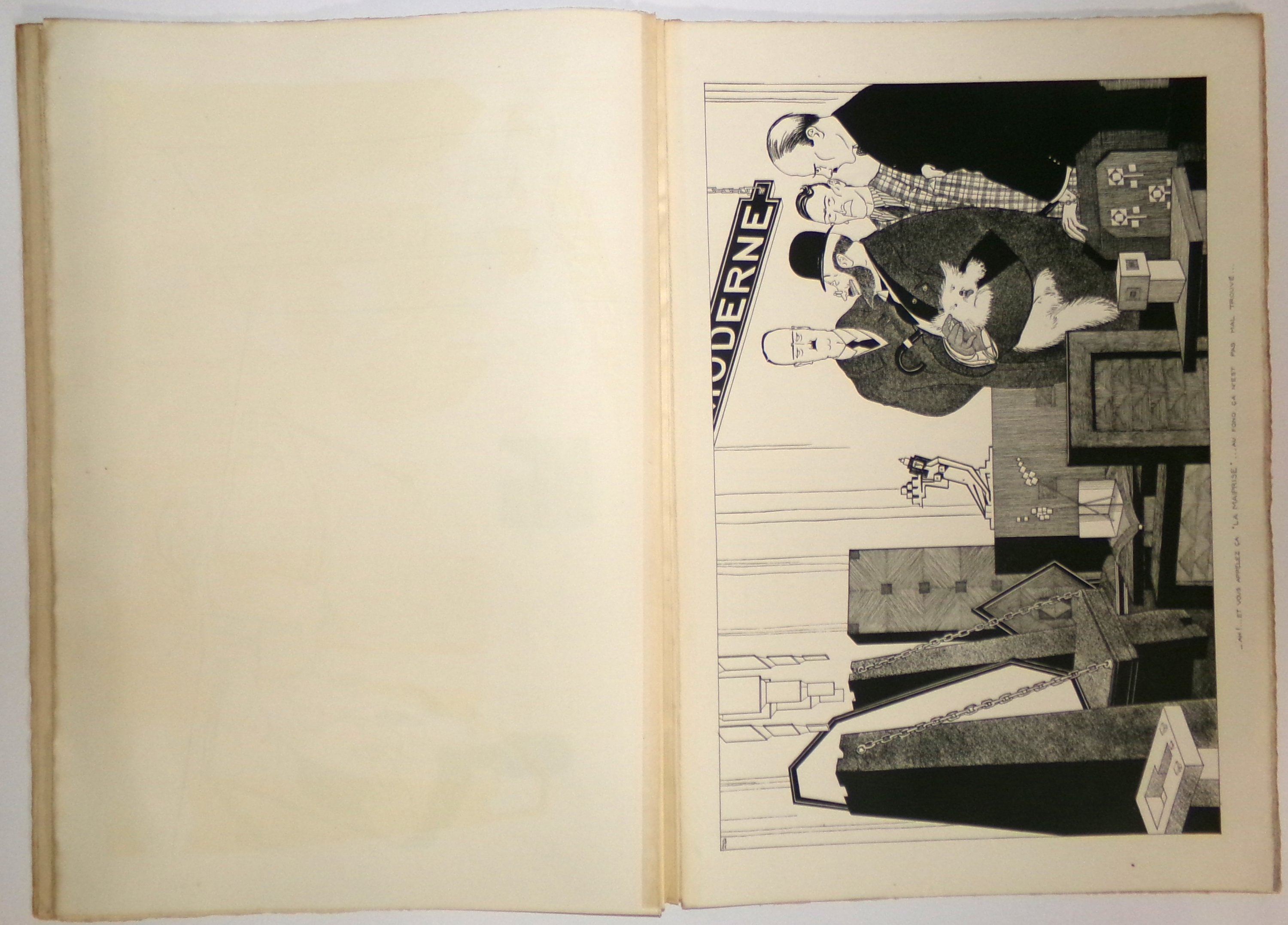Grand in-folio, broch., [3]ff., 12 planches en noir, l'ensemble monté sur onglets, couverture imprimée de l'éditeur (dos factice, couverture salie), bel exemplaire (intérieur propre). Un des 750 exemplaires avec les illustrations sur papier d’Arches, non numéroté. Surprenant ouvrage qui comporte plusieurs critiques de la part de l'illustrateur Paul Iribe (1883-1935) : charge contre le cubisme, manifeste dès la première planche qui figure la mort de la magicienne Circé, qui avait métamorphosé les compagnons d'Ulysse en pourceaux. " Circé incarne pour Iribe la ligne courbe et l'esthétique fin-de-siècle au sein de laquelle il fit oeuvre, le cochon l'expansion déraisonnée de la géométrie et du cubisme qu'il abhorre" ; l'album est par ailleurs dédié " A Sircé ". Réalisé au retour des Etats-Unis, La mort de Circé sonne également le glas de l'aventure hollywoodienne et de la collaboration avec le réalisateur Cecil B. DeMille ; Iribe démontre son ressentiment à l'égard des américains et mais également, tel Ulysse qui rentre de son Odyssée malheureuse, à bord du paquebot " l'Ile est Vilaine "- comprendre Manhattan - envers sa Pénélope qu'il retrouve endorm ie auprès de son amant. (Paul Iribe, précurseur de l'art déco, Mairie de Paris, Bibliothèque Fornay, Hôtel de Sens, 1983, n° 265. Mythes de la décadence sous la direction d'Alain Montandaon, PU Blaise Pascal, 2001, pp. 119-120).