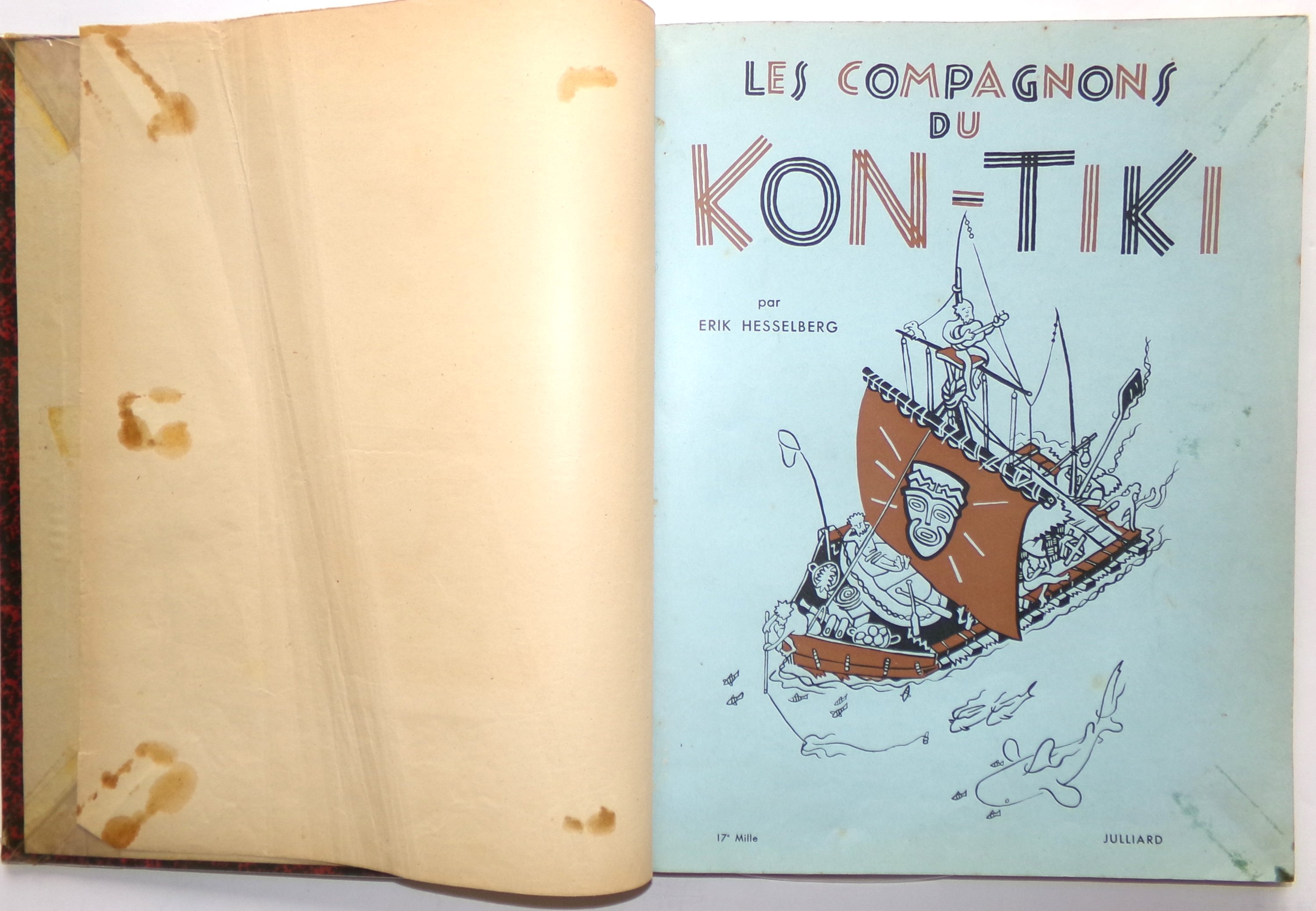 Hesselberg Erik, ?Les compagnons du Kon-Tiki. Julliard, 1951. Grand in-4 br. Illustré à toutes pages par l'auteur-navigateur, qui participa à l'expédition (et qui a dessiné le visage du dieu Kon-Tiki sur la voile du radeau). Récit illustré de ce périple sur un radeau, par laquelle l'anthropologue norvégien Thor Heyerdahl voulait vérifier l'hypothèse de l'exploration inca de l'océan Pacifique ;