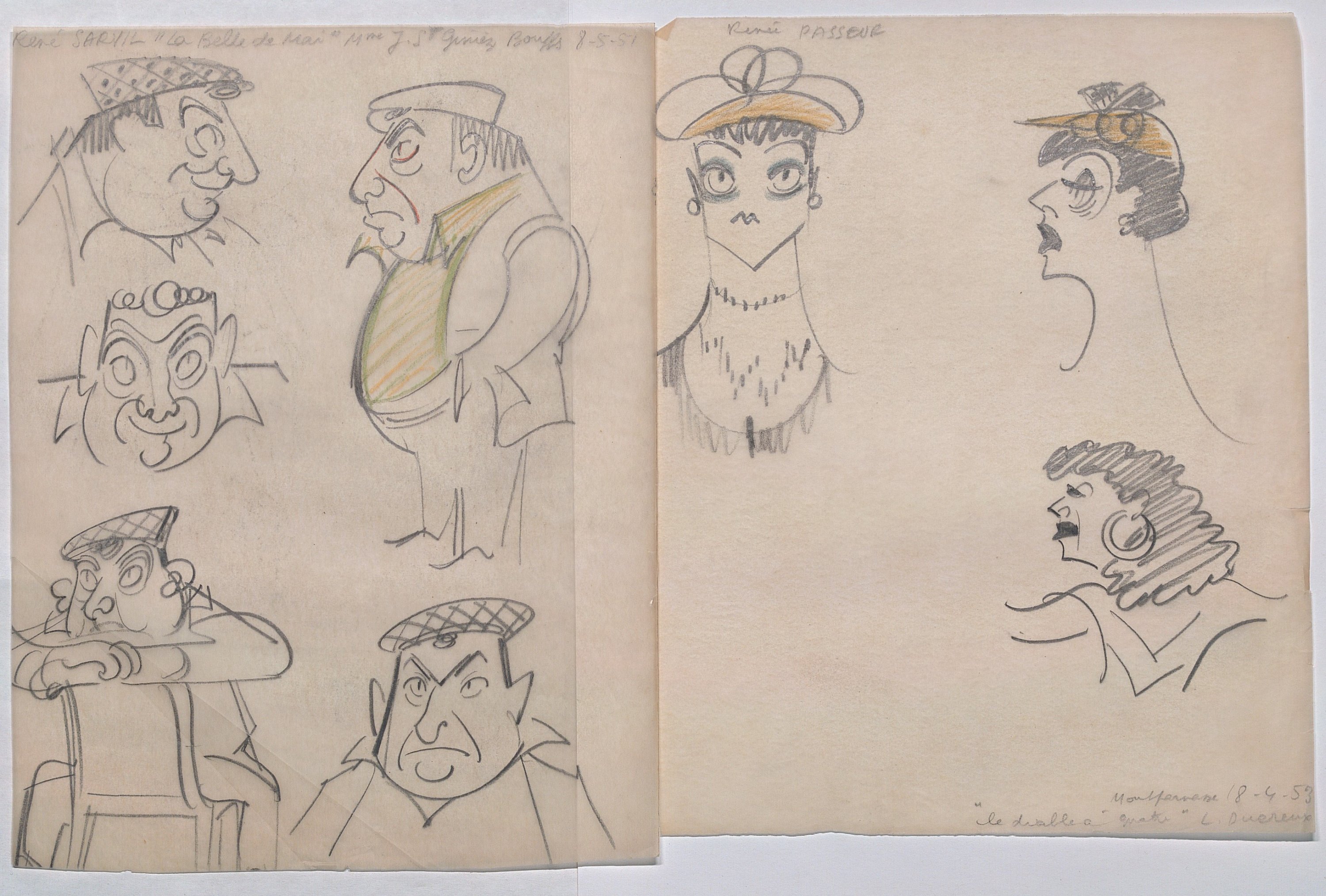 Réunion d’env. 175 calques, env. 30 x 21 cm, sur lesquels sont reproduits au crayon, certains à rehauts de couleurs, de multiples portraits caricaturés de personnalités majoritairement issues du monde du théâtre et du monde politique, années 1940-1970, légendés et datés. Ce rare ensemble de dessins pourrait être attribué à Luc Vincent, connu pour ses nombreux caricaturés du monde du spectacle, du sport et de la politique, illustrant de nombreux journaux d’après-guerre.